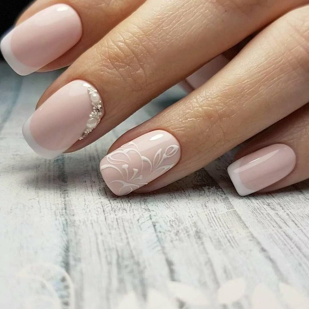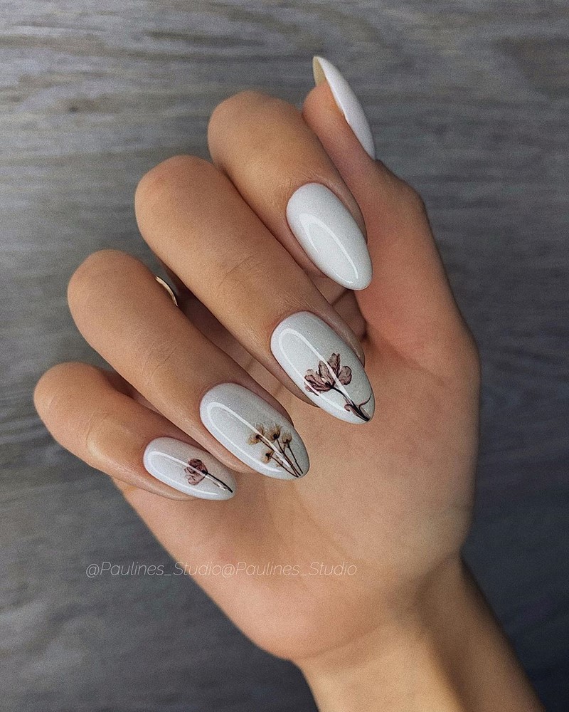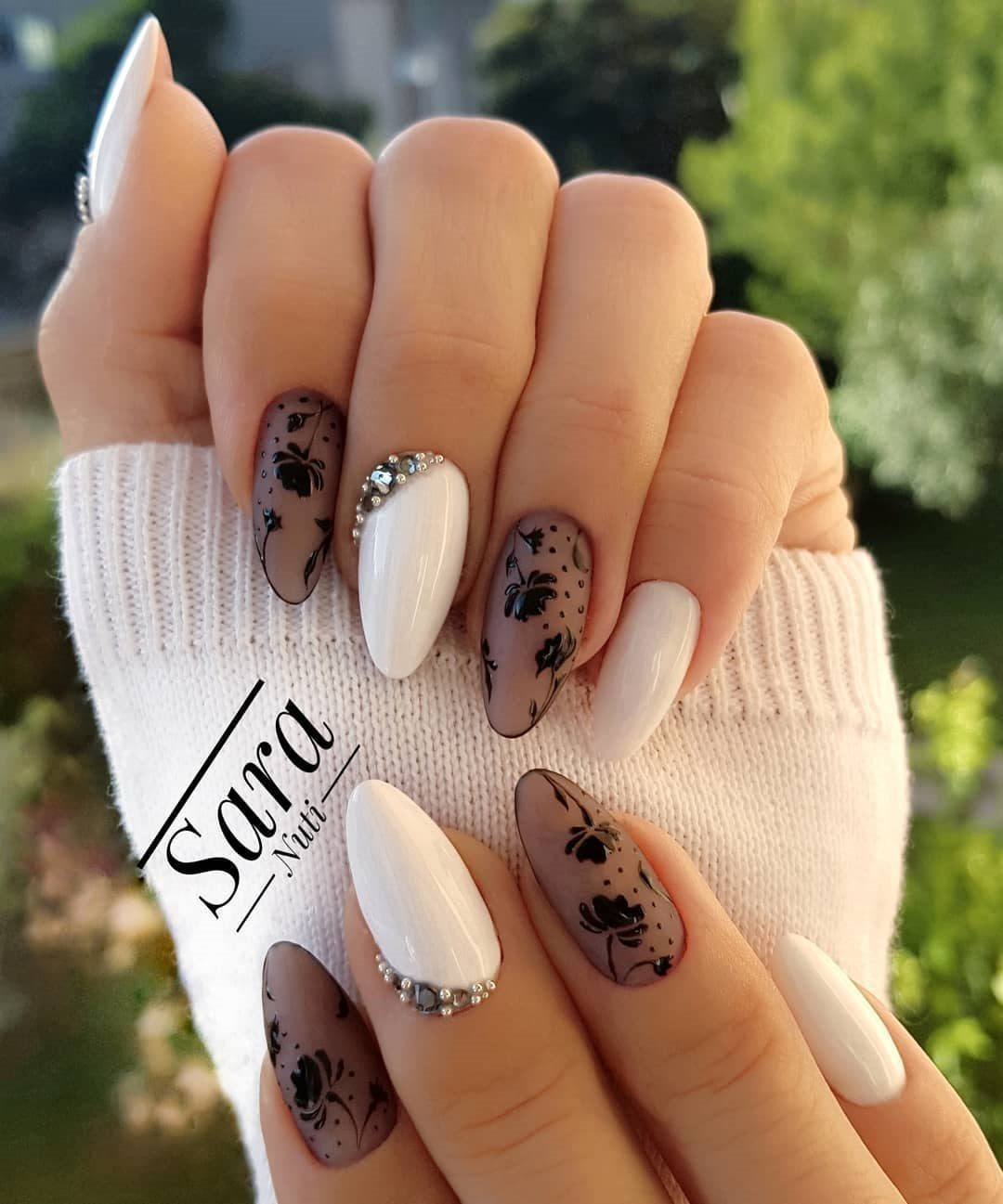 Это отличная база для цветочного маникюра. На белом фоне можно создавать цветы самых разных оттенков. Кстати, такая база способна уравновесить самый активный дизайн. Смело украшайте рисунки стразами, блестками или фольгой. Если белый цвет кажется вам слишком активным, замените его на молочную базу.