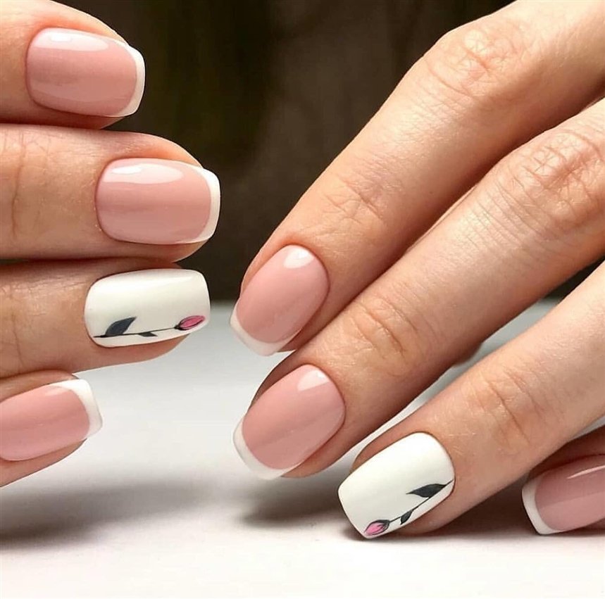 Не хотите рисовать целые поля и букеты на своих ноготках? Обратите внимание на стиль минимализм. Достаточно всего одного небольшого акцента, чтобы дизайн привлекал внимание. Чем больше незаполненного пространства будет на пластине, тем эффектнее смотрится такой маникюр.