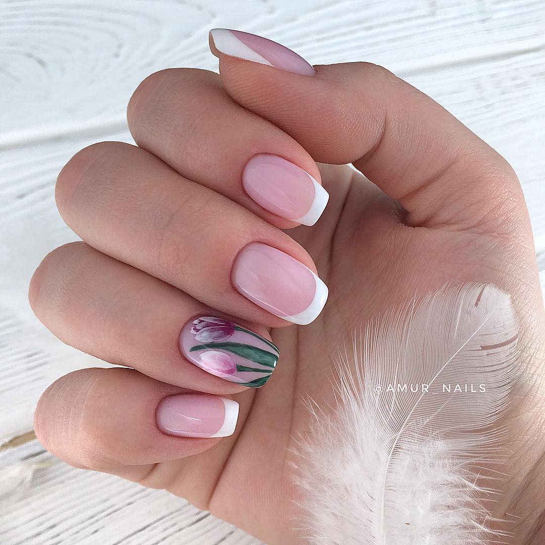 Мы уже привыкли к тому, что френч — классика маникюра. Но современный французский дизайн удивляет новинками каждый сезон. Попробуйте поэкспериментировать именно на базе френча и вы обязательно будете довольны результатом. Вы можете оформить улыбку цветами или просто украсить классический френч растительными элементами.