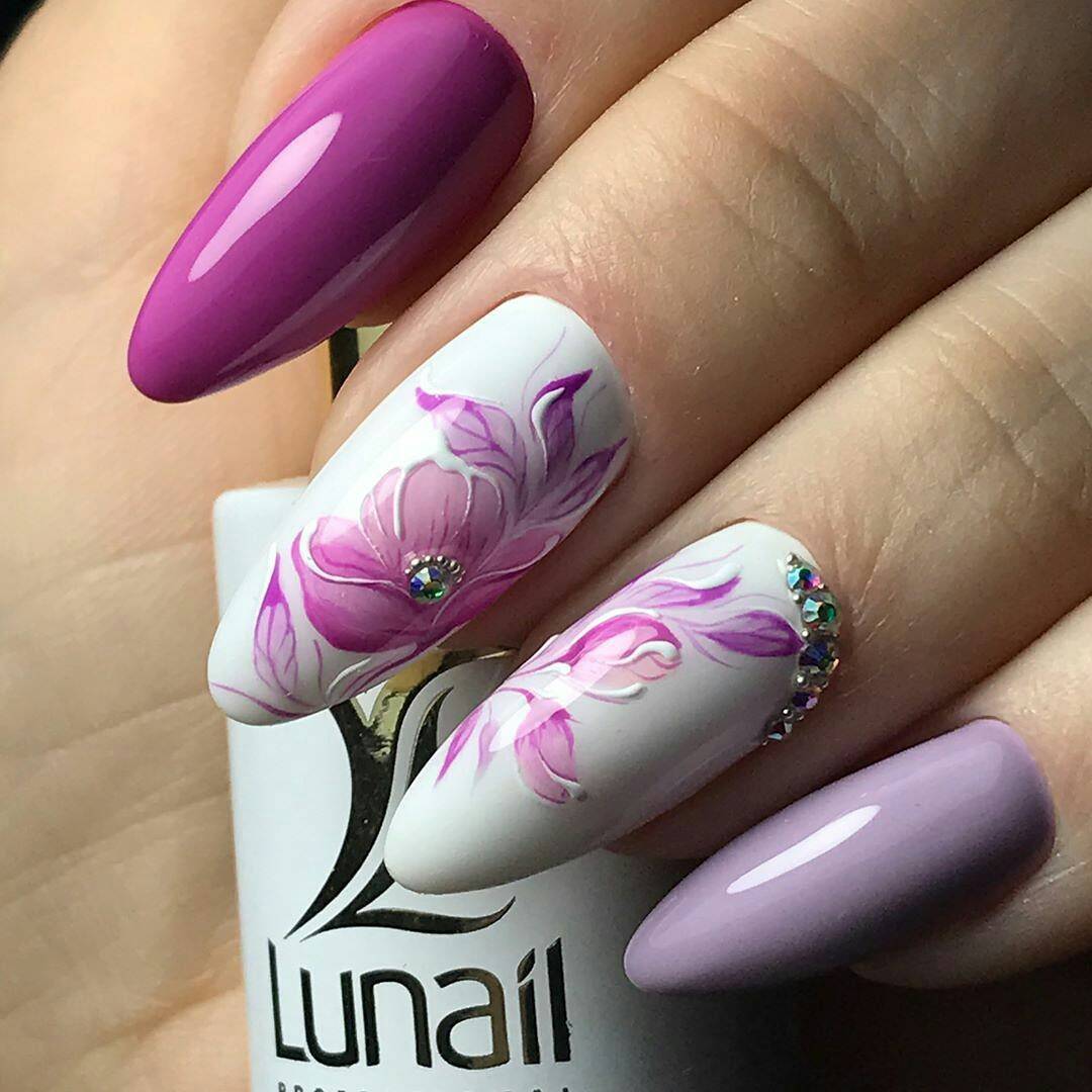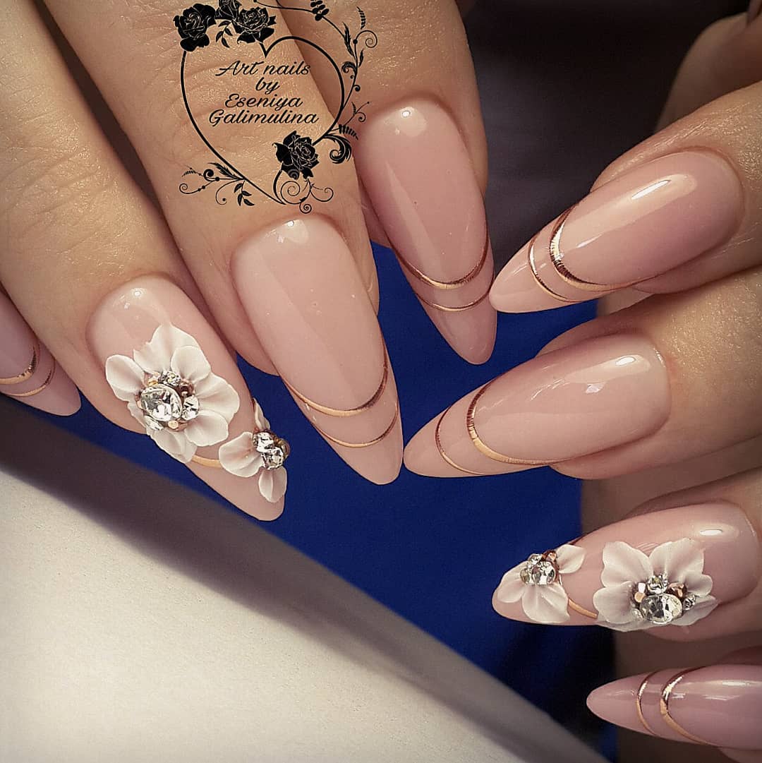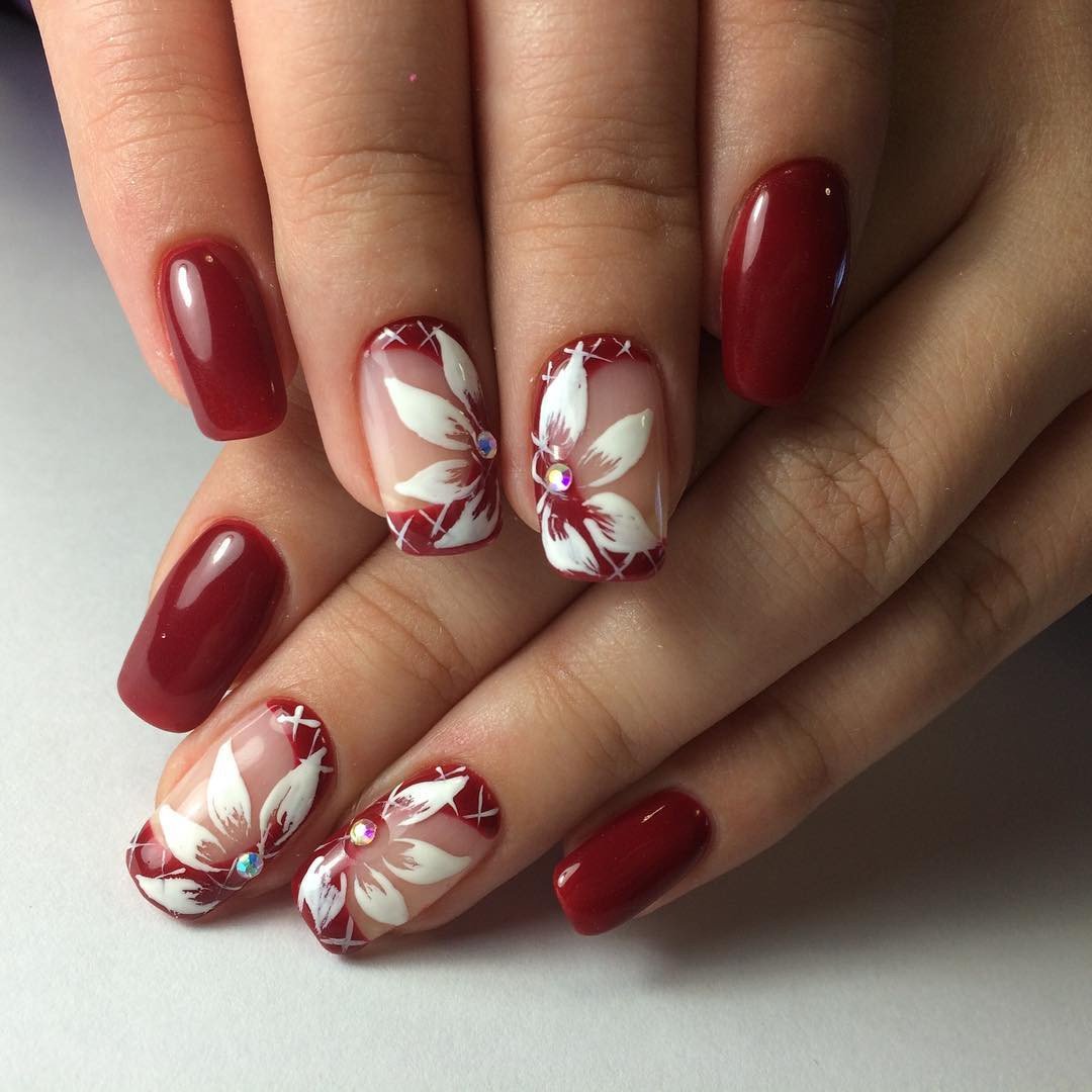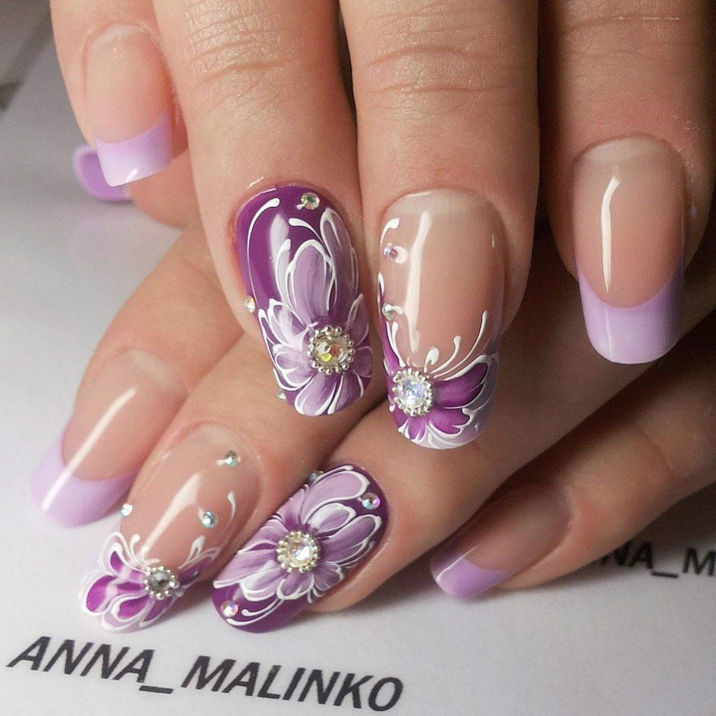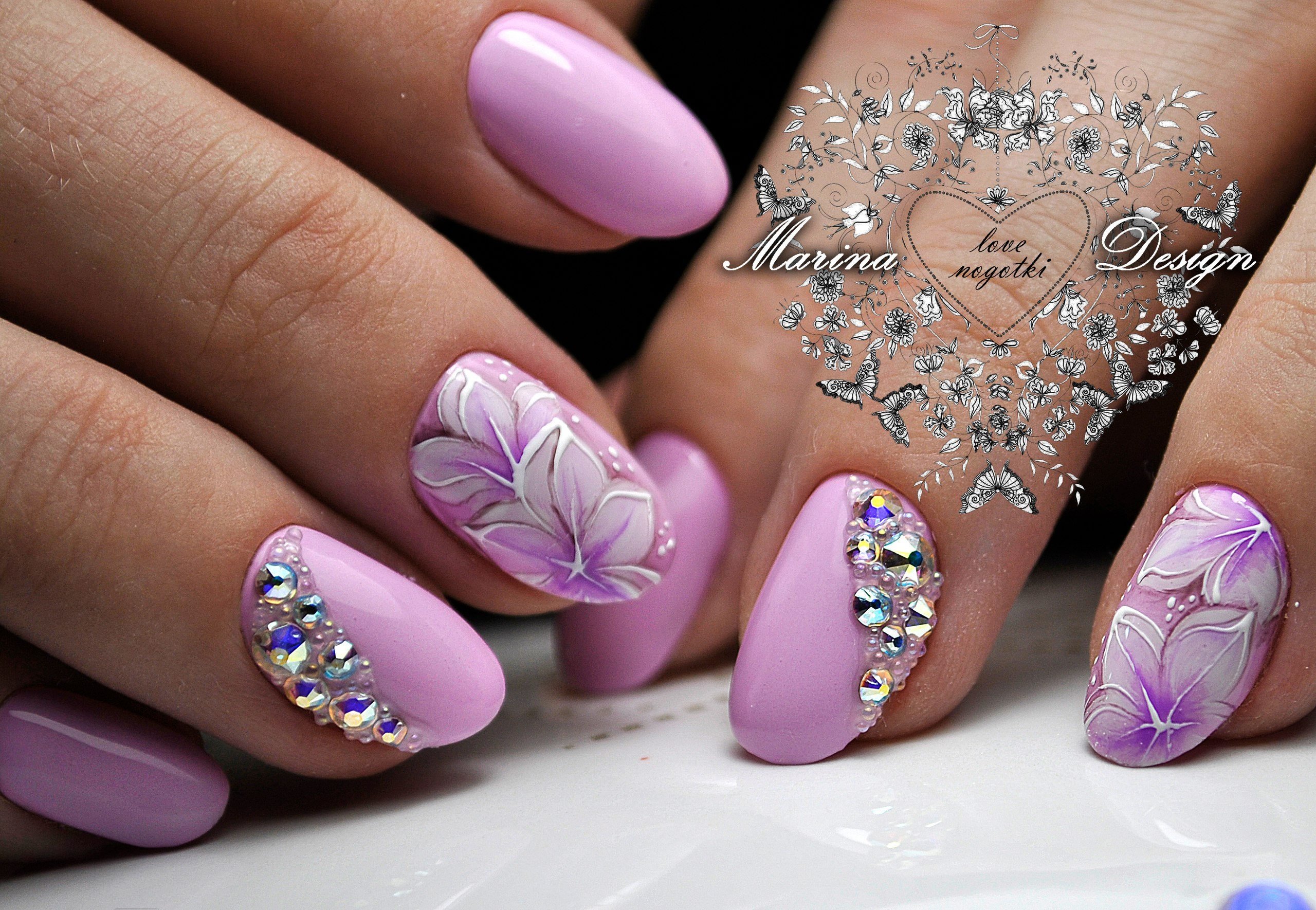 Стразы любого вида помогут подчеркнуть изысканность цветочного дизайна. Вы сразу увидите как преобразится маникюр, если добавить в него всего пару камней. Они могут быть частью цветка. Например, его центром. Или украшать определенную зону на пластине. Например, область лунки. Не стоит забывать — чем ближе к краю пластины, тем меньше размер камней и их количество. В противном случае можно травмировать ноготок.