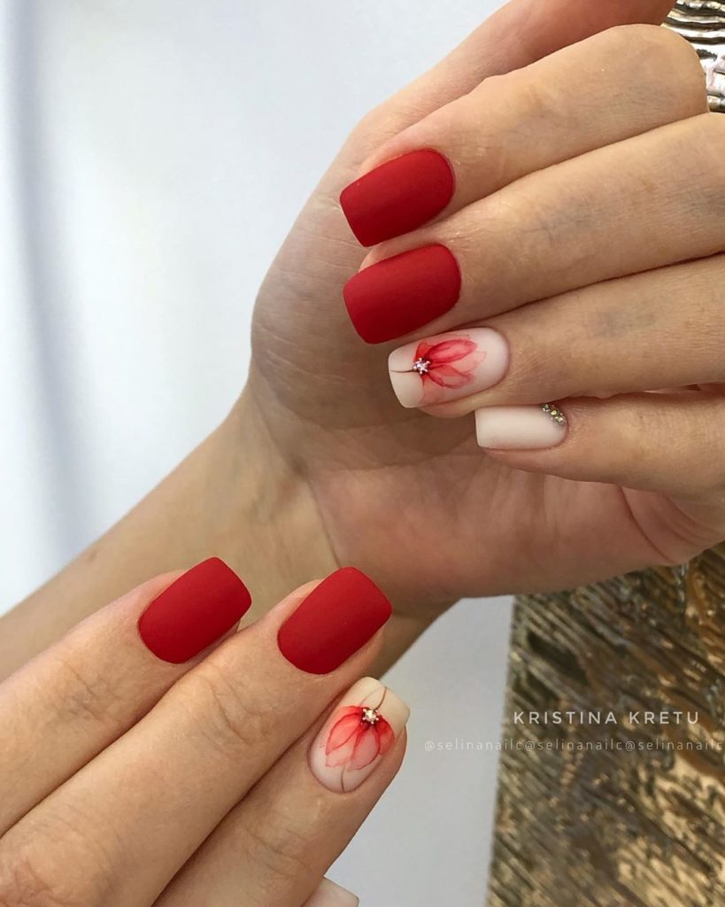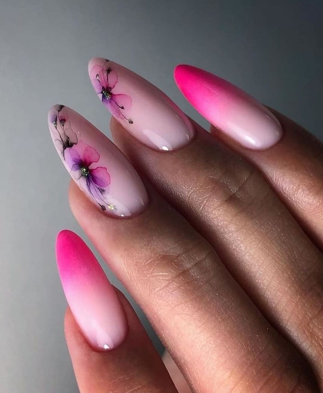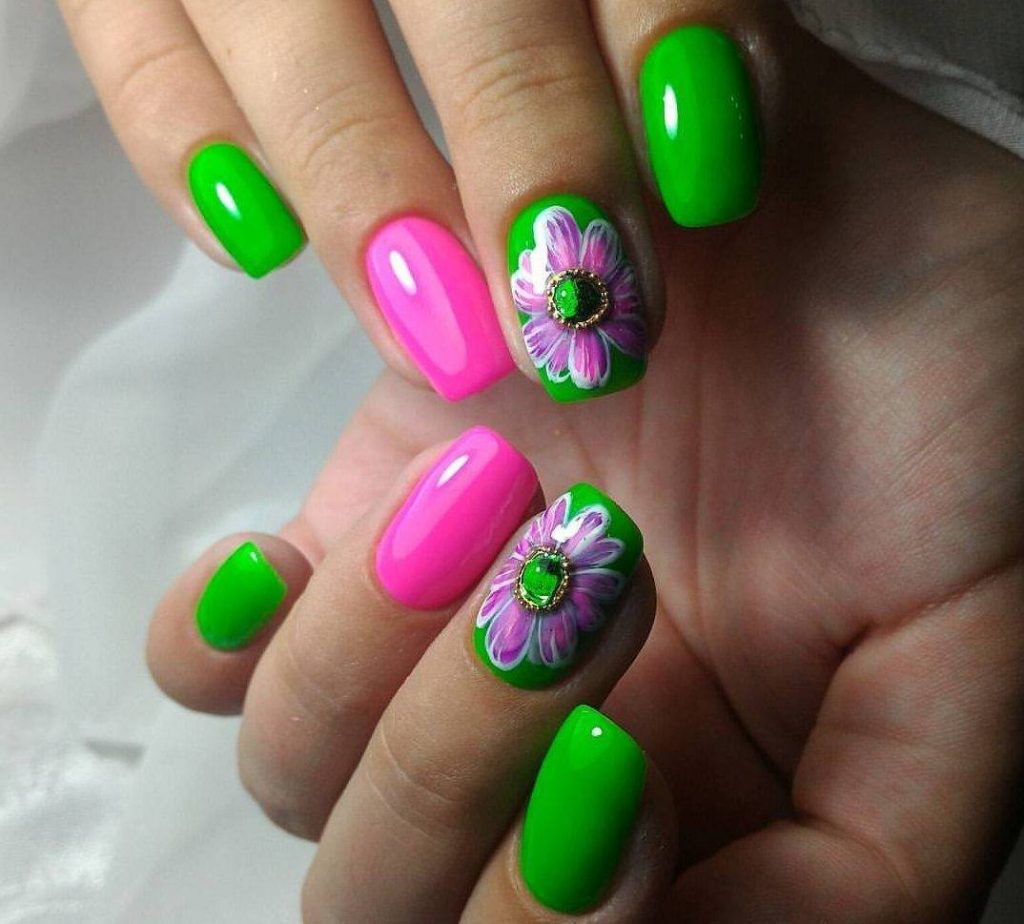 Цветочный маникюр универсален. Он может быть любого оттенка. Как уже отмечалось, мастера нейл-арта рекомендуют выбирать для цветов максимально естественное сочетание цветов. Вдохновляйтесь тем, что дала природа. Тем не менее, каждый сезон в маникюре выделяют несколько оттенков лака, без которых нельзя представить себе модный дизайн.