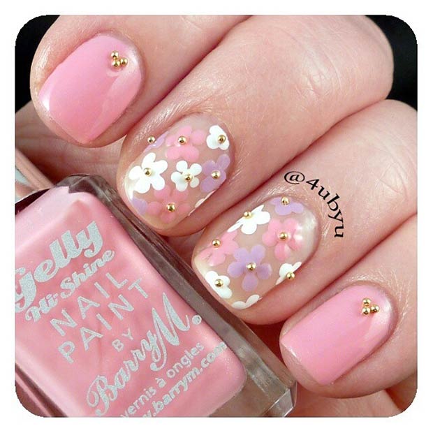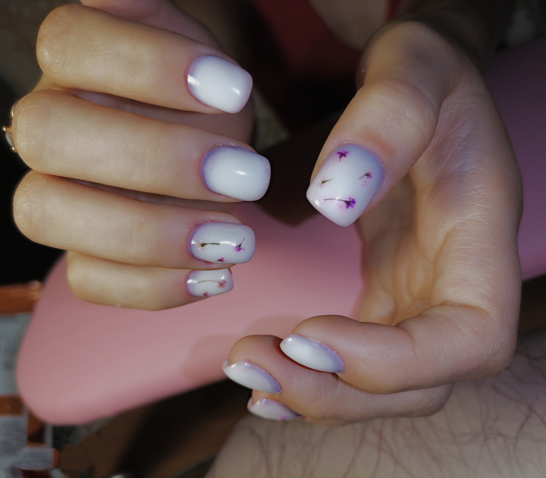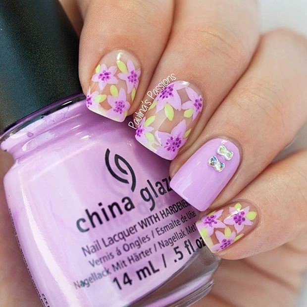 И не забывайте о том, что для цветочного маникюра отлично подходит прозрачная база. Только не забывайте, что пластину необходимо защищать, а базу тщательно высушивать под лампой. Прозрачная основа подходит для активного дизайна с акварелью, стразами, блестками и др.