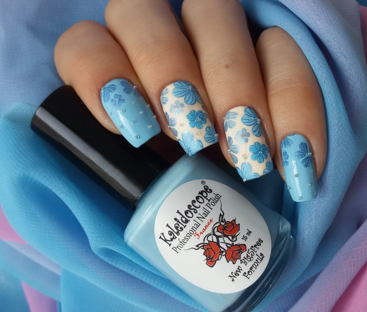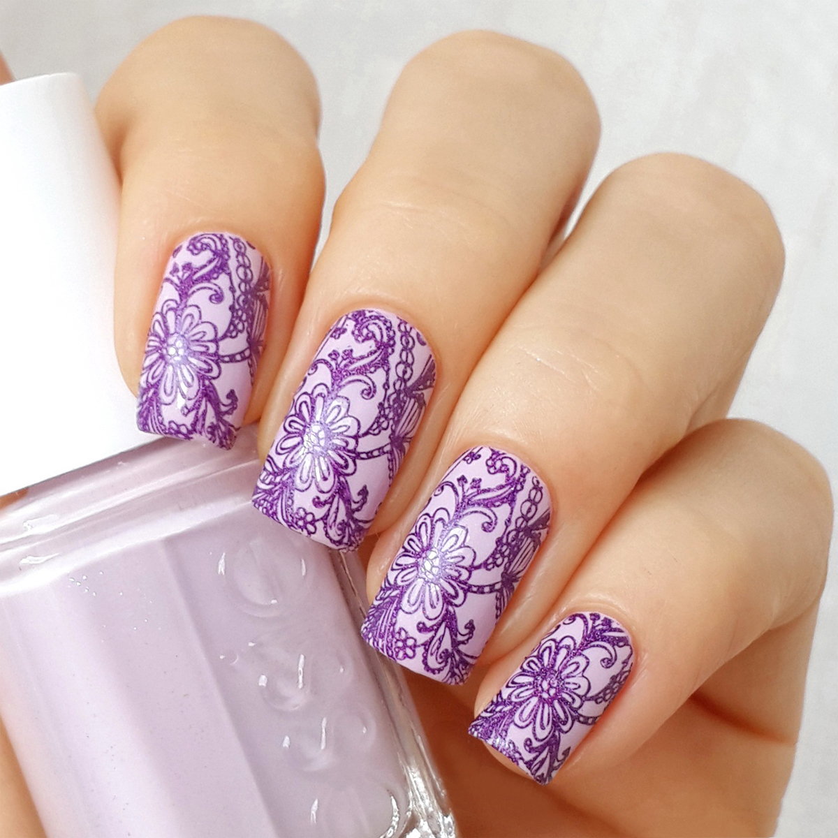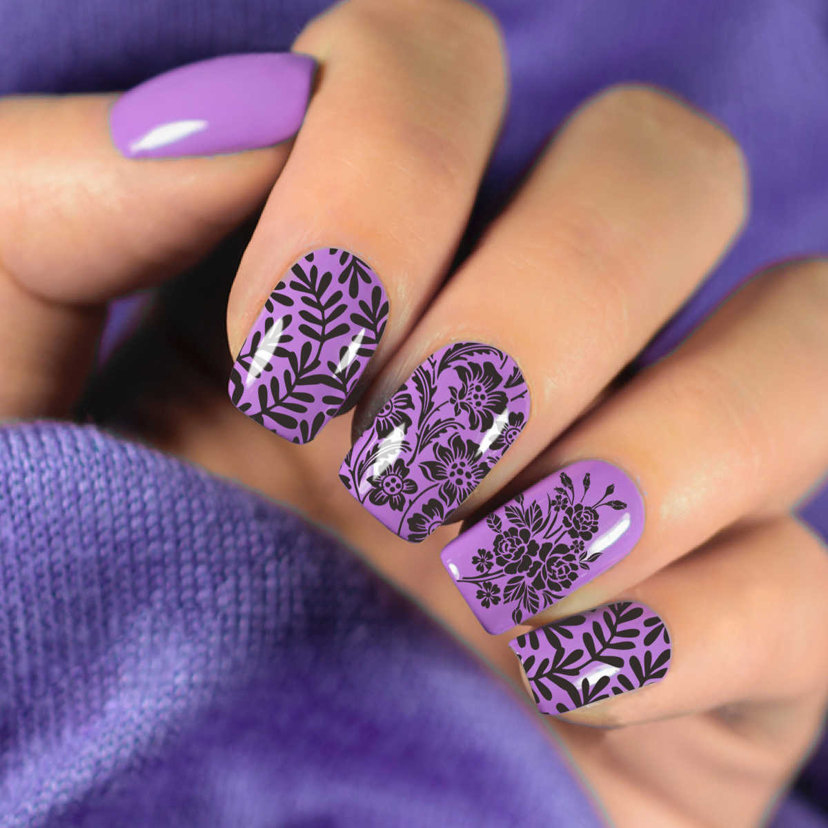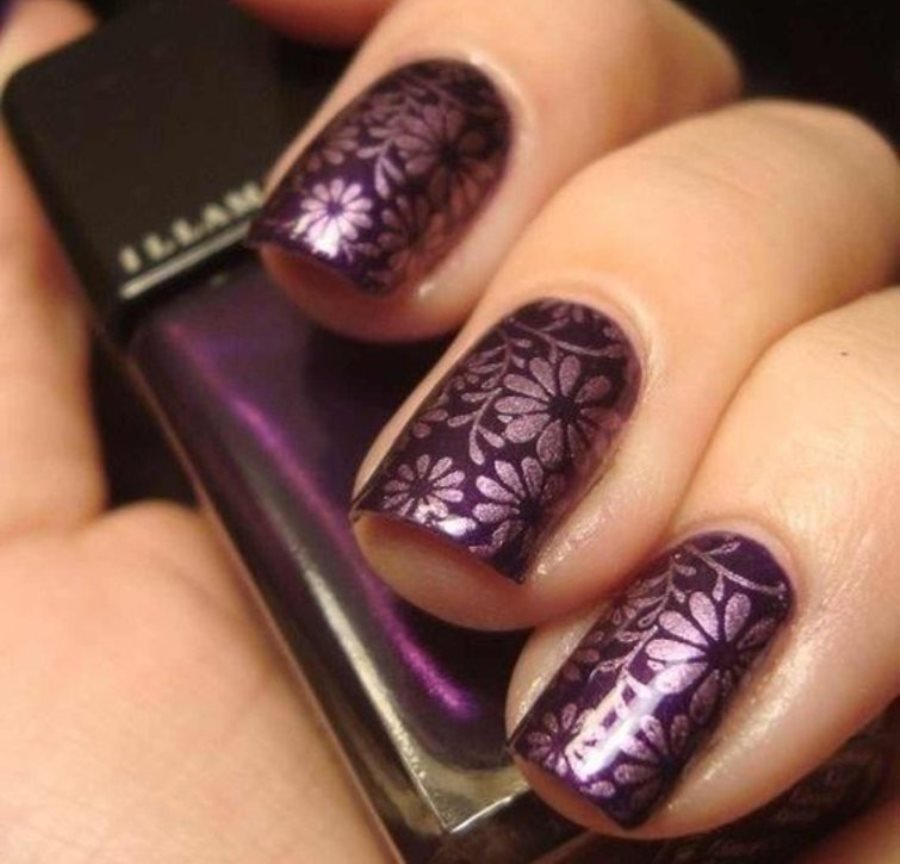 Быстро и просто сделать цветочный маникюр дома можно с помощью стемпинга. Вам понадобятся только гель-лак любимого оттенка, металлическая палетка и резинка. Можно просто нанести рисунок на пластину и составить его просто закрепив финишным топом. Другой вариант — раскрасить или добавить немного блесток, а затем закрепить рисунок топом.