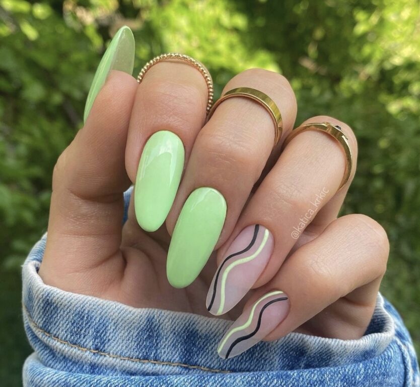 Цвет яркой зелени отлично подойдет для создания нежных волн на ногтях. Оттенок выбирайте, ориентируясь на цветотип кожи, чтобы руки не выглядели синюшными при неправильном выборе оттенка. Зеленый лак отлично подходит под любой образ — от кэжуал до офисного стиля.