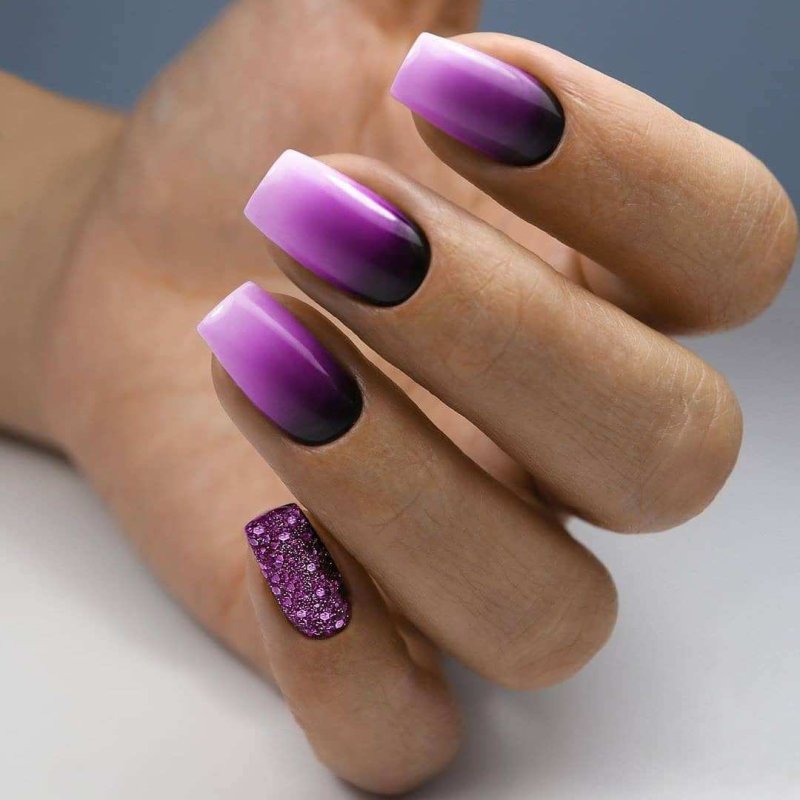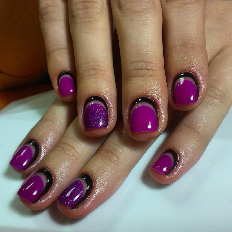 Здесь очень важно подобрать оттенки для дизайна. Главное, чтобы маникюр не был слишком тяжелым и мрачным. Отличный вариант — черно-сиреневый градиент, украшение сиреневой базы хлопьями юкки черного цвета или блестками.