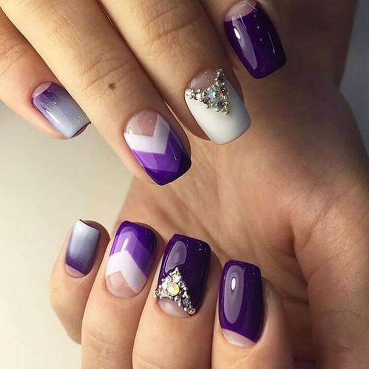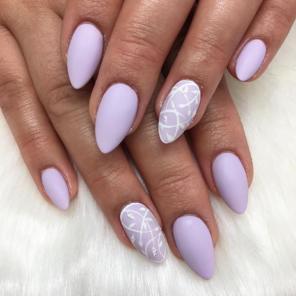 Белый сочетается не абсолютно со всеми тонами сиреневой гаммы. В этот тандем лучше выбирать светлые матовые оттенки фиолетового. Сочетание с белым подойдет для градиента, френча, нежных витиеватых рисунков, геометрии и негативного пространства.