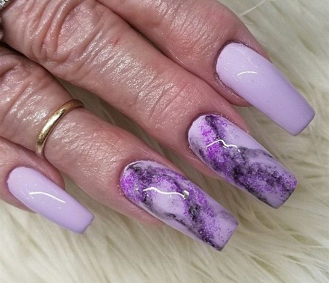 Текстура мрамора на ногтях уже давно стала трендом каждого сезона. Мастера нейл арта воплощают на ногтях дизайны, которые очень похожи на настоящий мрамор. Если хочется чего-то необычного и яркого, выбирайте фиолетовый мраморный дизайн. Столь интенсивный декор лучше немного обуздать и оформить в таком стиле один или два пальчика на руке.