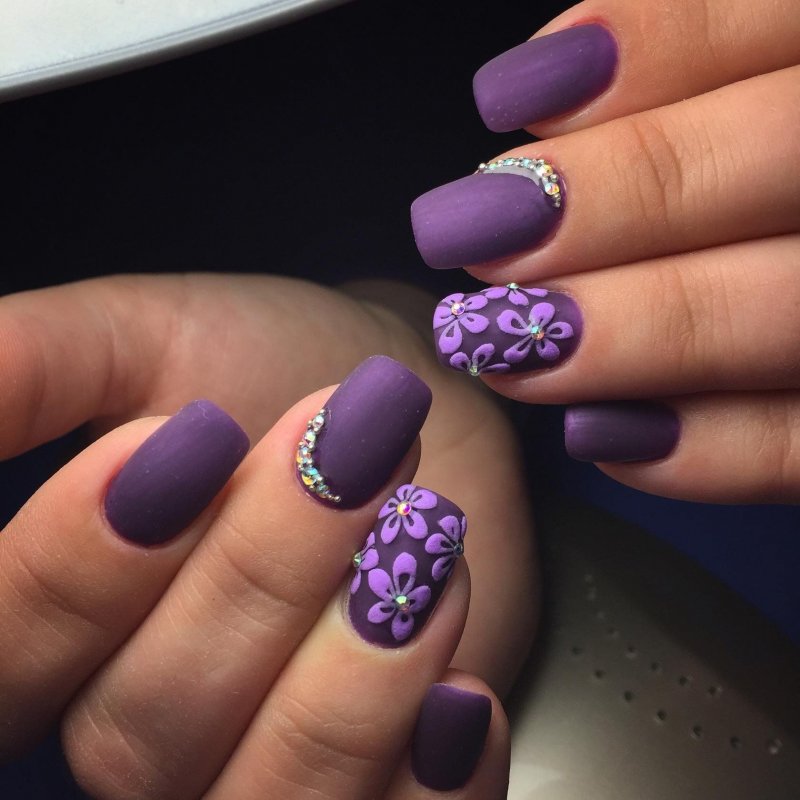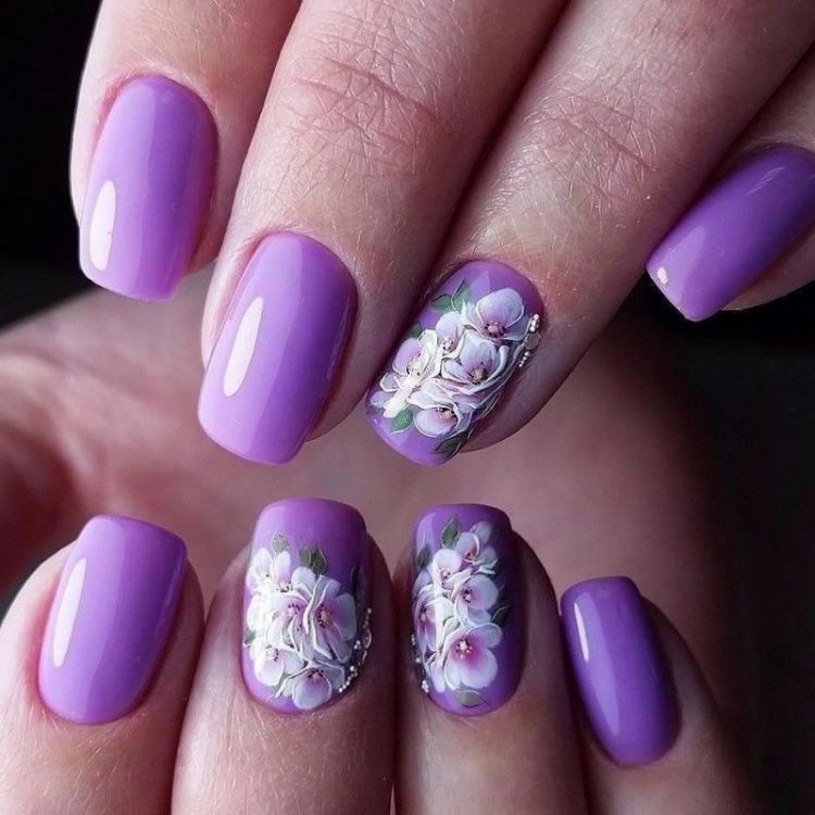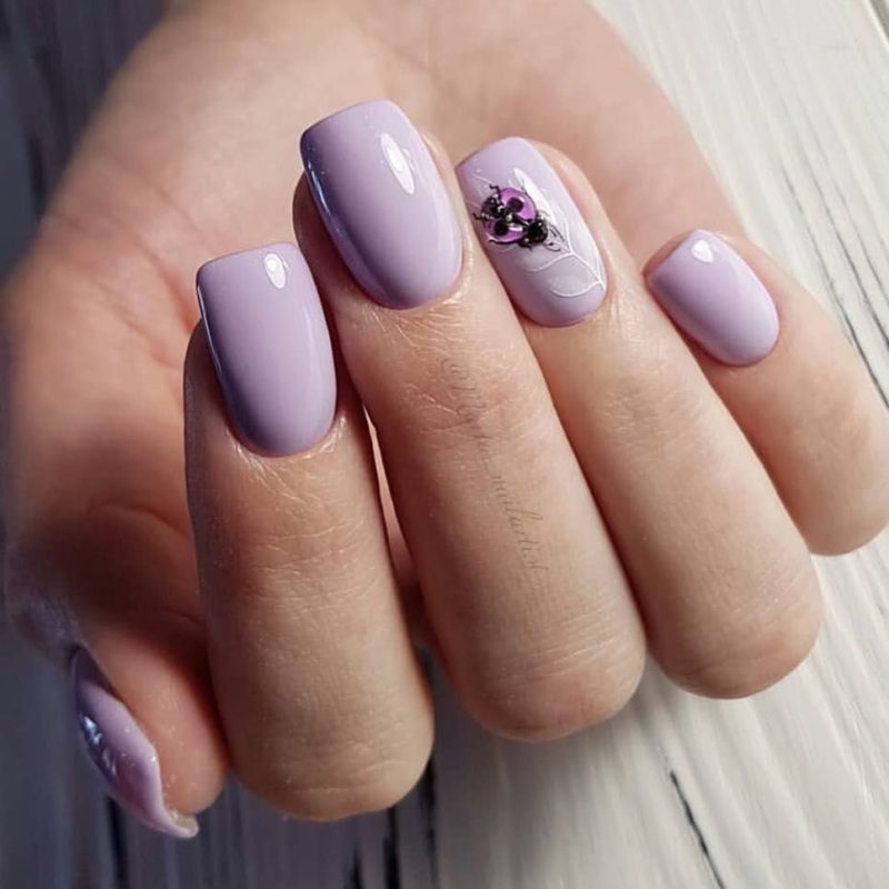 Современная индустрия нейл арта позволяет сделать рисунки для маникюра самыми разными способами: кистью, дотсом, с помощью трафарета или наклеек. Конечно, в домашних условиях проще использовать стемпинг или наклейки. Какие рисунки походят сиреневой базе? В первую очередь яркие весенние — цветы, насекомые. Актуальна и простая геометрия, где можно сочетать сразу несколько тонов фиолетовой гаммы или дополнить цветами из ближайшей линейки — розовыми, голубыми, бордо, желтый.