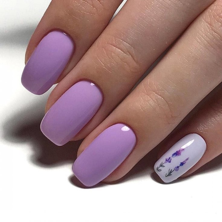Не стоит думать, что сиреневый это всего один тон. В природе существует множество оттенков сирени — темный, светлый, доходящий практически до белого. Здесь много вариантов дизайна маникюра — градиент от сирени к чисто белому, весенние рисунки на сиреневом фоне, сочетание с серебром, геометрия, классический френч и интересное оформление лунок.