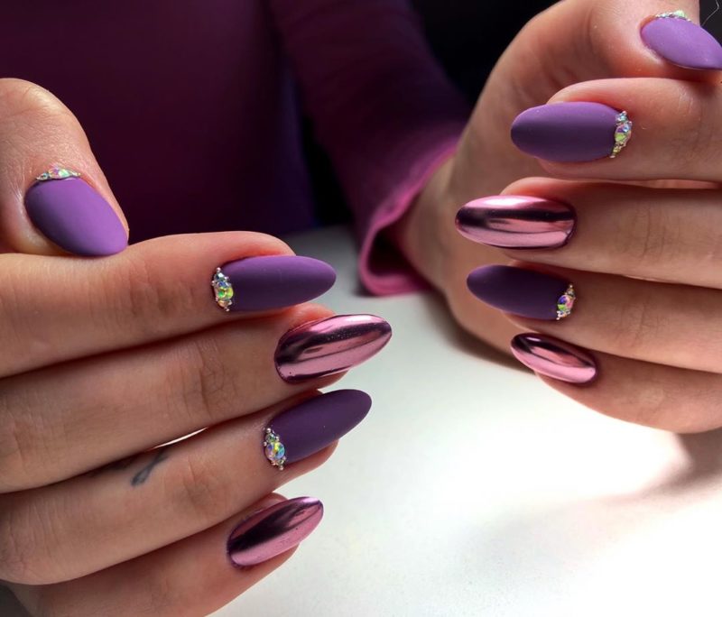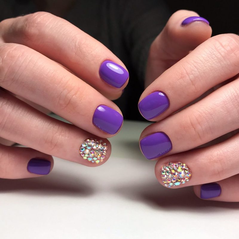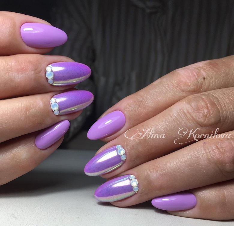 Сиреневой гамме больше идут серебристые или цветные камни и блестки. Золотые отлично смотрятся с самыми темными тонами палитры.