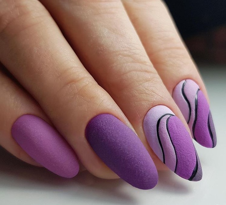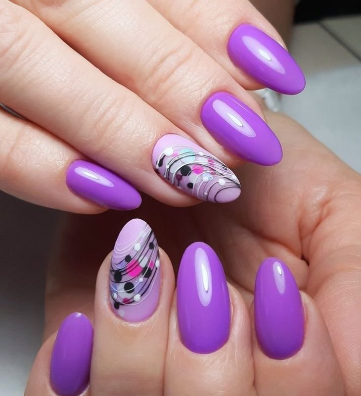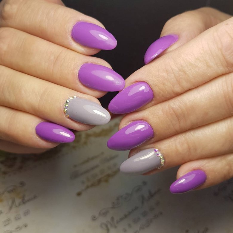 Миндалевидная форма ноготков — классика. Здесь уместны все оттенки сиреневого: от максимально светлых до темных, практически черных. На миндальной форме эффектно смотрится маникюр “кошачий глаз”, вертикальное омбре, необычный френч.