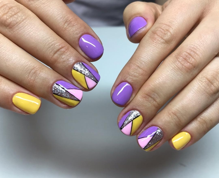 Фиолетовый и желтый — модный и стильный тандем. Как ни странно, но эти два сложных оттенка словно созданы друг для друга. Главное — выбрать подходящие тона лака. Для темных теплых фиолетовых подойдут солнечный желтый, банановый, желто-оранжевый. Для более светлых холодных сиреневых — лимонный, светло-желтый и др.