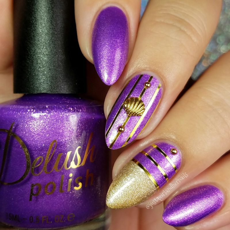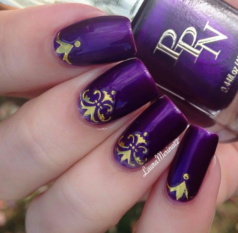 Не стоит отказываться от золотого декора. Жидкий драгоценный металл всегда выгодно смотрится на ноготках. Стоит помнить, что золотой больше подходит к темным вкусным оттенкам фиолетового: сливовому, лиловому, виноградному, пурпурному.