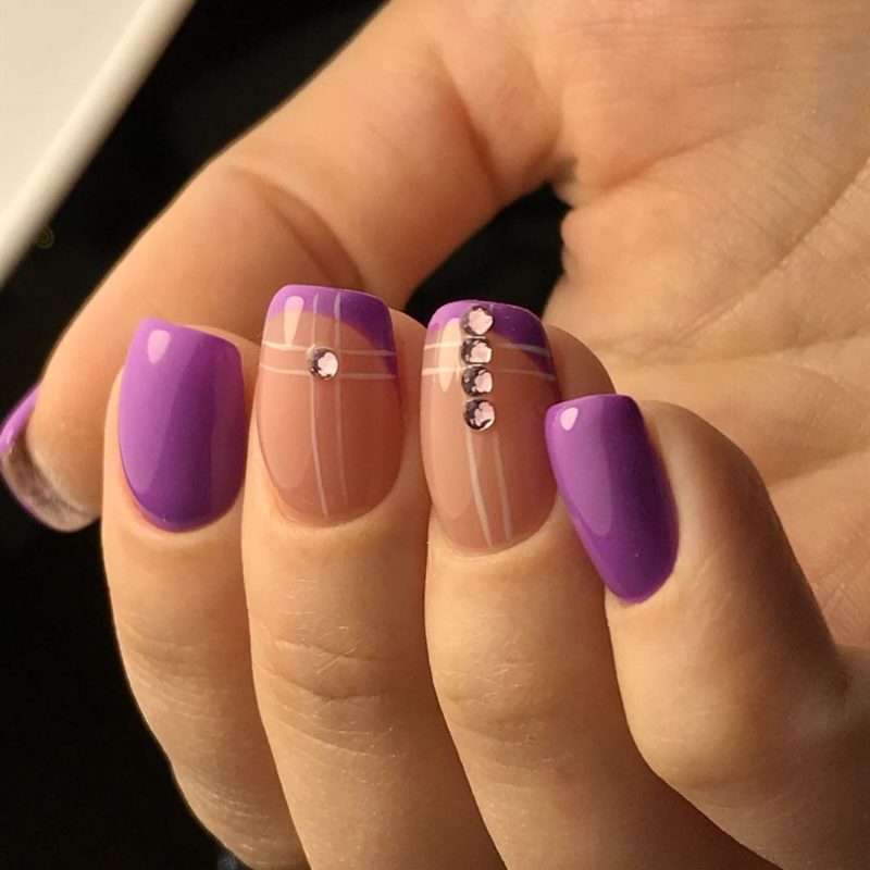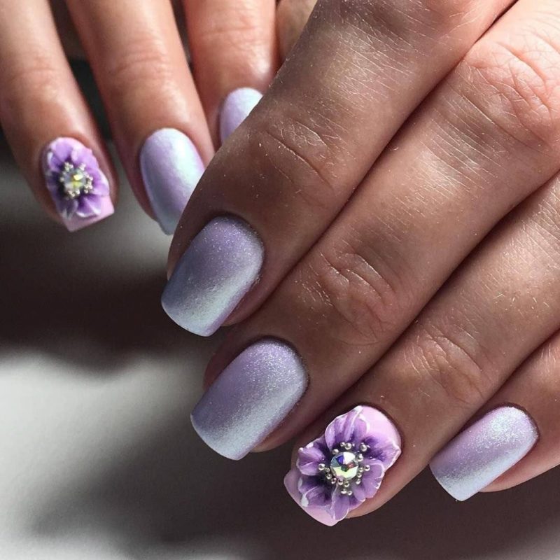 Для короткой длины отлично подойдут оттенки средней интенсивности. Они визуально удлиняют ноготь, поэтому можно будет обойтись без наращивания. Оптимальный дизайн сиреневого маникюра для коротких ноготках — матовое покрытие иди градиент. А вот от яркого глиттера или фольги в дизайне лучше отказаться.