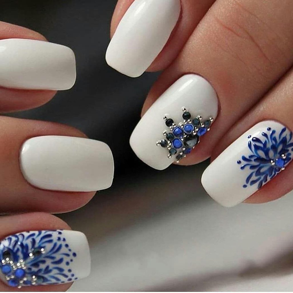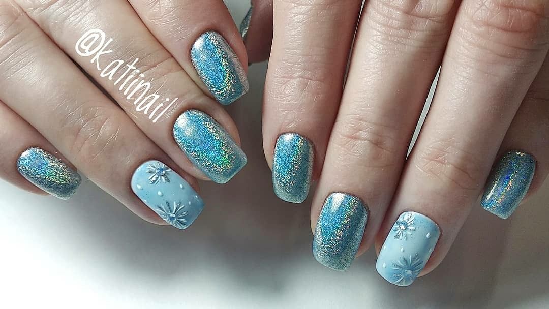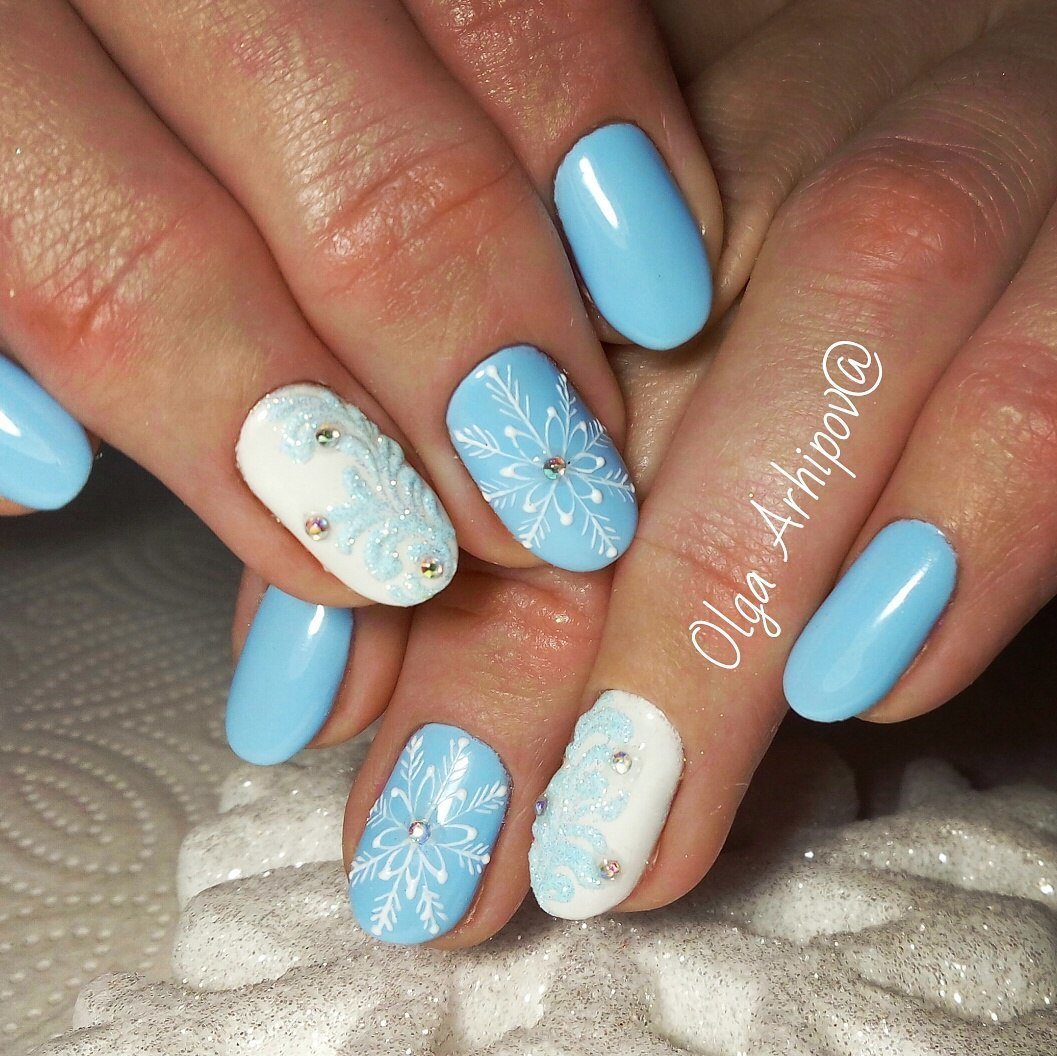 Нежный голубой — оттенок, который актуален каждую зиму. на его фоне очень нежно и стильно смотрятся серебристые снежинки и зимние белые узоры. С помощью голубого лака можно создать нежный и женственный дизайн. Этот оттенок отлично смотрится с другими пастельными или нюдовыми цветами.