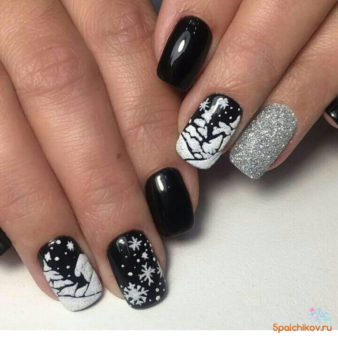 основой для праздничного маникюра может стать золото или серебро. Оформить ноготки можно с помощью глиттера, пудры или блесток. Кроме того блестящую основу можно создать с помощью камифубуки или ярких хлопьев Юки. Для блестящей базы нужен более спокойный декор, который уравновесит ее, но и будет заметен. Подойдет белый, голубой или черный лак. С их помощью можно нарисовать шапки снега, заснеженные деревья и снежинки.