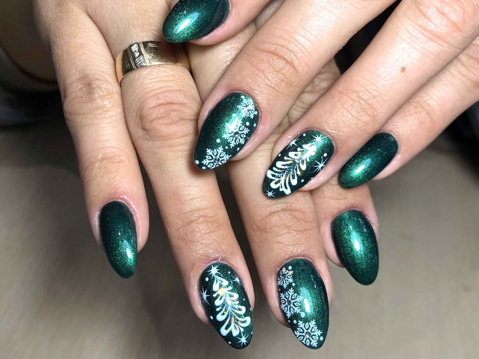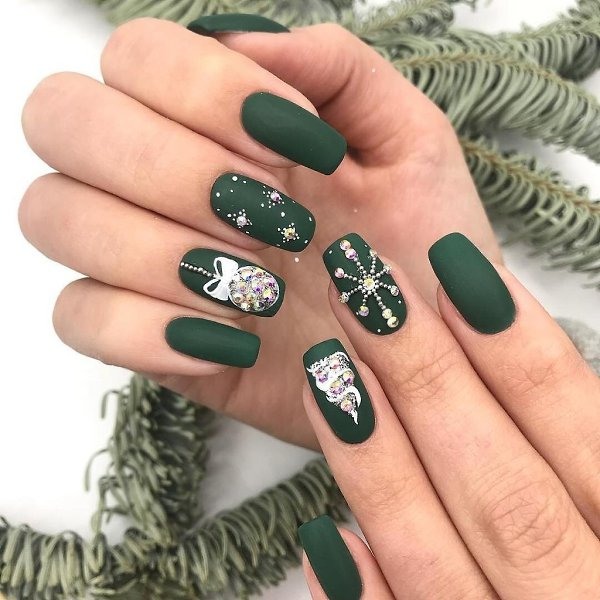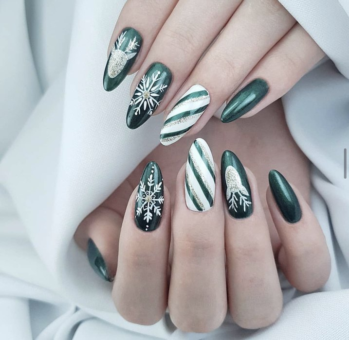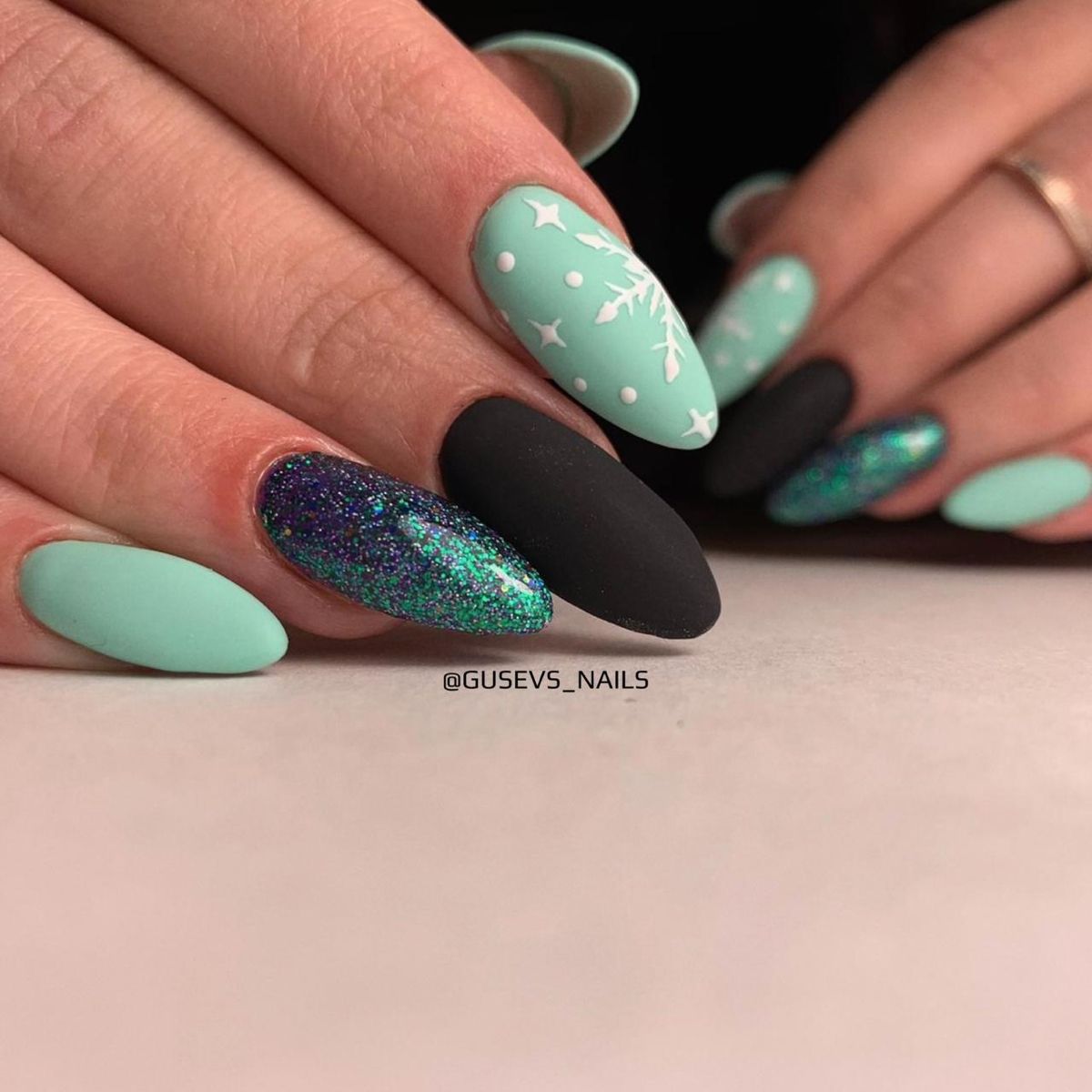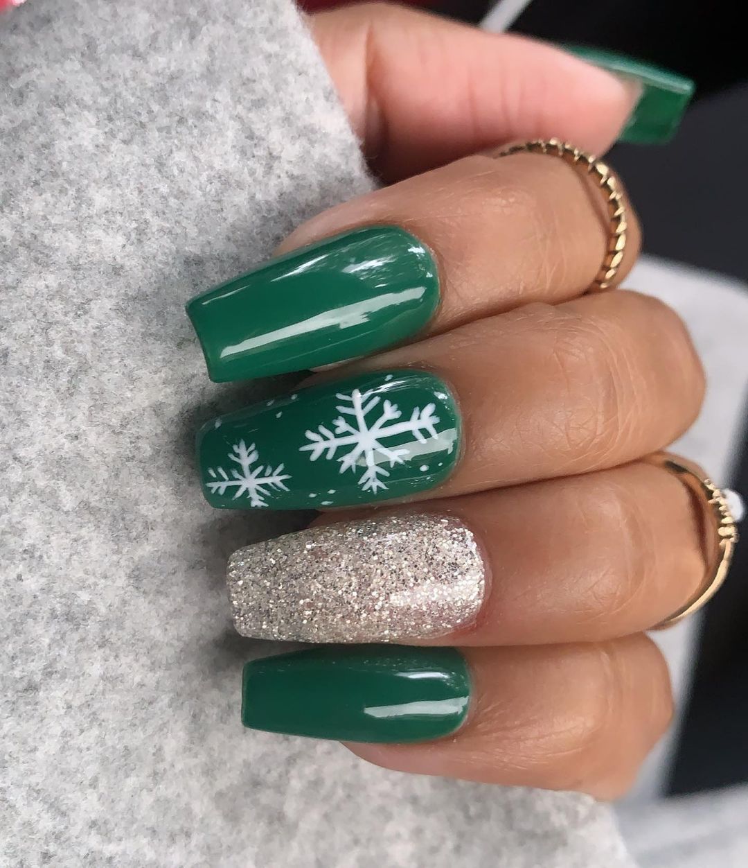 Наступление зимы не повод отказываться от зеленой палитры. В этом сезоне особенно актуальны оттенки хаки, оливковый, болотный. Если вы не хотите рисовать на ногтях яркую зеленую елочку, сделайте маникюр в одном из этих оттенков. Они обязательно «подружатся» с золотистыми и серебряными снежинками. Достаточно нарисовать ее на одном ноготке, чтобы получился модный и стильный маникюр.