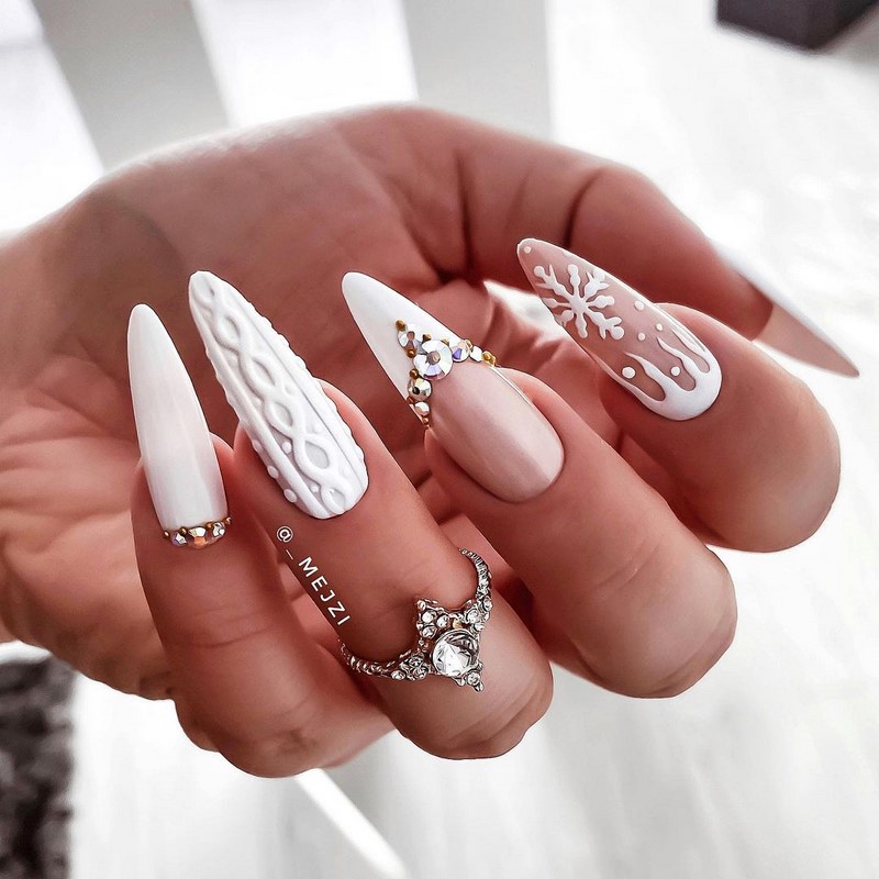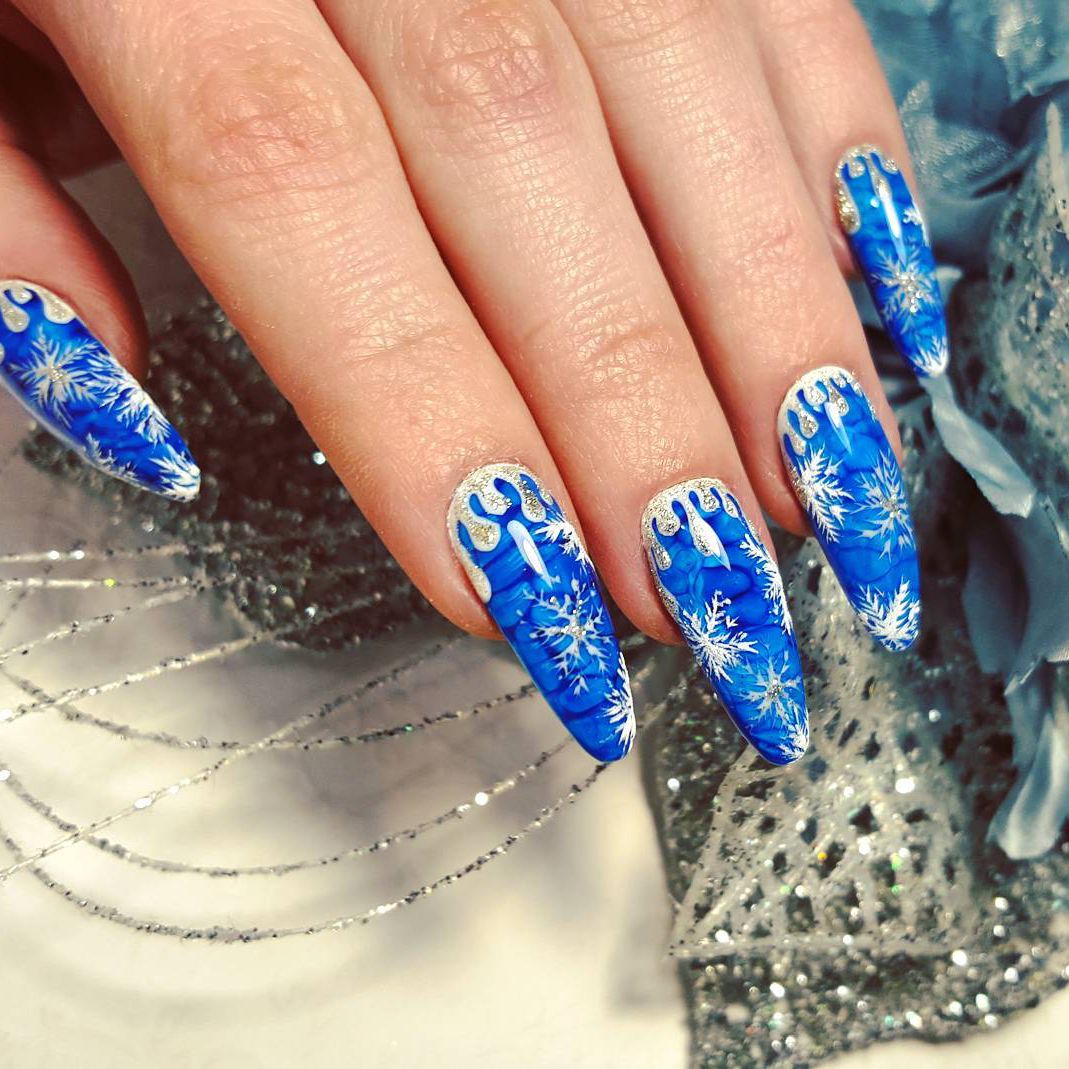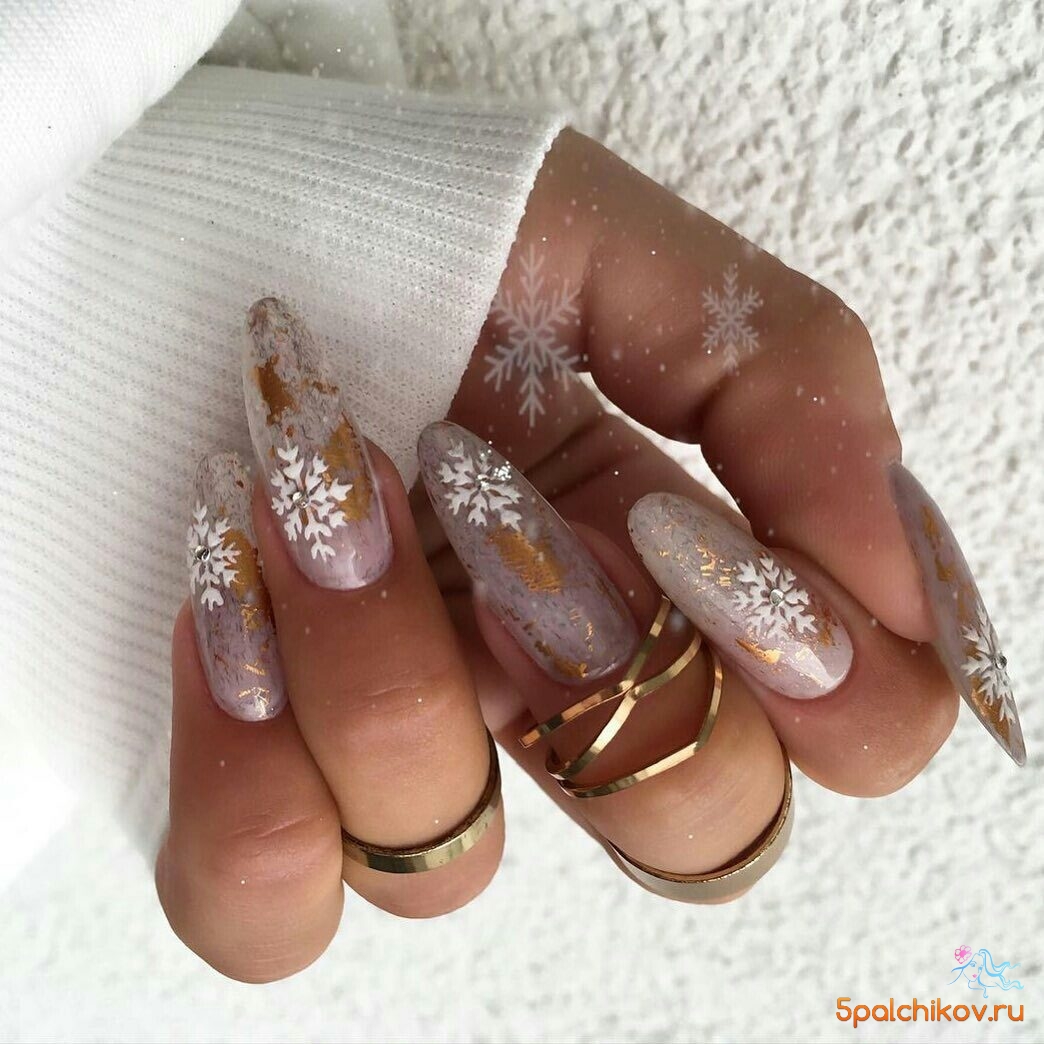 Если в планах необычный и обильный дизайн — выбирайте большую длину. Это отличная база для экспериментов. Снежинки можно удачно сочетать с другими зимними рисунками, использовать стразы и глиттер для акцента, сочетать разные техники. Даже нейл-мастера спорят о том, какой же дизайн со снежинкой можно считать актуальным, если размещать рисунок на длинных ноготках.