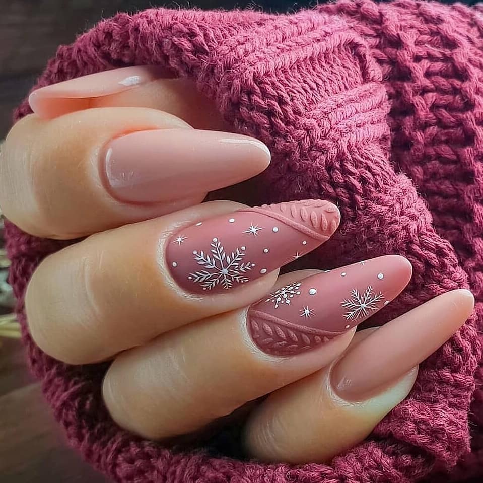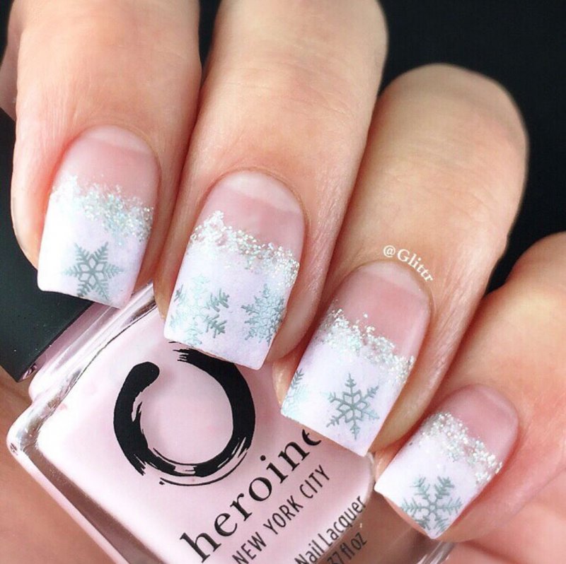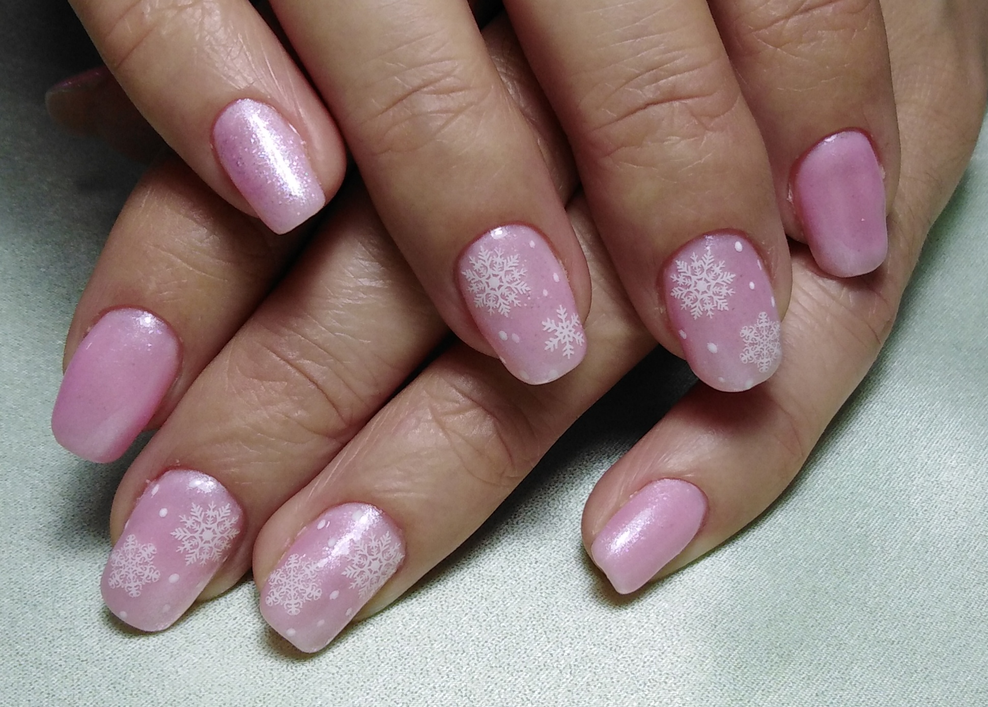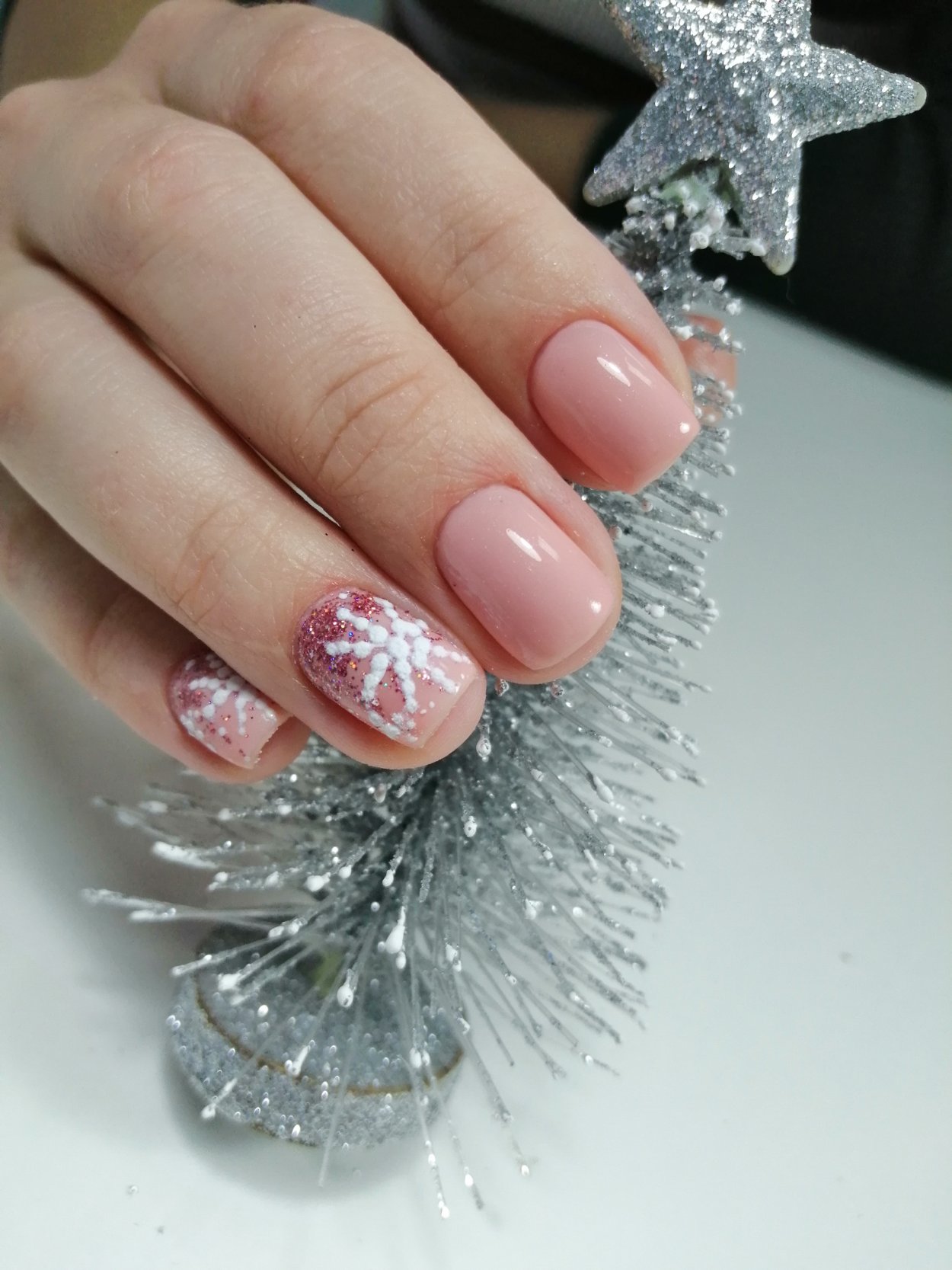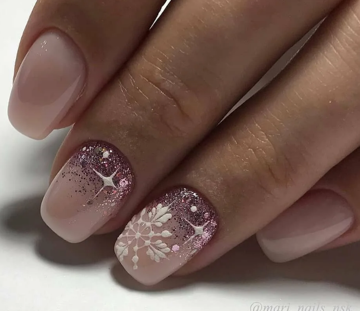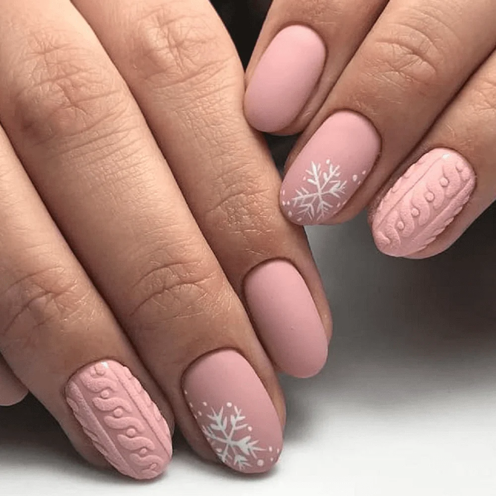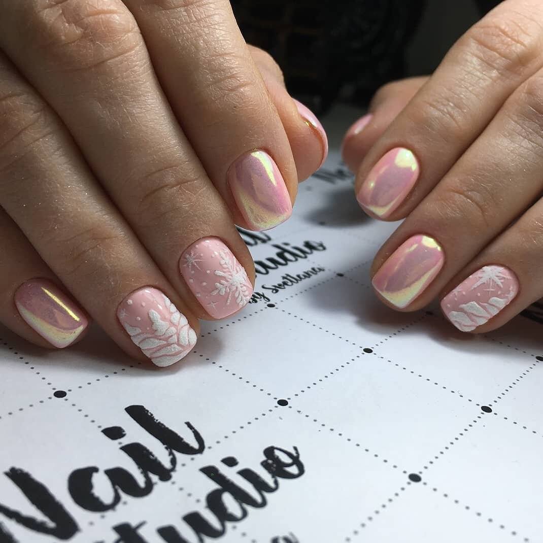 Еще один нежный и женственный оттенок лака. Розовый — это классика. выбирайте любой дизайн — френч, лунный маникюр, омбре, матовый или разные руки. Все они актуальны в этом сезоне. И обязательно дополните рисунком снежинки.
