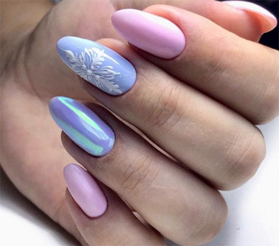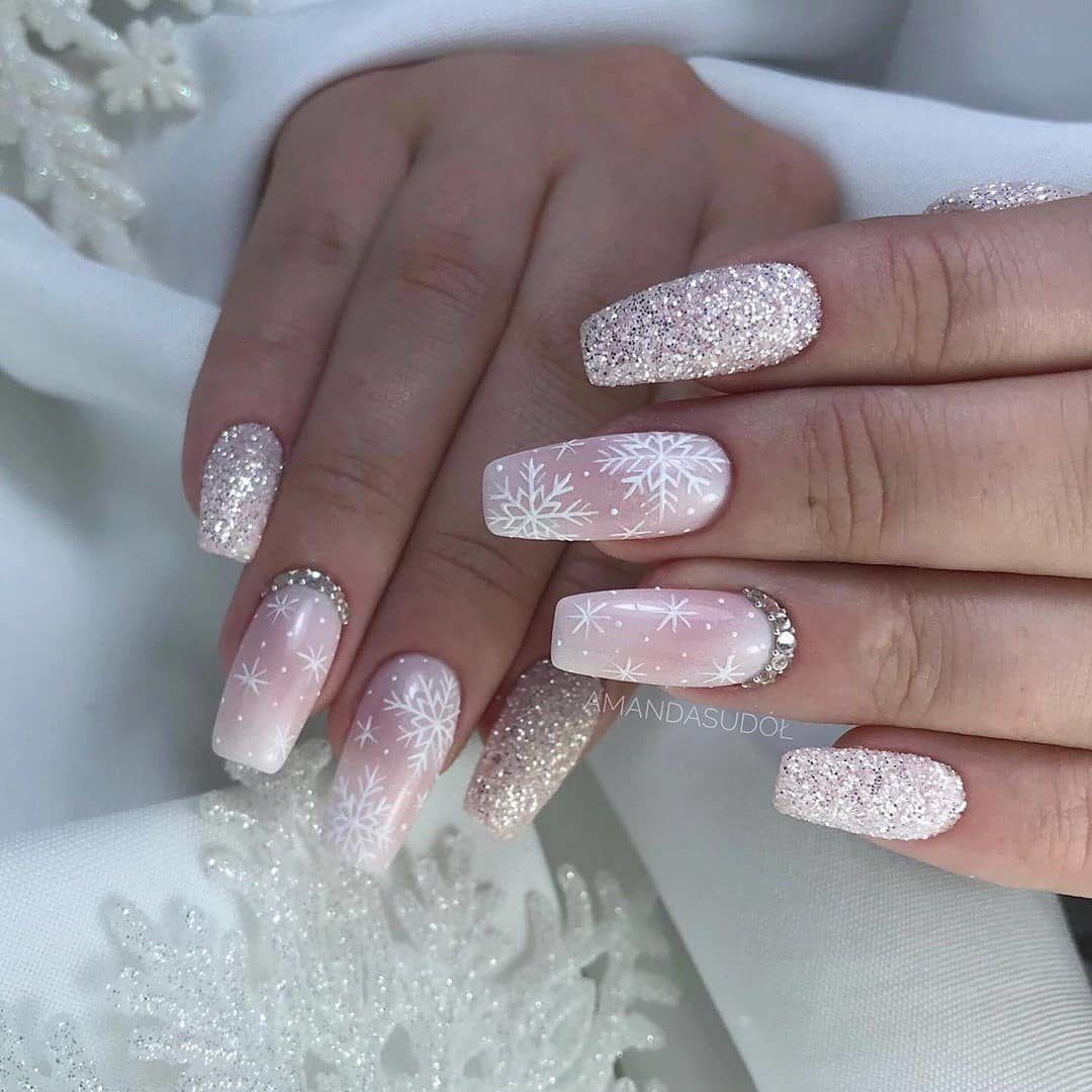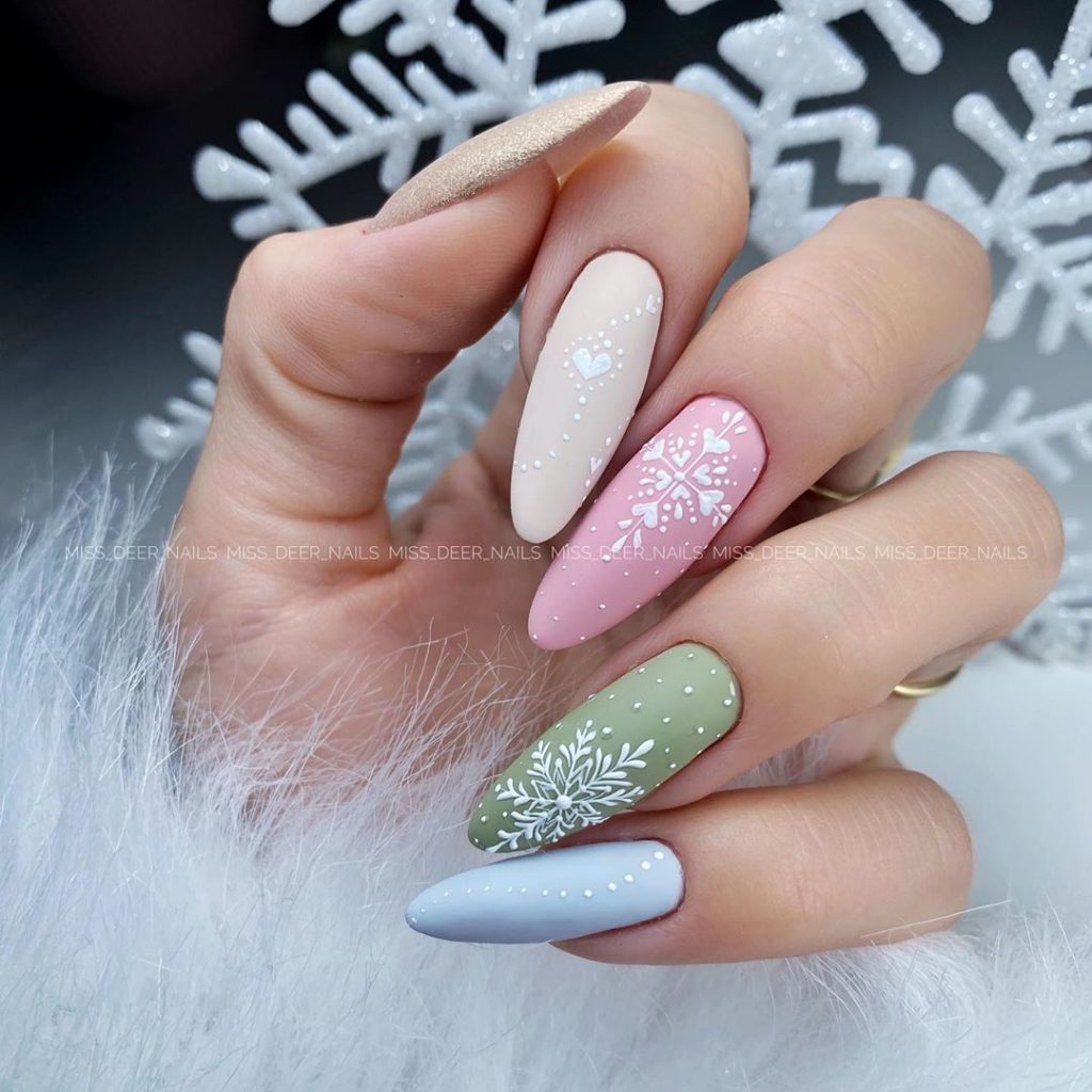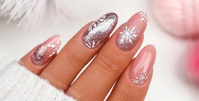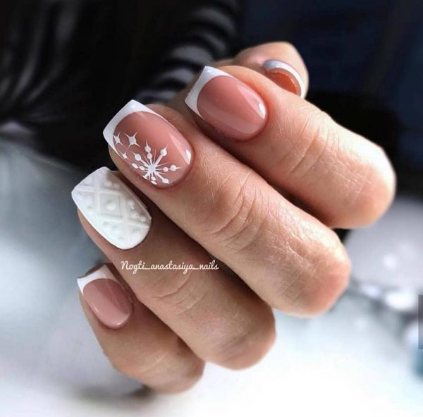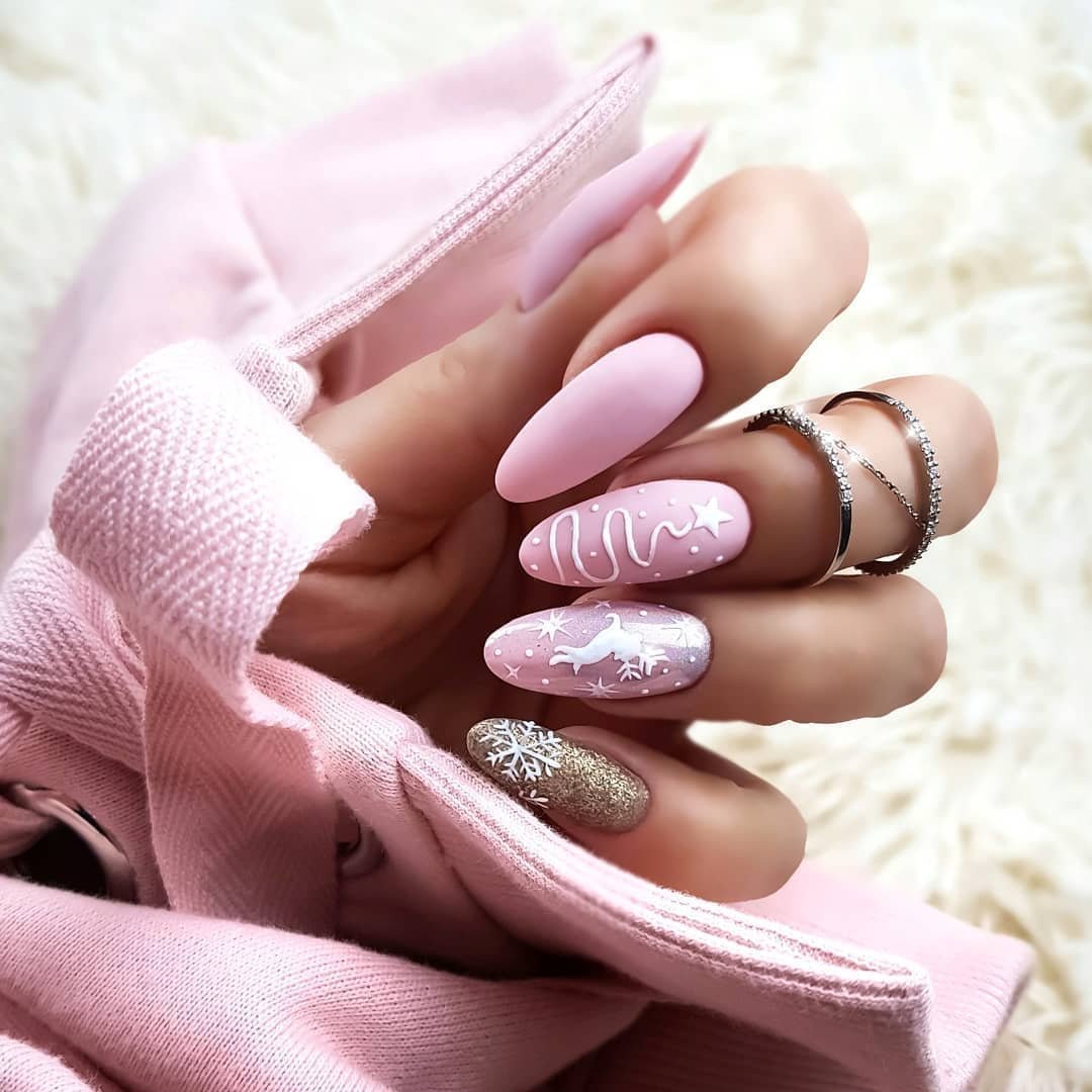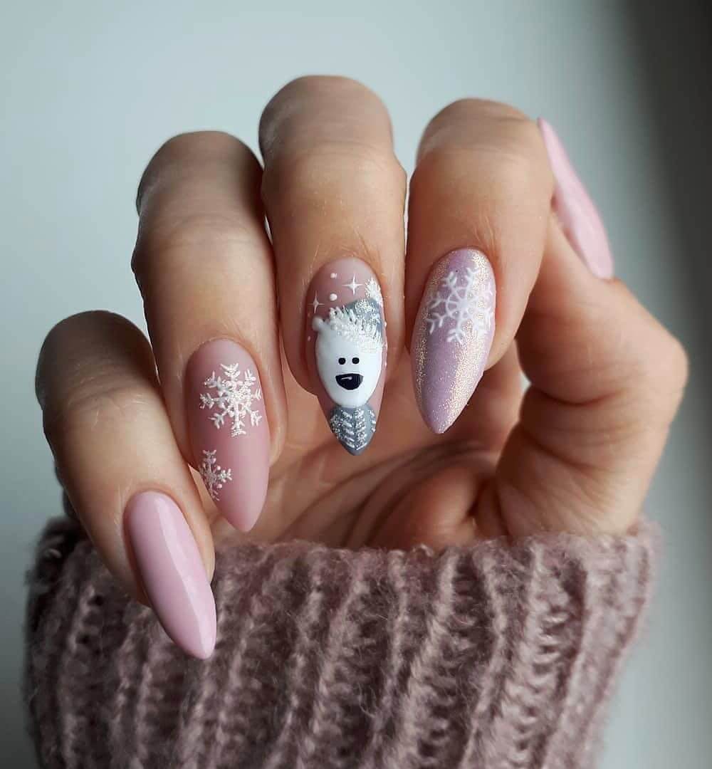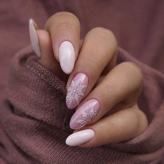 Еще один нежный и женственный оттенок лака. Розовый — это классика. выбирайте любой дизайн — френч, лунный маникюр, омбре, матовый или разные руки. Все они актуальны в этом сезоне. И обязательно дополните рисунком снежинки.