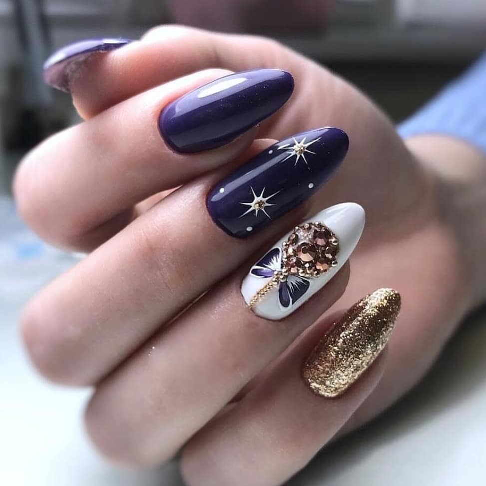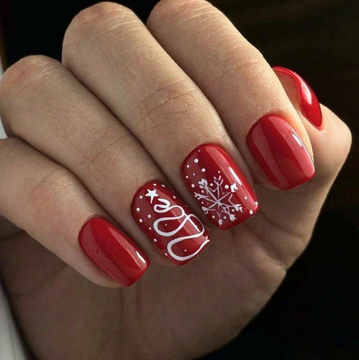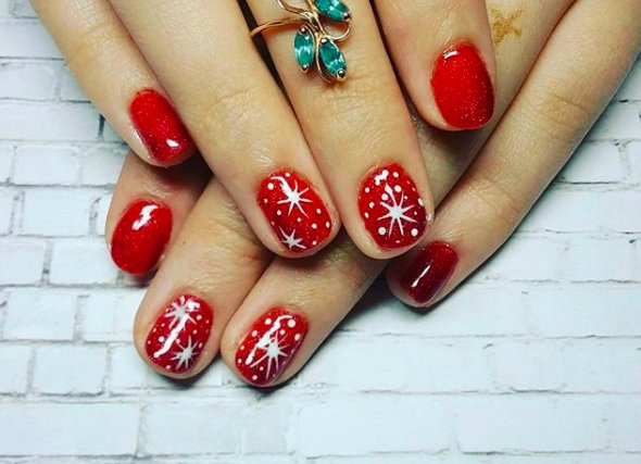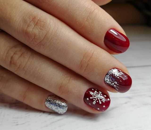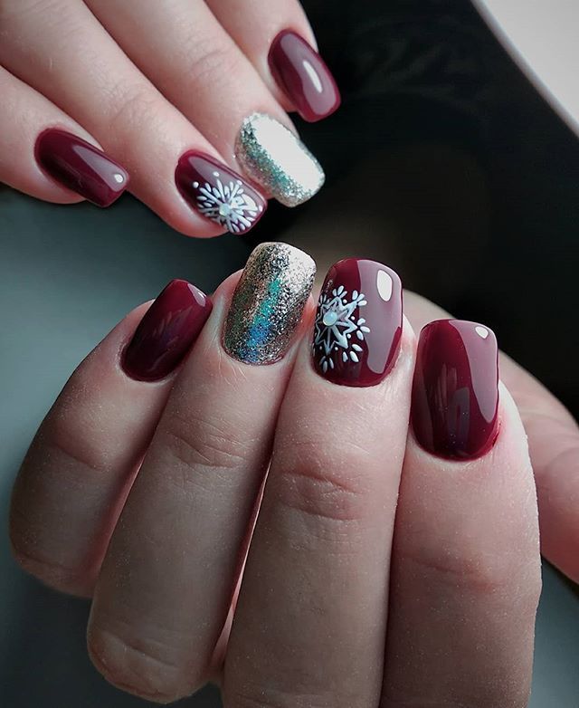 Бордовая палитра — богатая и глубокая. Она очень подходит для зимы. На ярком винном фоне отлично смотрятся золотистые, белые или серебристые снежинки. Чтобы сделать маникюр более праздничным, оформите середину с помощью крупного камня. Например, красного оттенка.