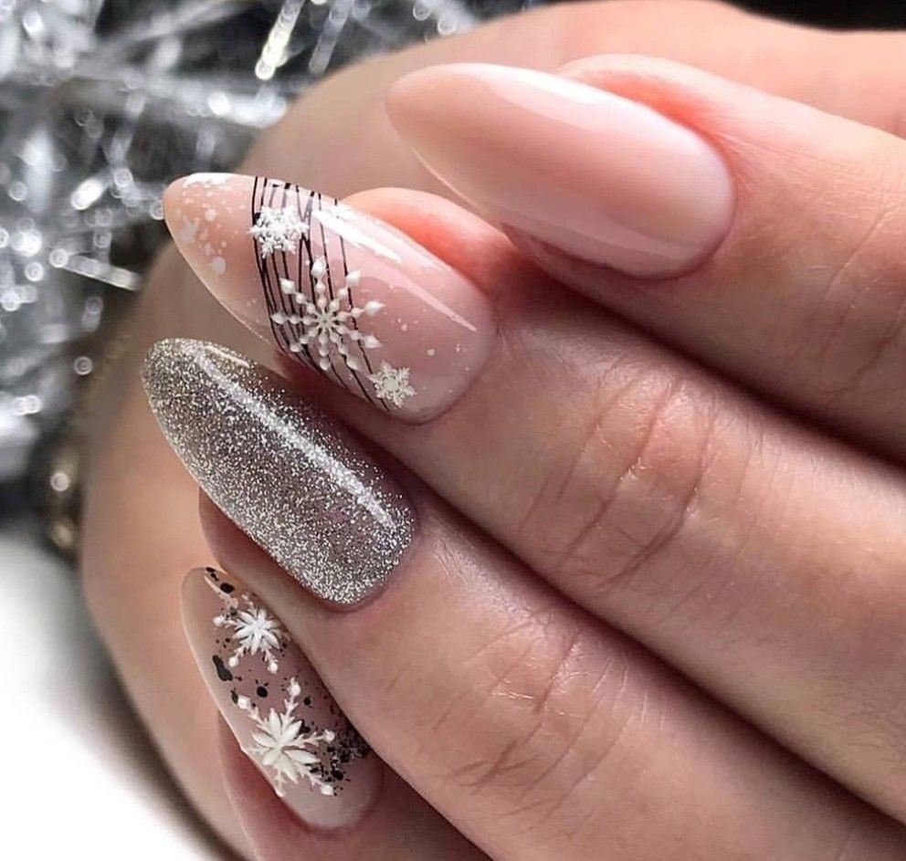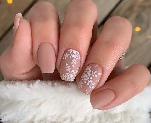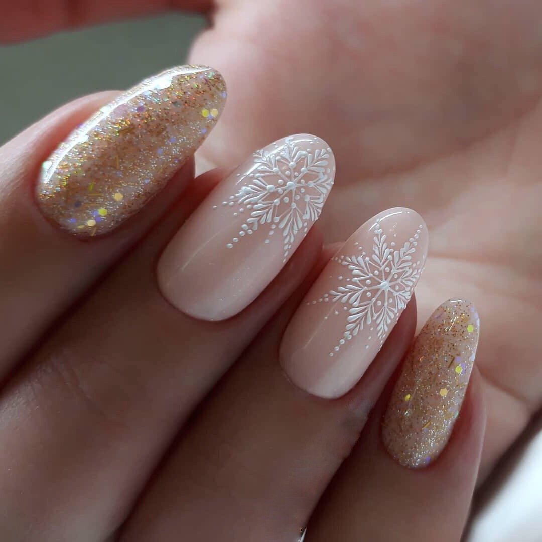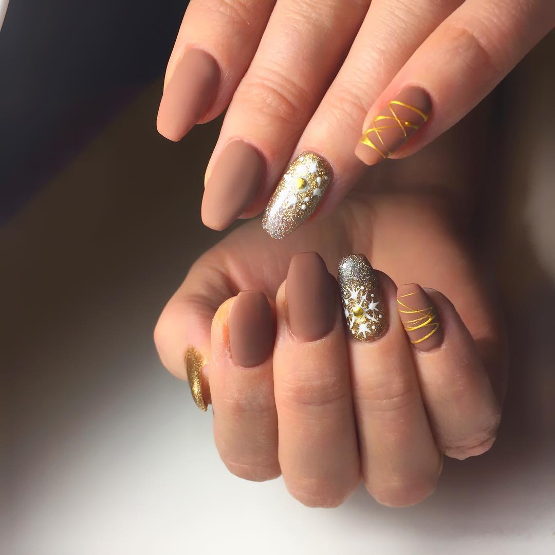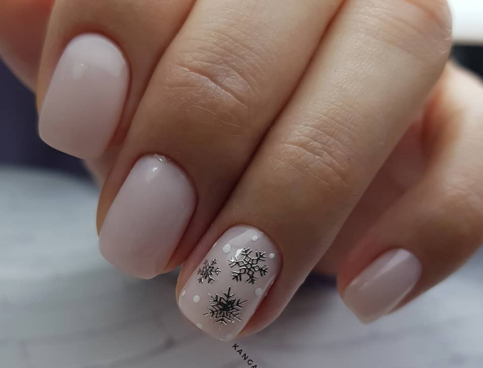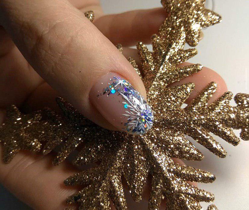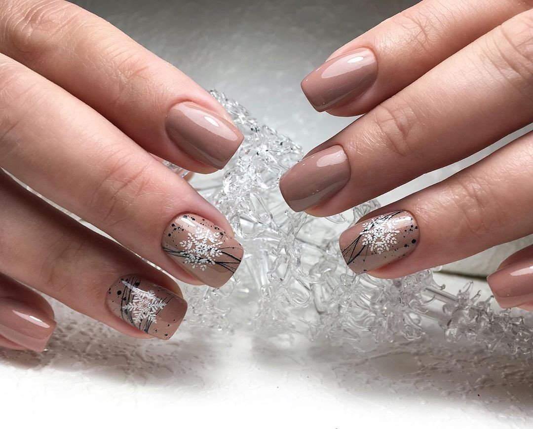 Нюдовый маникюр — один из трендов этого сезона. Он позволяет создать эффект ухоженных ноготков, а любой дизайн на такой базе смотрится дорого и стильно. Нюдовые оттенки отлично смотрятся с золотистыми снежинками. Если вам хочется необычного декора, выбирайте матовые текстуры для базы и бархатистый лак для снежинки.