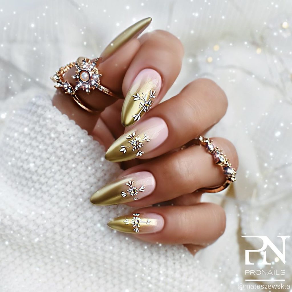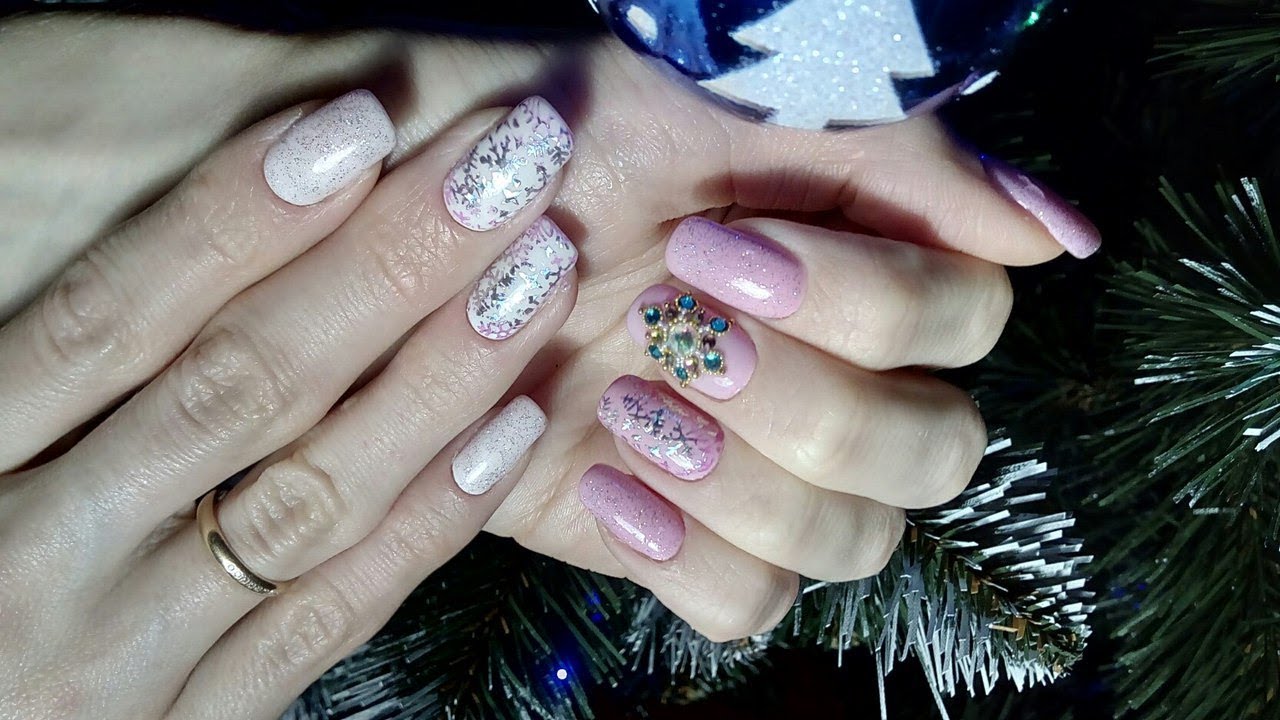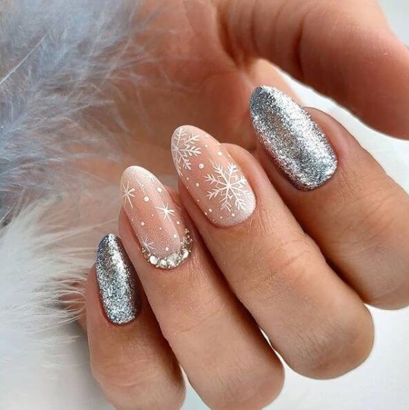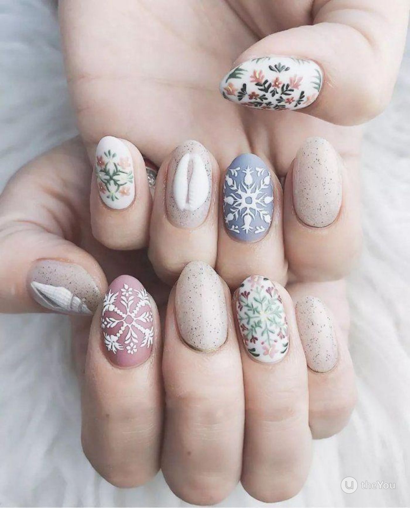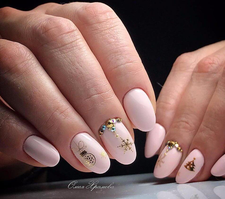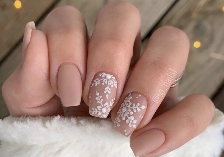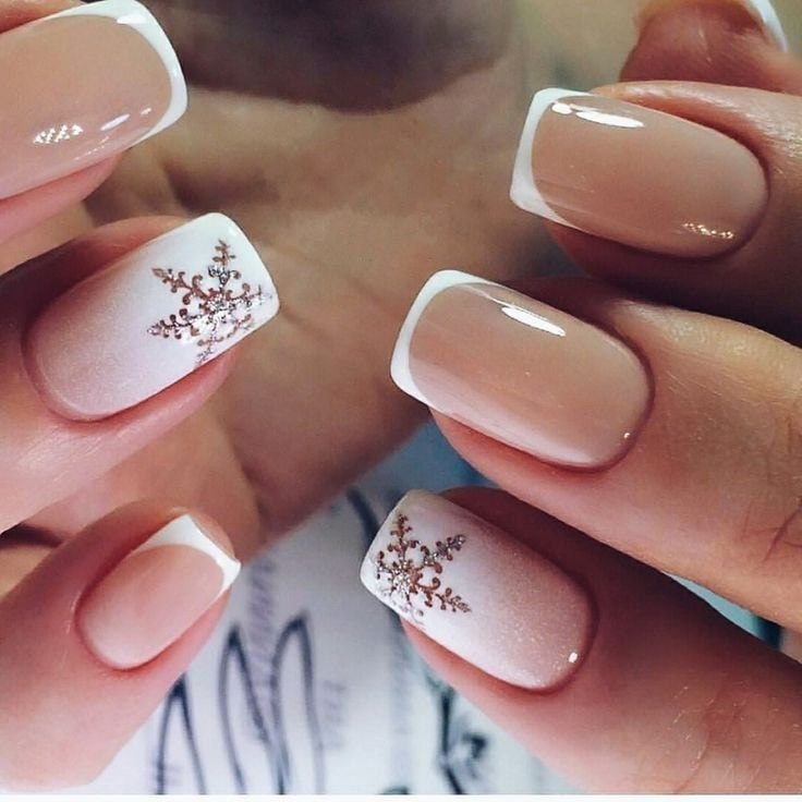 Нюдовый маникюр — один из трендов этого сезона. Он позволяет создать эффект ухоженных ноготков, а любой дизайн на такой базе смотрится дорого и стильно. Нюдовые оттенки отлично смотрятся с золотистыми снежинками. Если вам хочется необычного декора, выбирайте матовые текстуры для базы и бархатистый лак для снежинки.