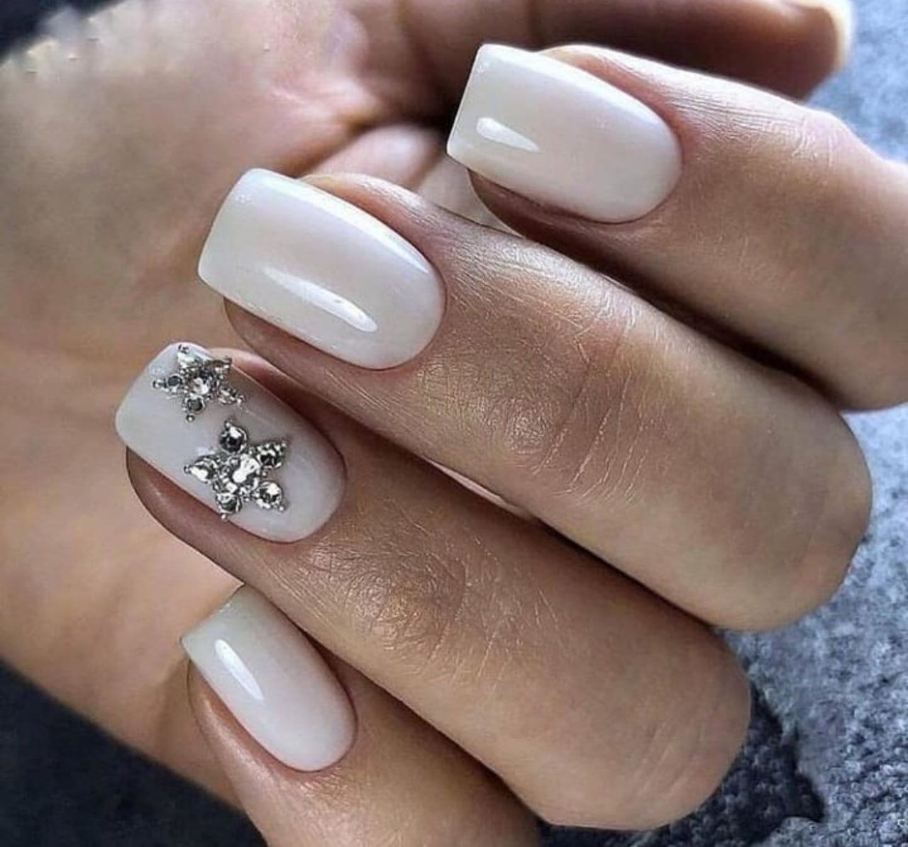 Молочный оттенок во многом напоминает зимнее окно, покрытое инеем от сильного мороза. На его фоне можно нарисовать любые снежинки — серебристые, золотые, синие, красные, даже черные. Никаких правил здесь нет, подбирайте сочетание цветов под основной образ и фантазируйте.