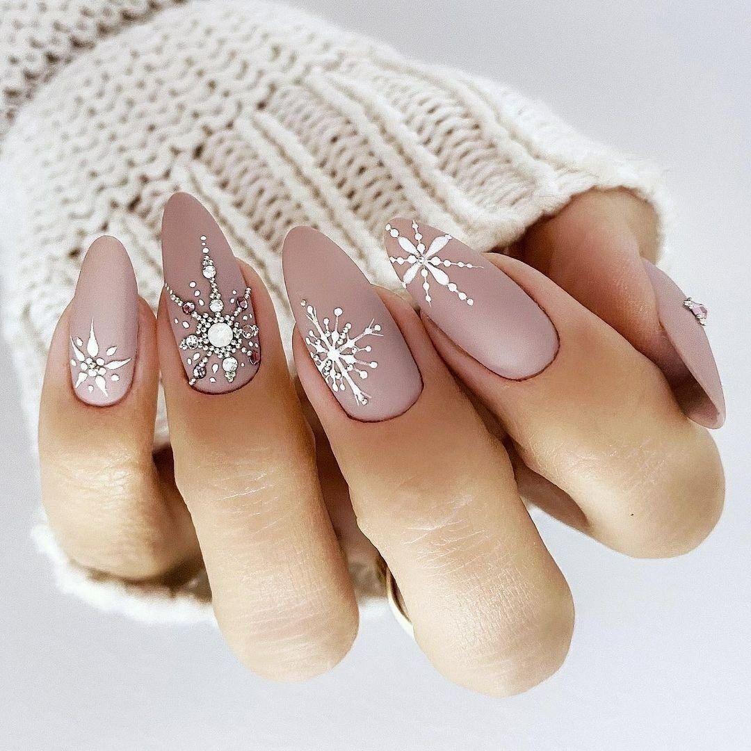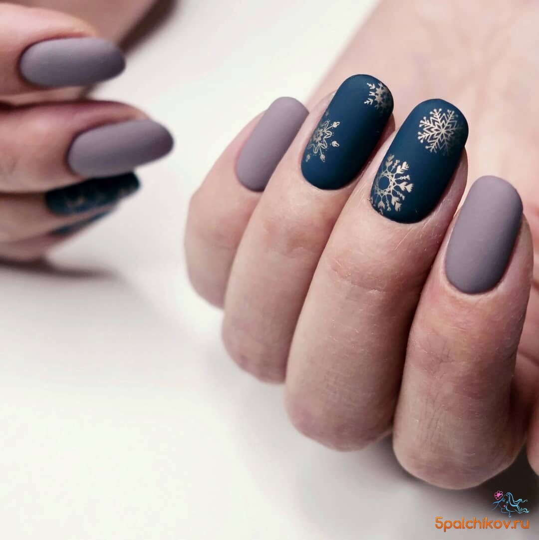 Матовый маникюр — это тренд сезона 2026. Обязательно используйте такую текстуру для снежного рисунка. Такая текстура — отличная база для максимального блеска. Снежинку можно нарисовать ярким глиттером, блестками или выложить с помощью камней. Еще один вариант — блестящая акриловая пудра. Дизайн получится спокойным, но стильным и актуальным.