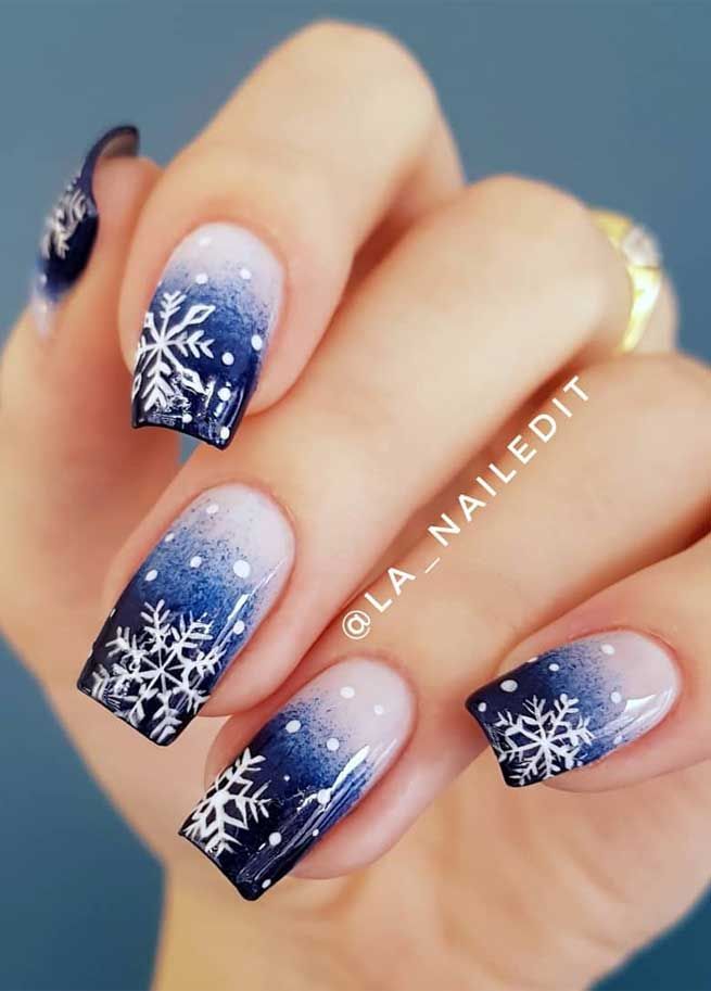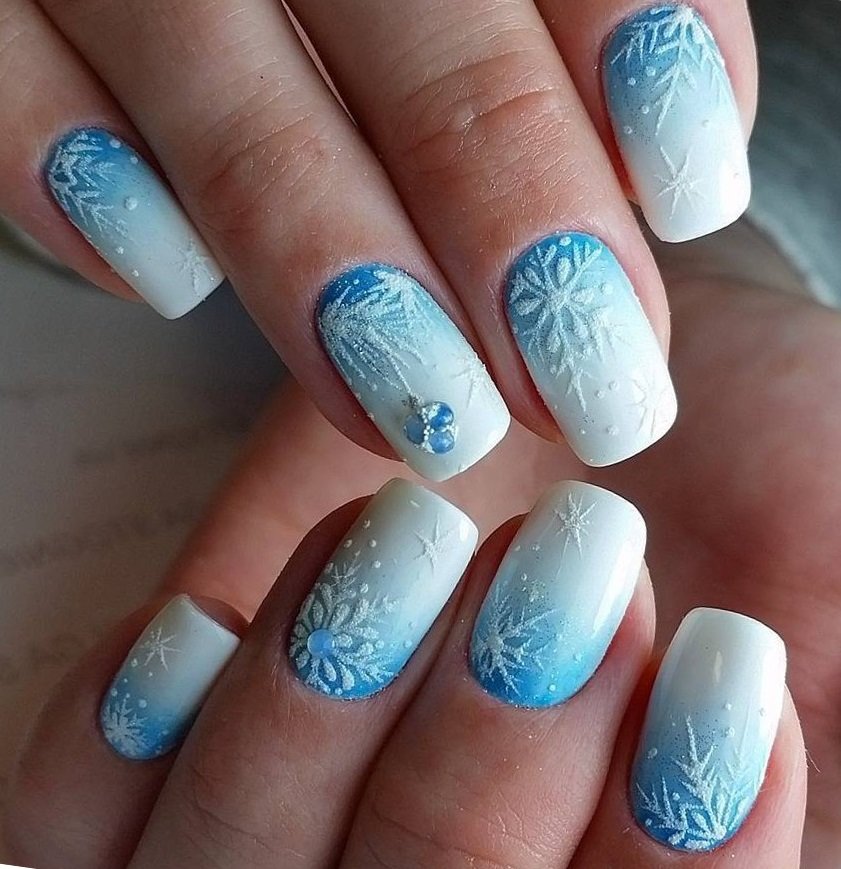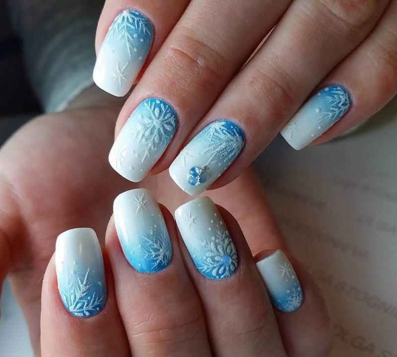 Какой фон лучше всего подходит для такого рисунка? Конечно тот, что имитирует зимнее окно или другую поверхность. Зимнее омбре — это растяжка от белого к голубому или наоборот. особенно актуально новогоднее ледяное омбре, где используется бесцветный лак, который плавно растягивается в нежный оттенок голубого или розового. На такой базе снежинки смотрятся натурально и стильно.