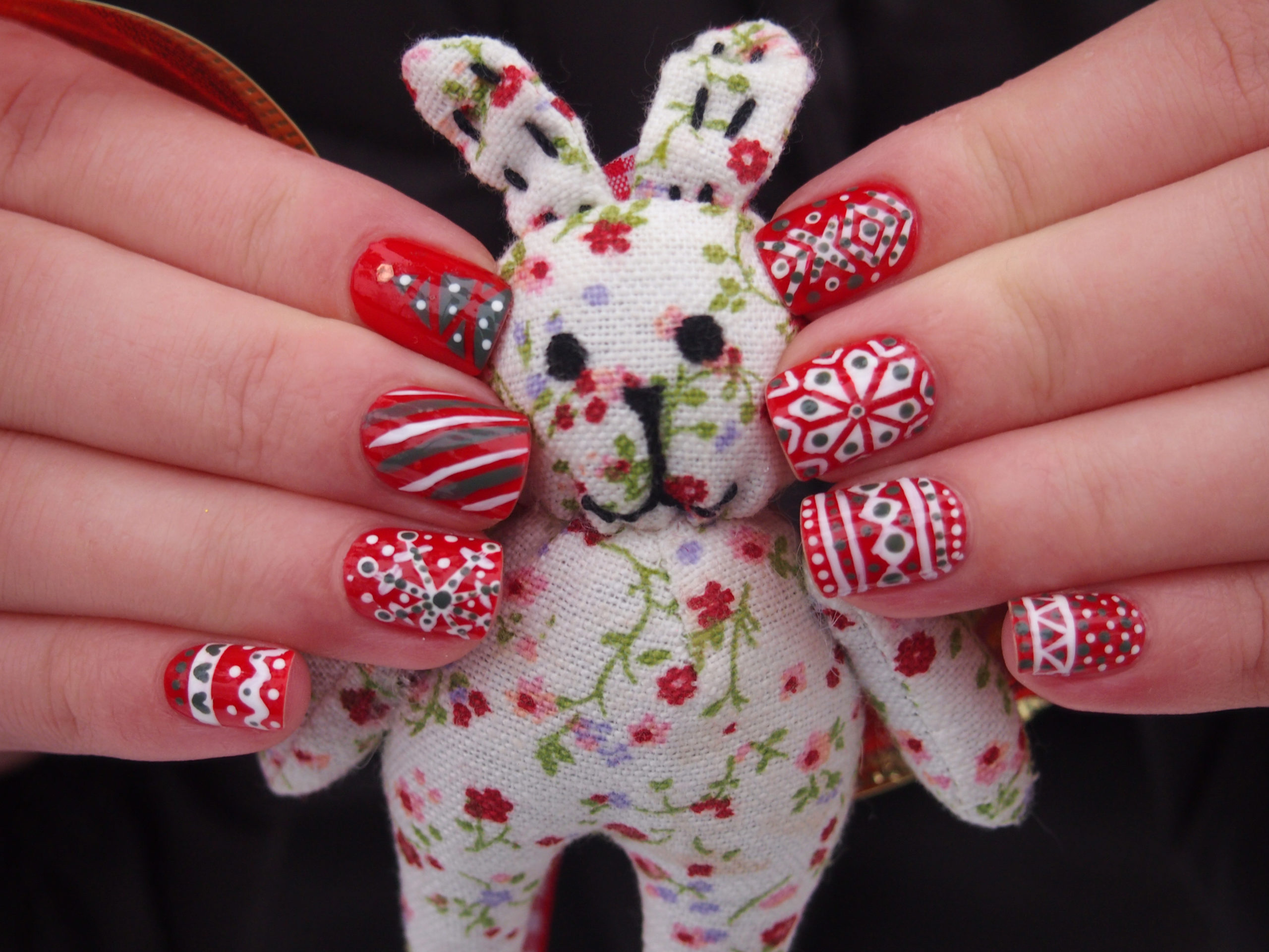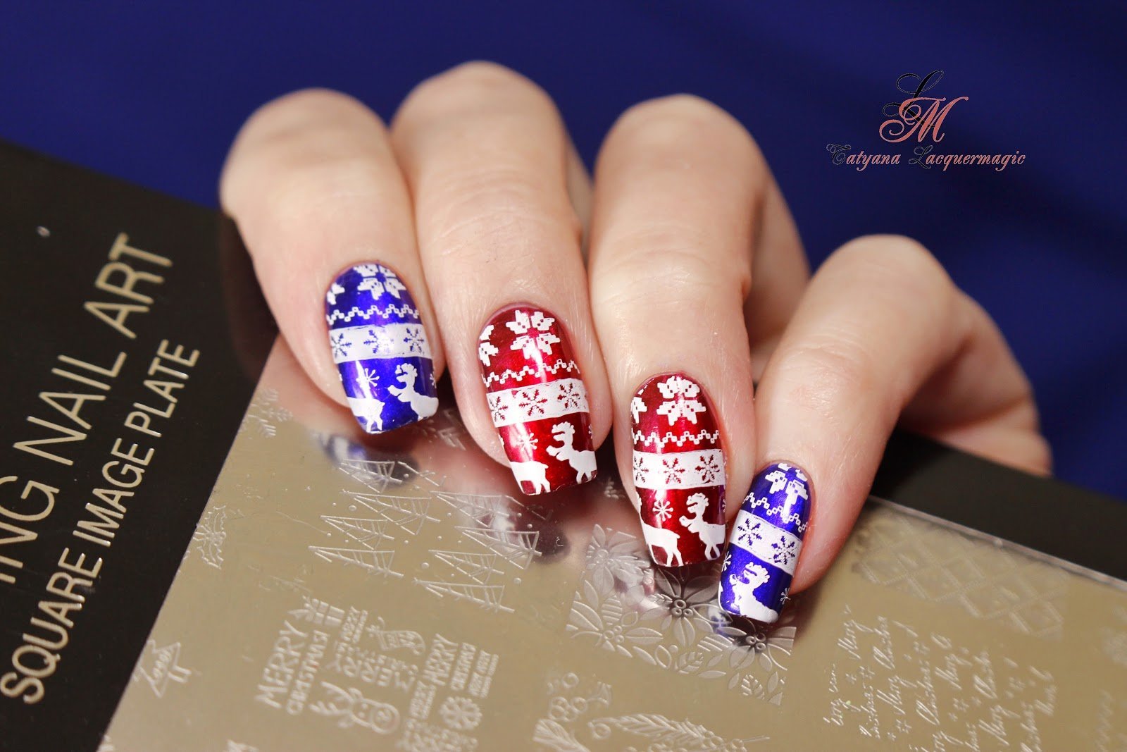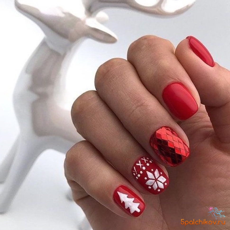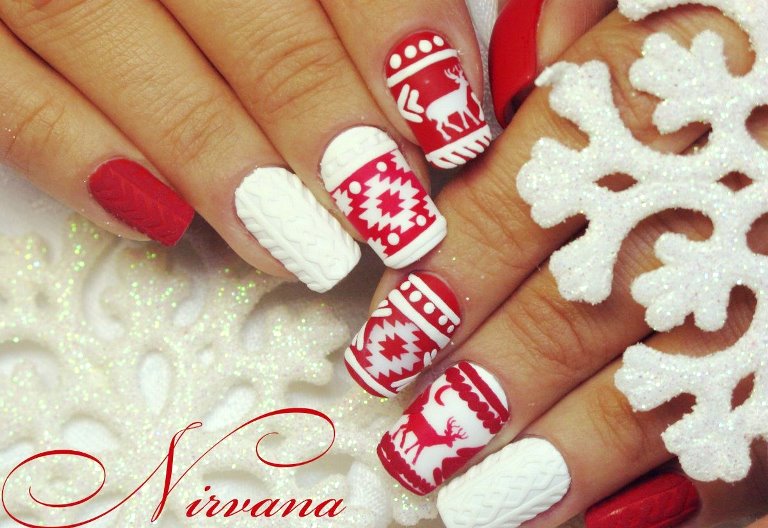 Мы привыкли рисовать сложные снежинки, которые не похожи друг на друга. Но почему бы не сделать интересный дизайн в скандинавском стиле. Что это такое? Это узор, который мастерицы использует при вязании свитеров и других аксессуаров. Маникюр получится довольно однотипным, сделать его можно с помощью наклеек или стемпинга. Вы можете немного разнообразить его, покрыв отдельные рисунки блестками или прорисовав контур другим цветом.