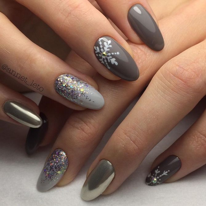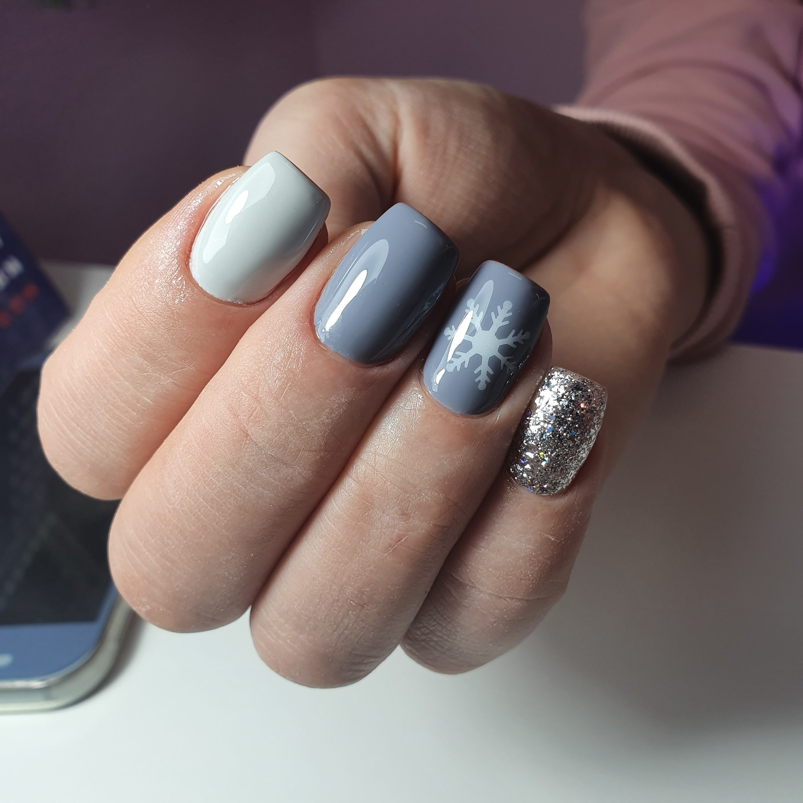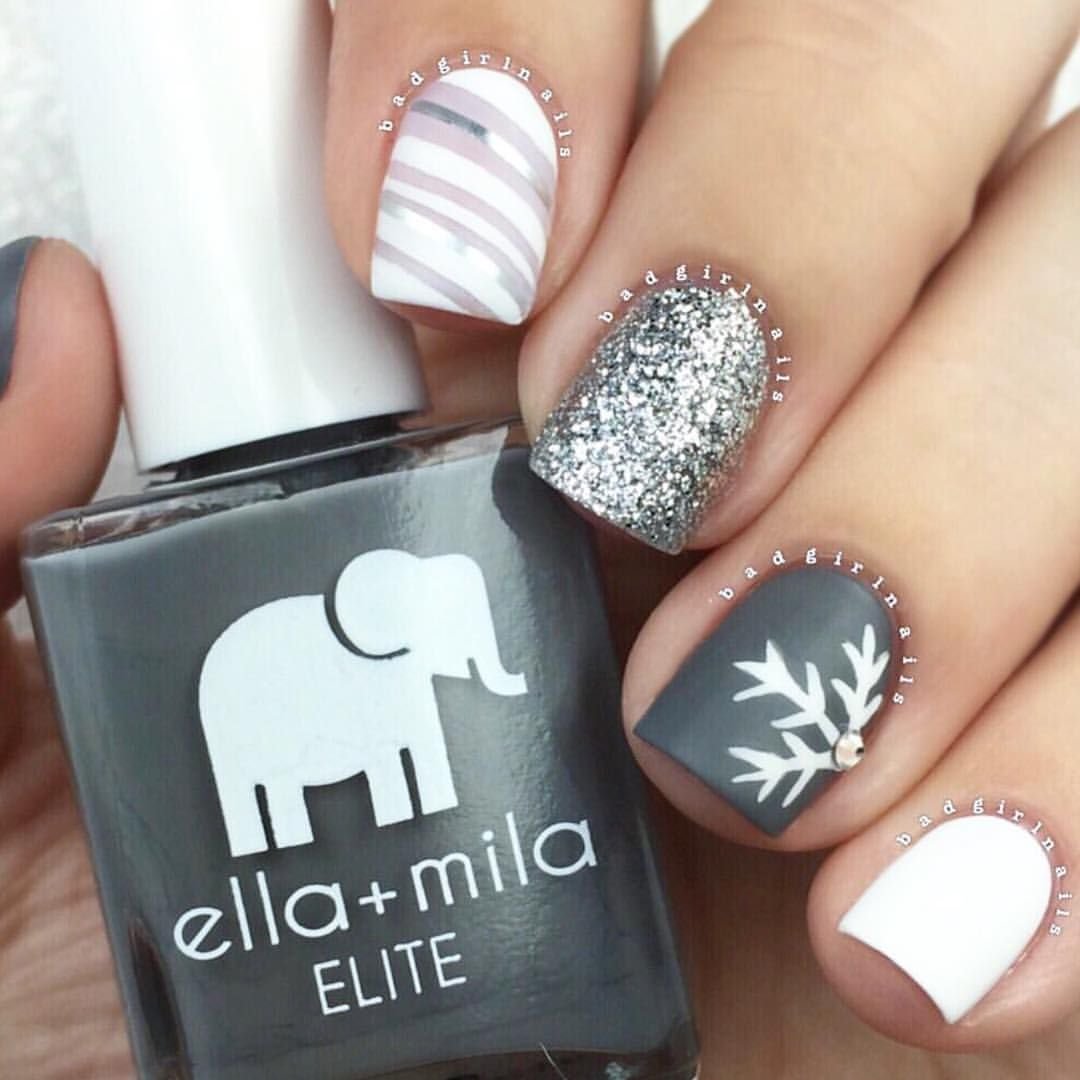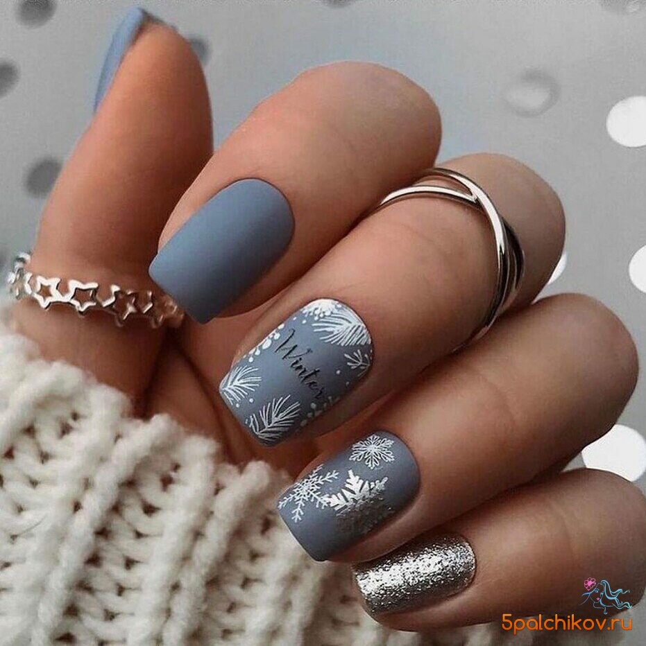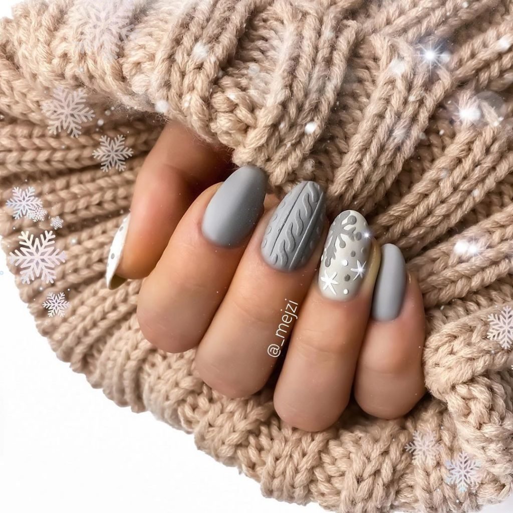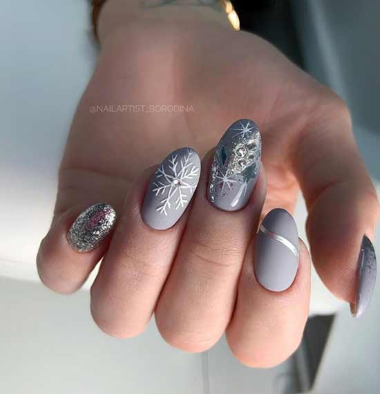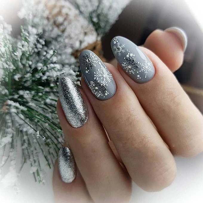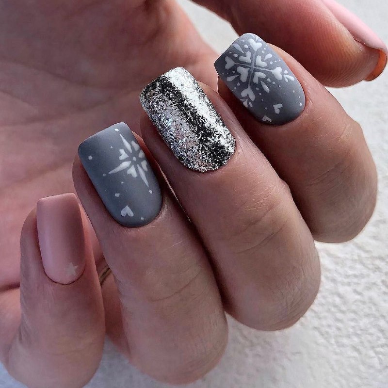 Думаете серый маникюр — это скучно? Точно нет! Серый цвет отлично подходит к любому образу в одежде — от офисного костюма до рваных джинсов. Отлично смотрятся матовые серые ноготки с белыми зимними узорами и яркими блестящими снежинками.