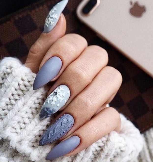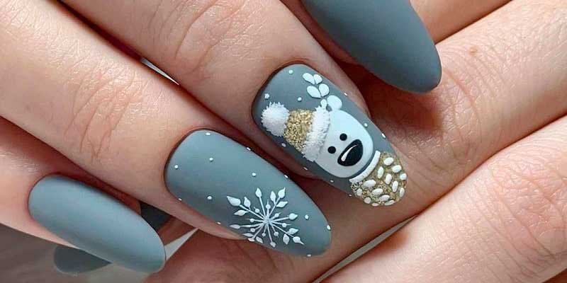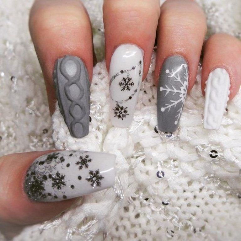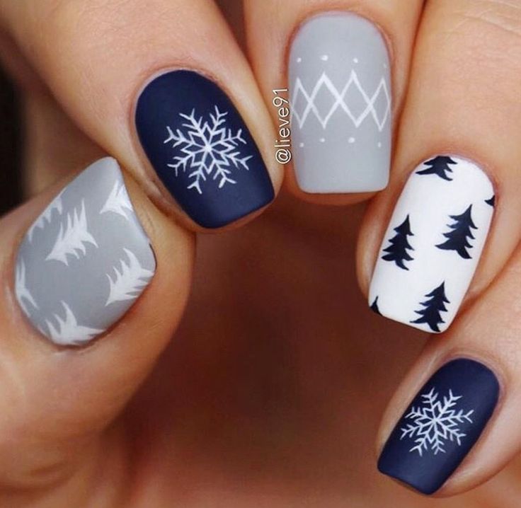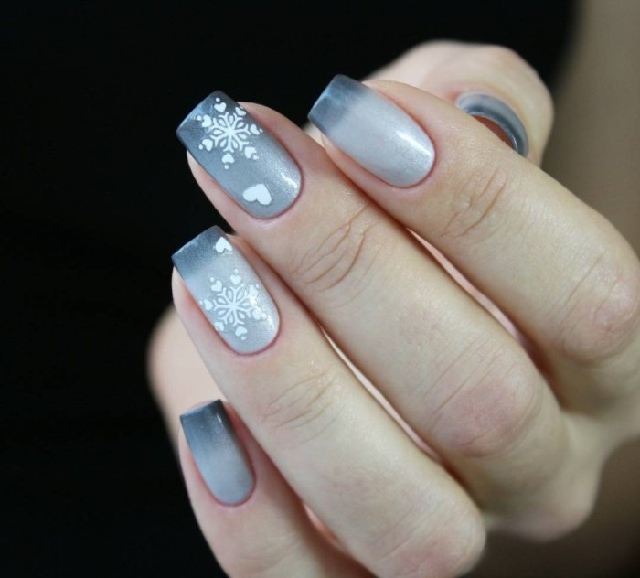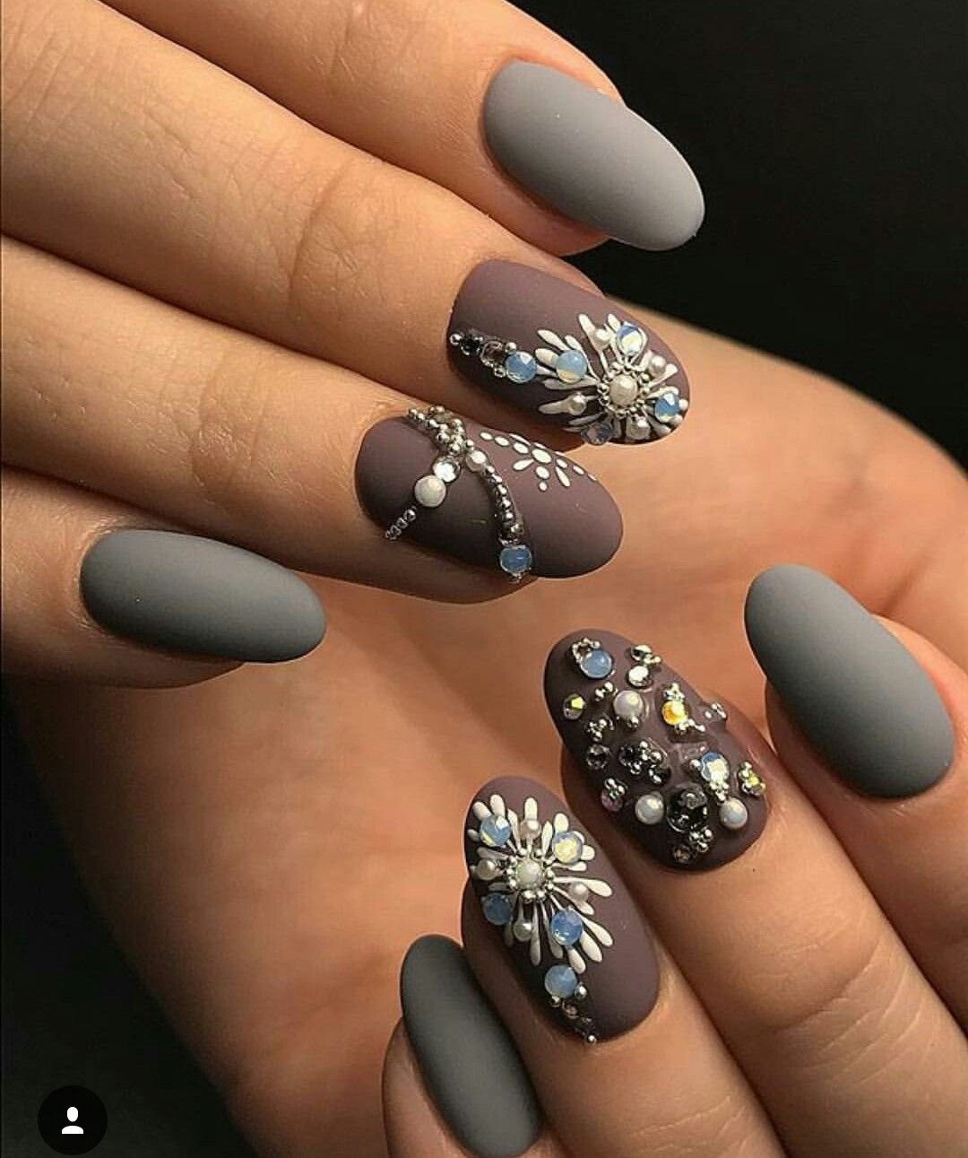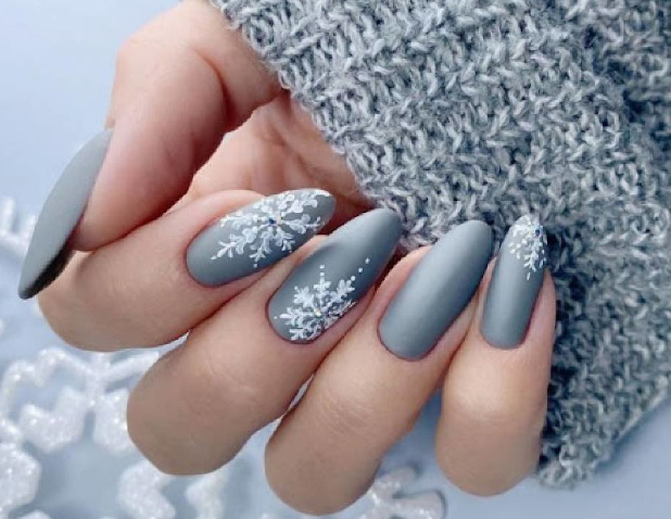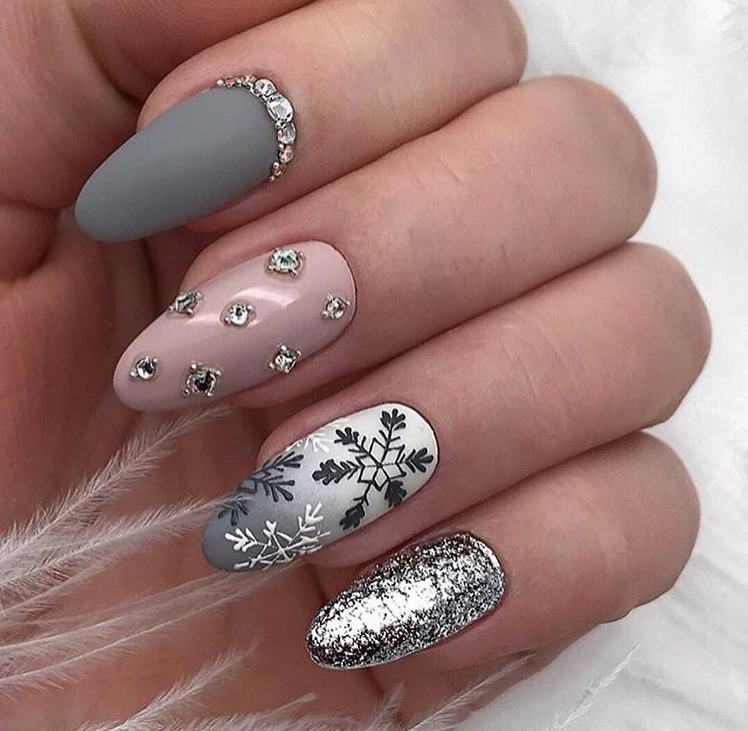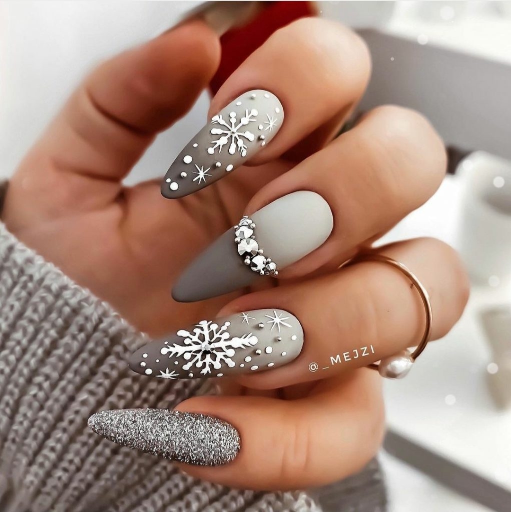 Думаете серый маникюр — это скучно? Точно нет! Серый цвет отлично подходит к любому образу в одежде — от офисного костюма до рваных джинсов. Отлично смотрятся матовые серые ноготки с белыми зимними узорами и яркими блестящими снежинками.