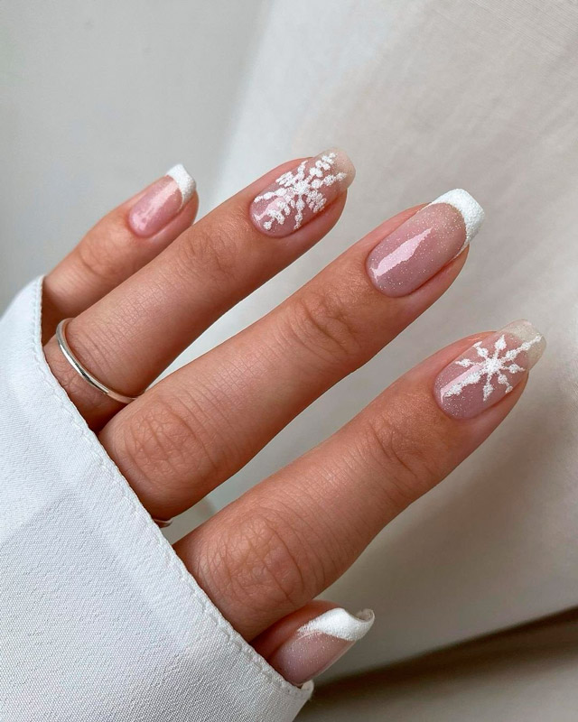 Французский маникюр — бессменная классика. Вы можете отдать предпочтение классическому варианту френча — прозрачная основа и белая улыбка. Просто добавьте на один или два ноготка рисунок снежинки и, например, добавьте блестящий акцент — стразы.