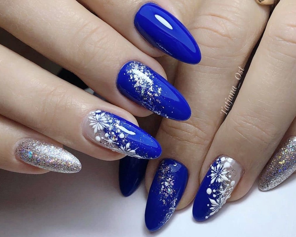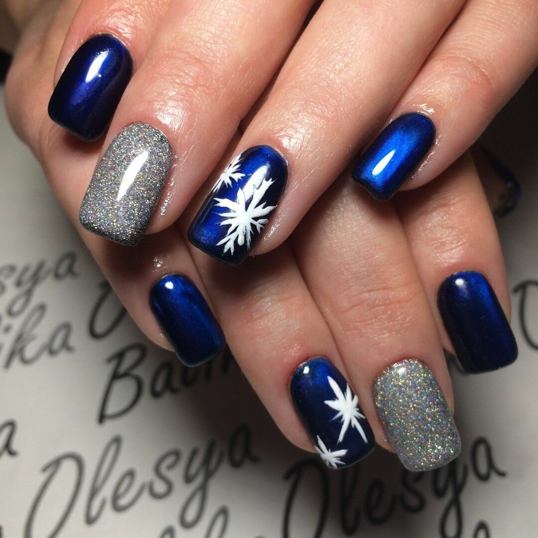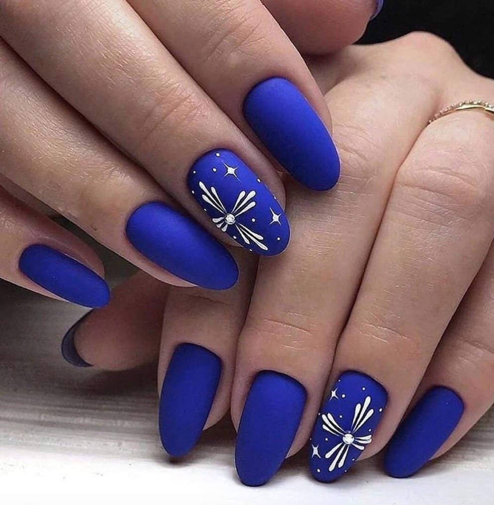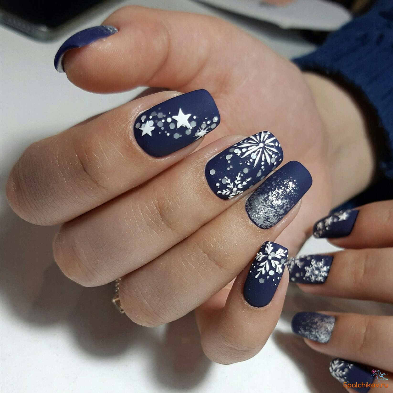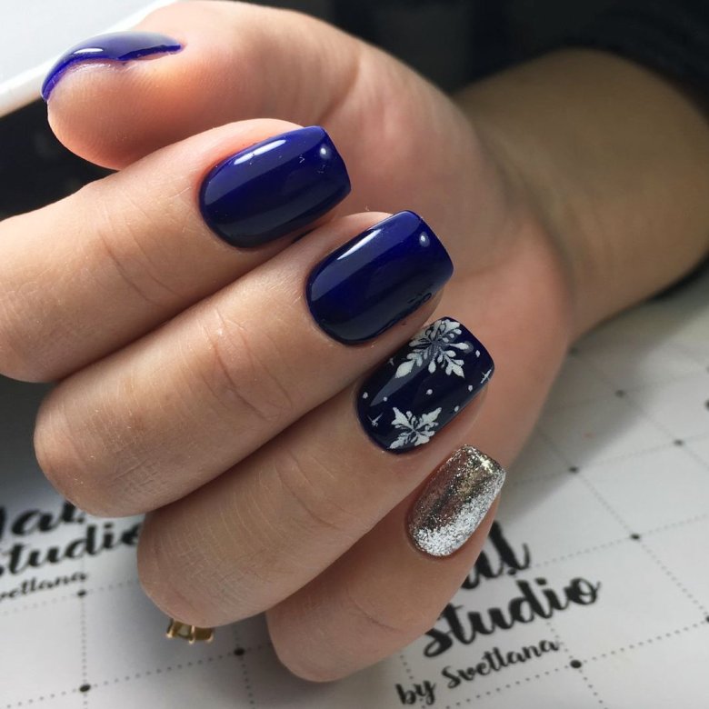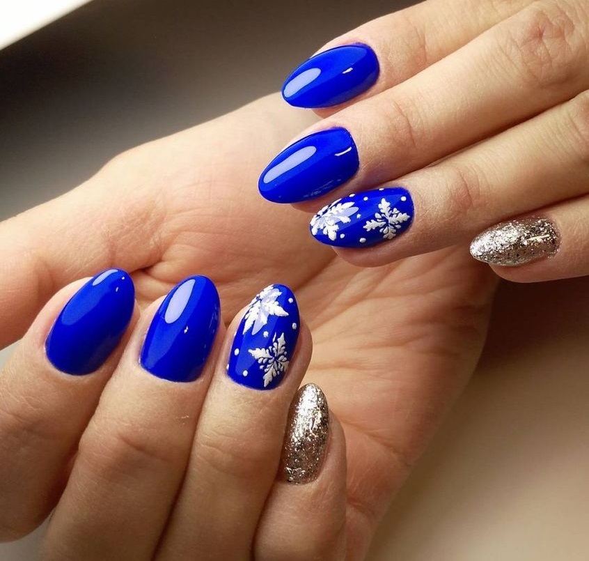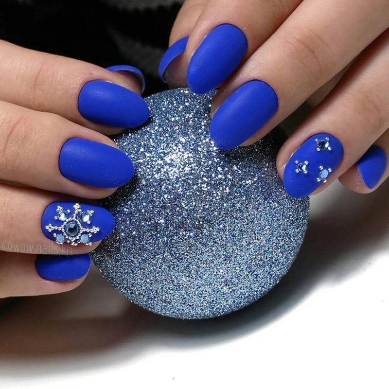 Королевский синий или индиго — на пике популярности в этом сезоне. Матовая текстура и глубокий оттенок лака выглядит стильно и дорого. Декор в виде снеговиков, белых зимних узоров, шариков и елки — вот отличное дополнение для блестящих снежинок на ногтях.