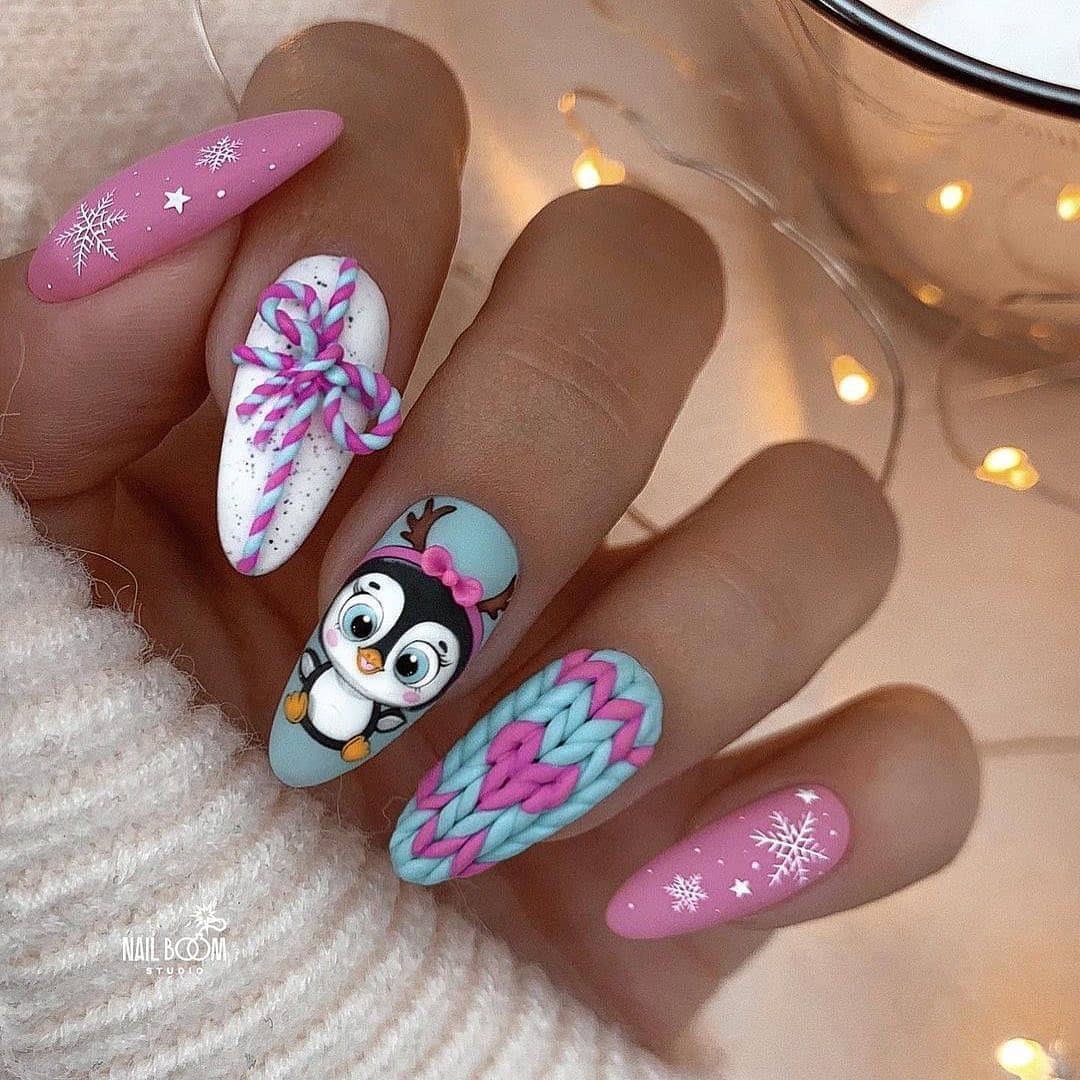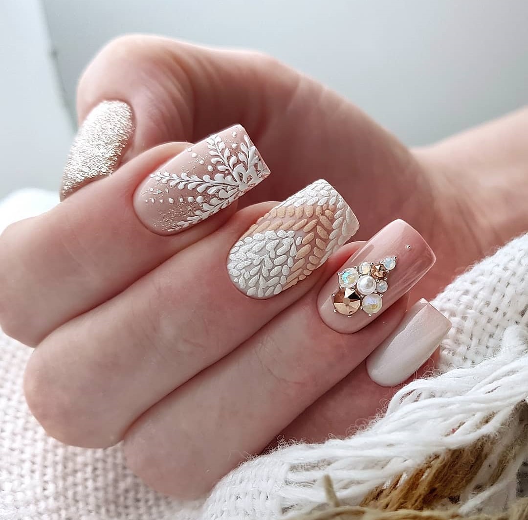 Какие ассоциации вызывает зима? Теплые вязаные вещи, горячие напитки, пледы и снег. Вязаный дизайн — один из самых востребованных в зимний период. Если дополнить такой декор рисунком снежинки, получится настоящий новогодний дизайн ногтей.