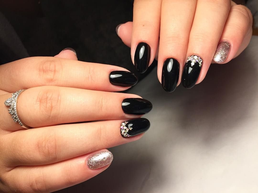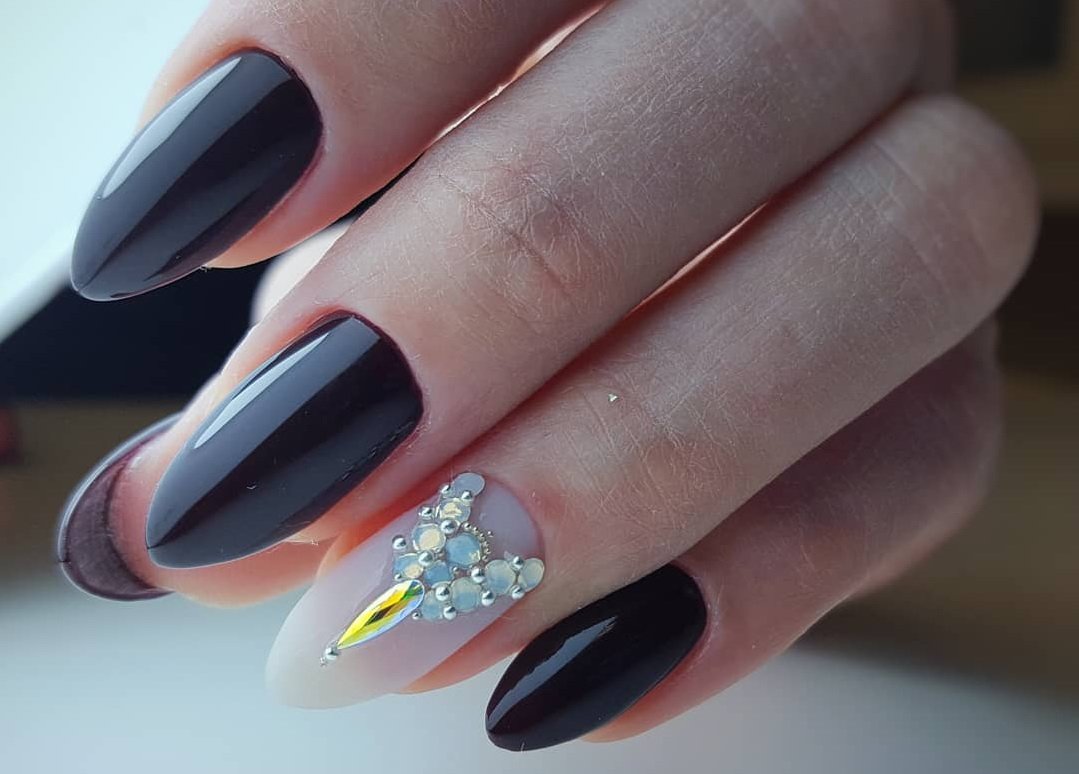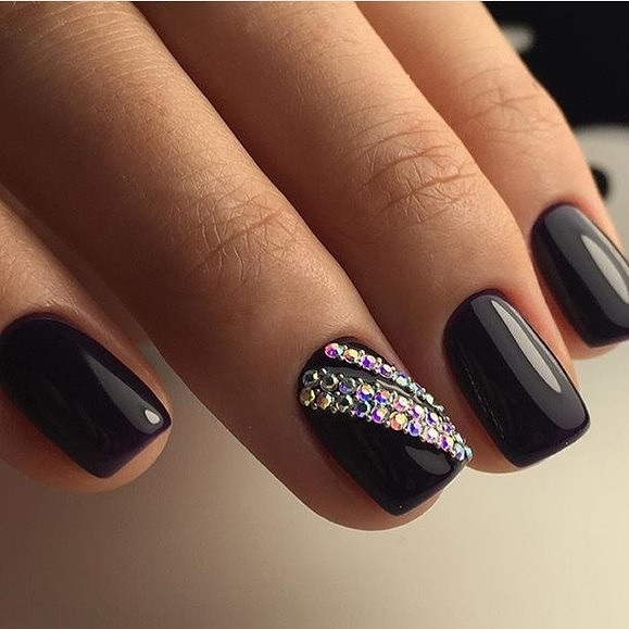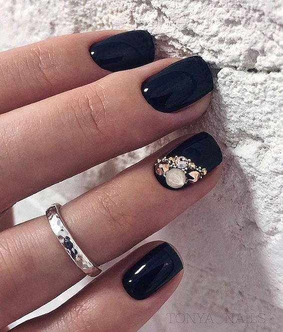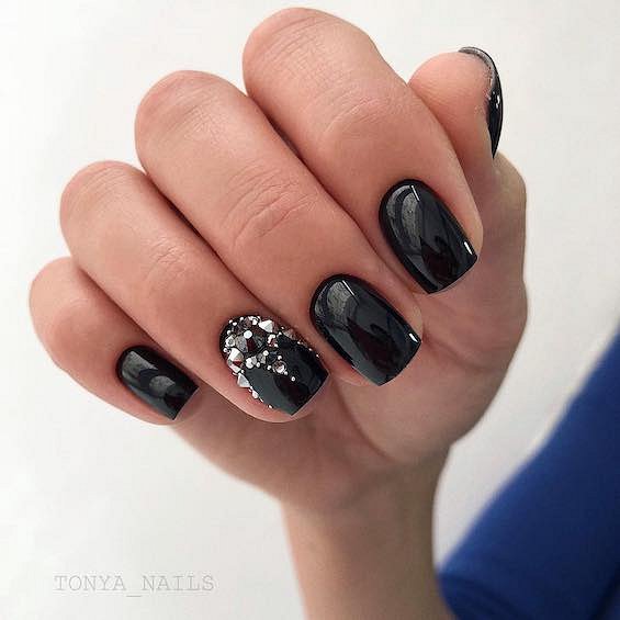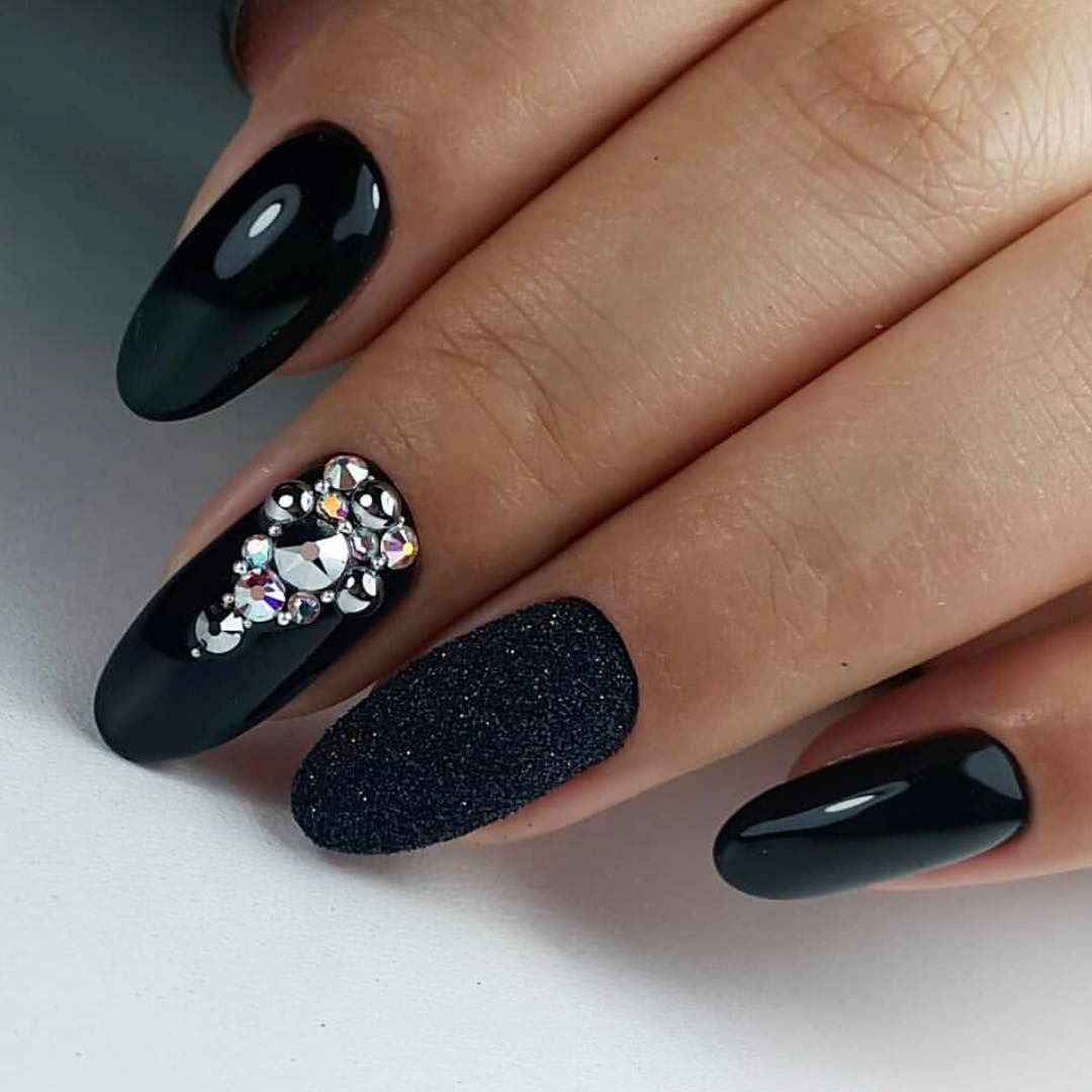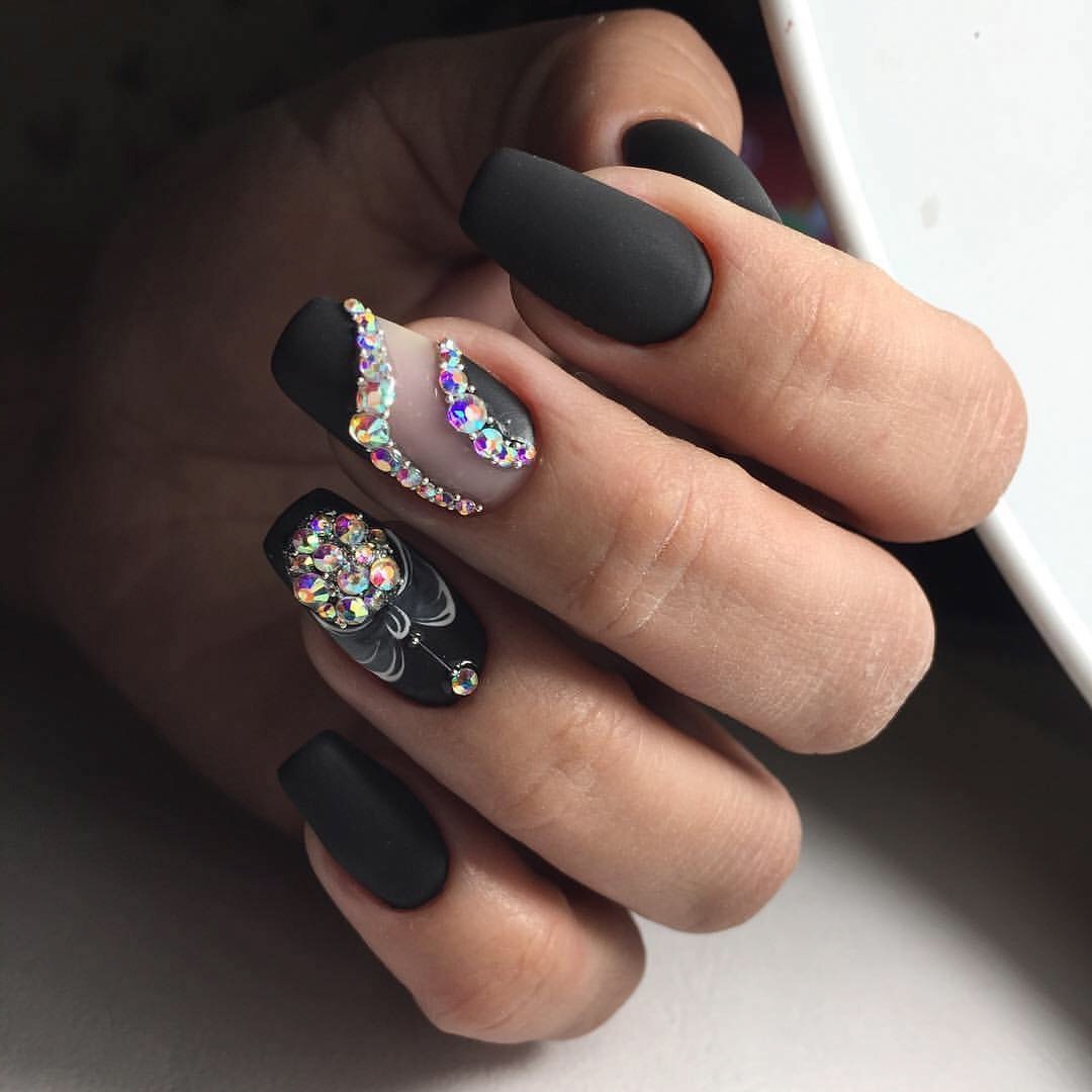 Если вы фанатка декора со стразами, обязательно сделайте черный маникюр. Он выгодно оттеняет блеск камней и декор будет заметным, не потеряется на фоне яркого цвета. Рекомендуем сочетать камни с матовой текстурой, чтобы они солировали в дизайне.