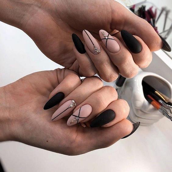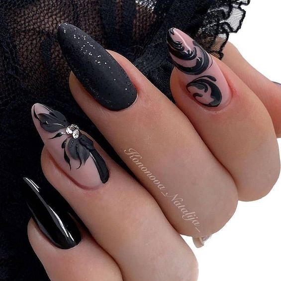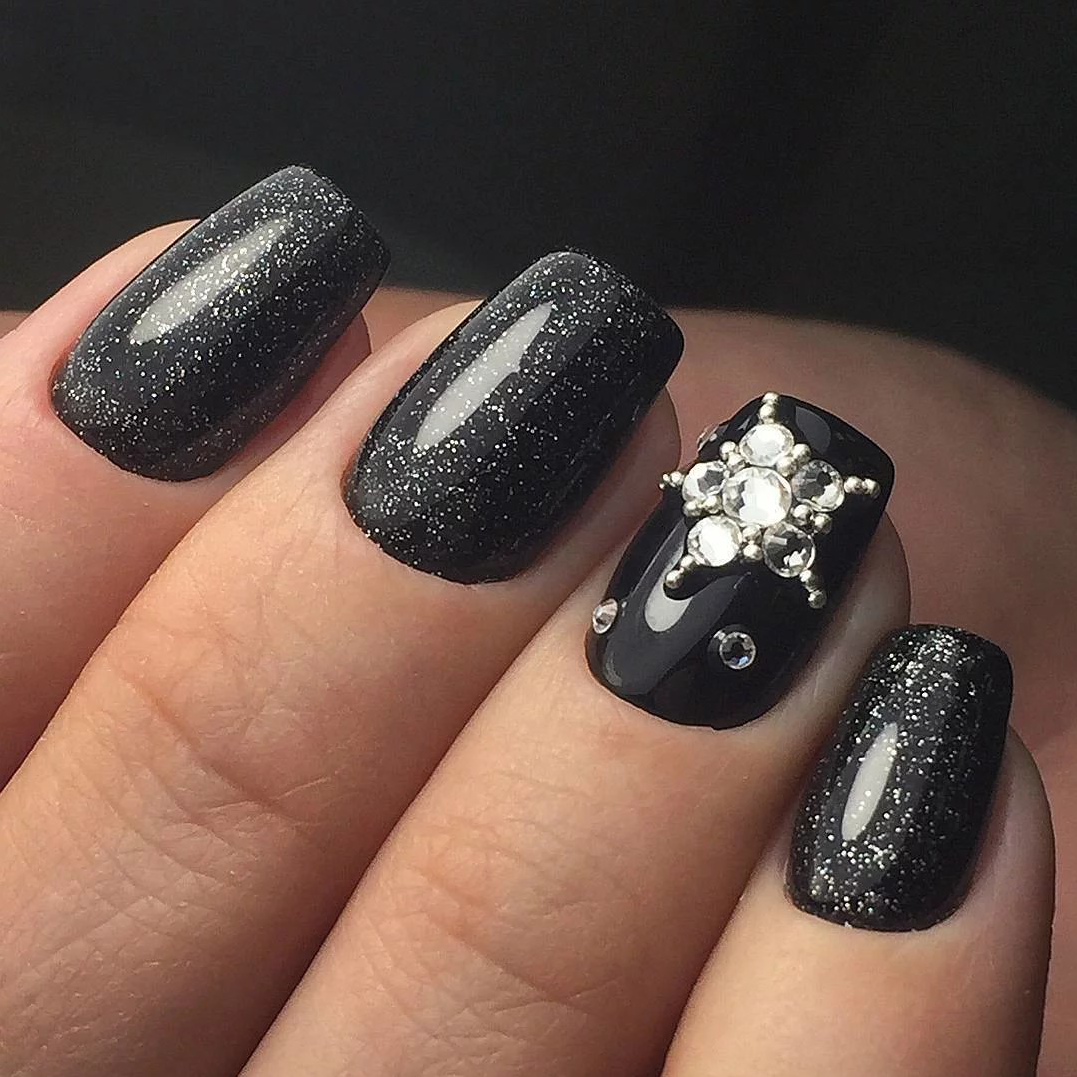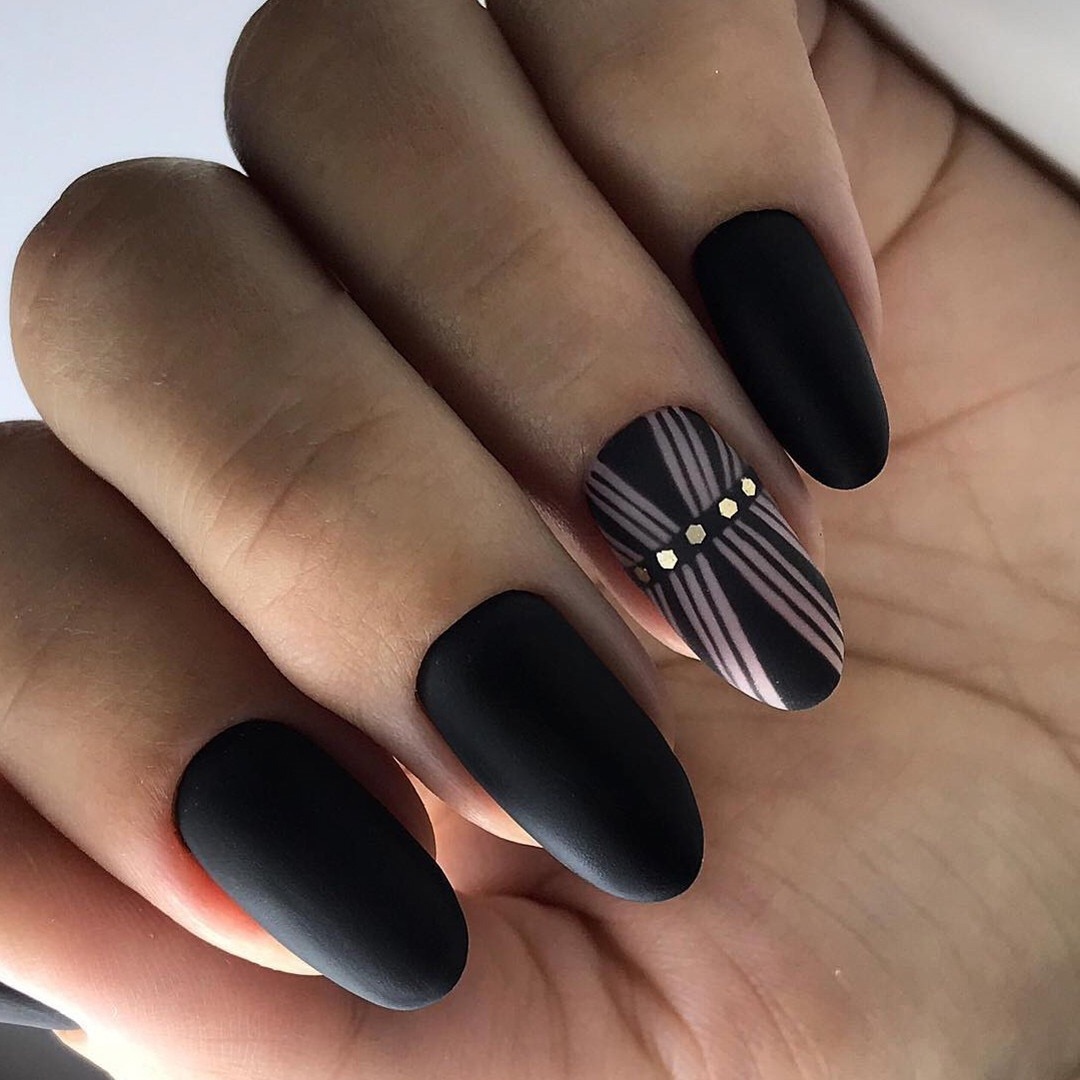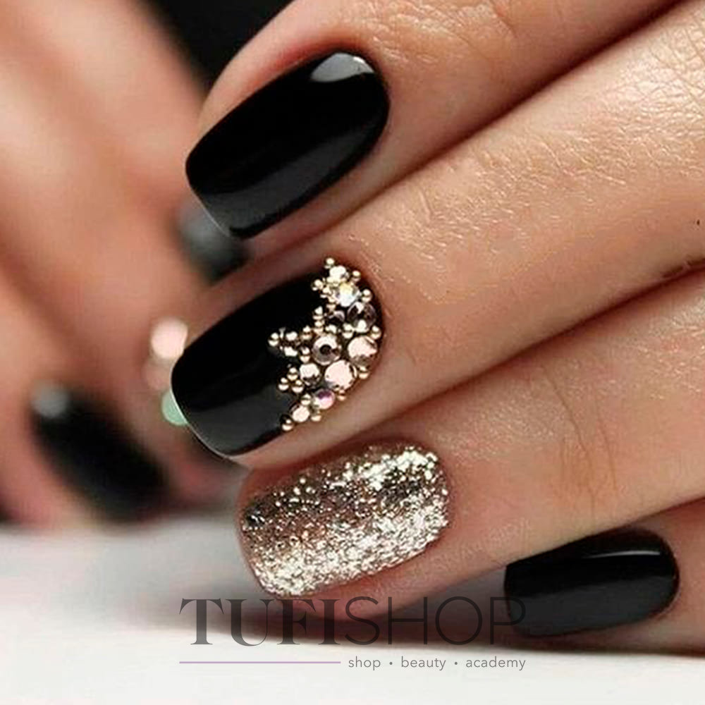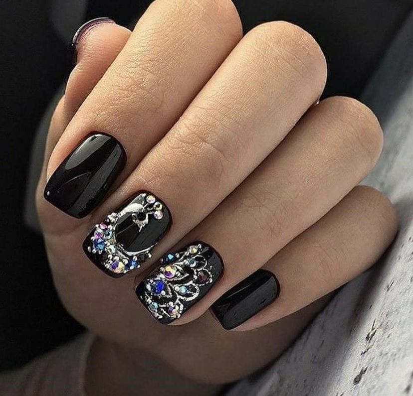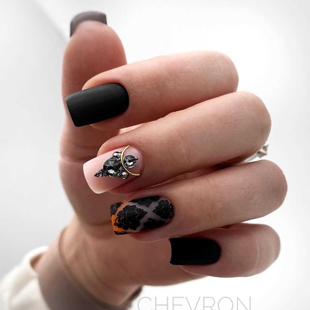 Если вы фанатка декора со стразами, обязательно сделайте черный маникюр. Он выгодно оттеняет блеск камней и декор будет заметным, не потеряется на фоне яркого цвета. Рекомендуем сочетать камни с матовой текстурой, чтобы они солировали в дизайне.