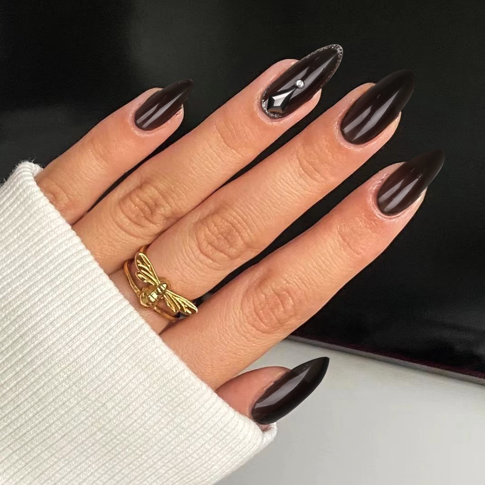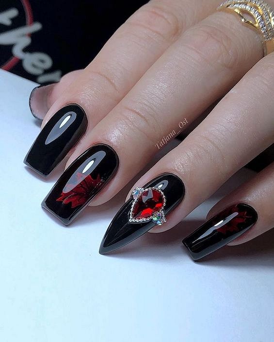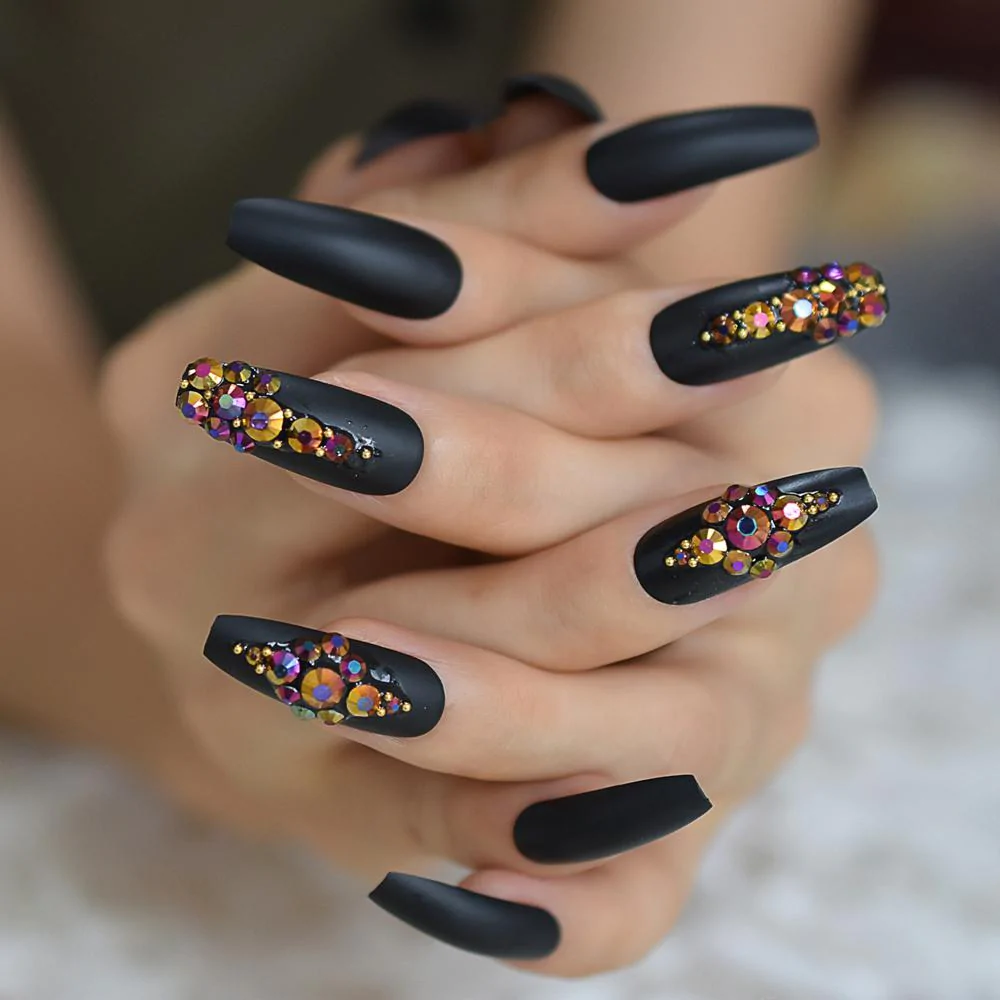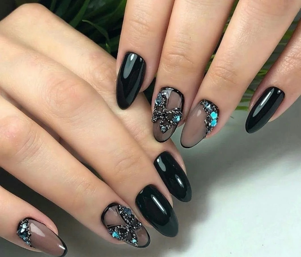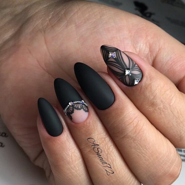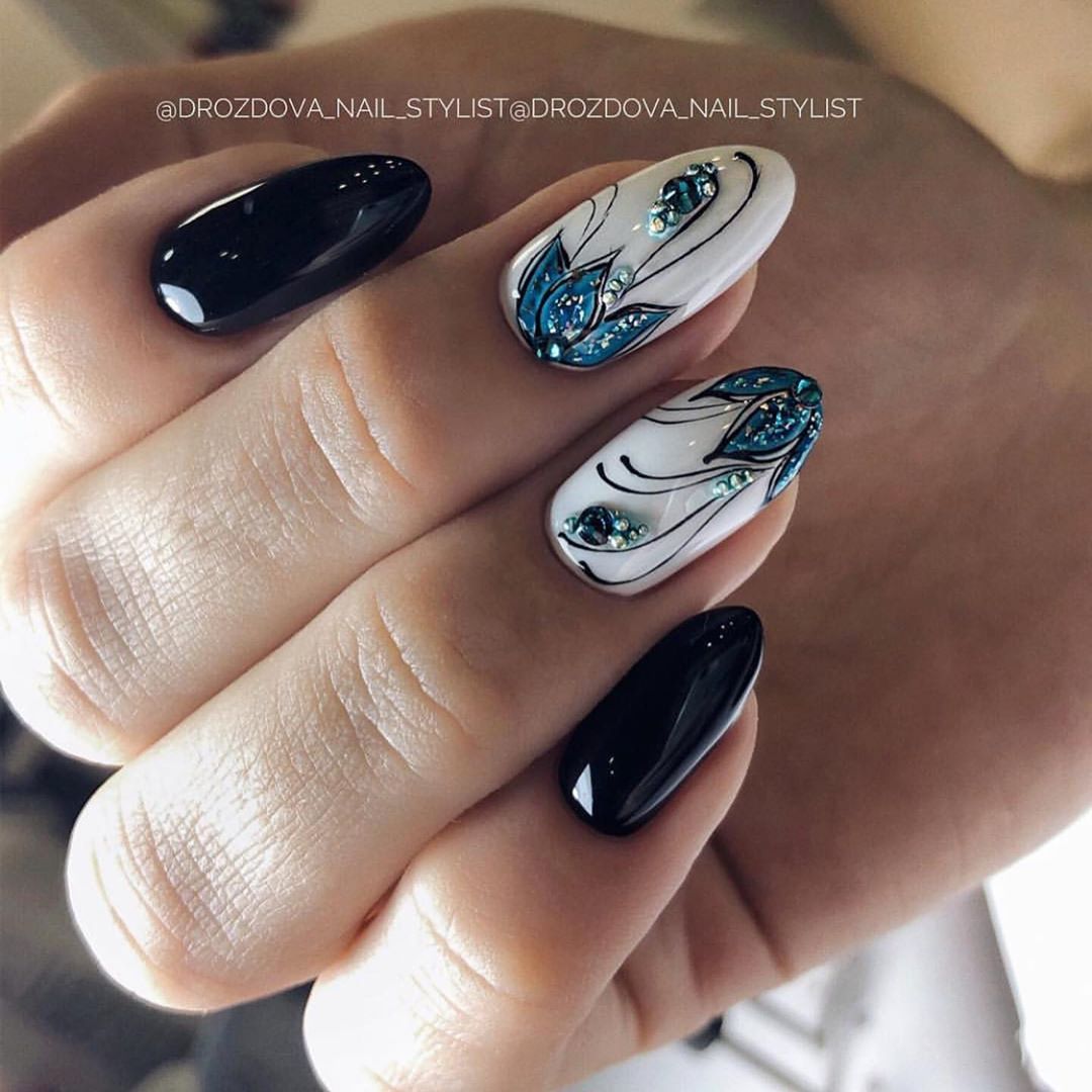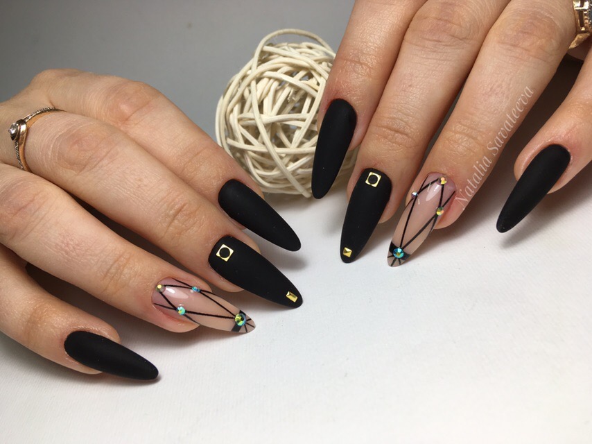 Если вы фанатка декора со стразами, обязательно сделайте черный маникюр. Он выгодно оттеняет блеск камней и декор будет заметным, не потеряется на фоне яркого цвета. Рекомендуем сочетать камни с матовой текстурой, чтобы они солировали в дизайне.