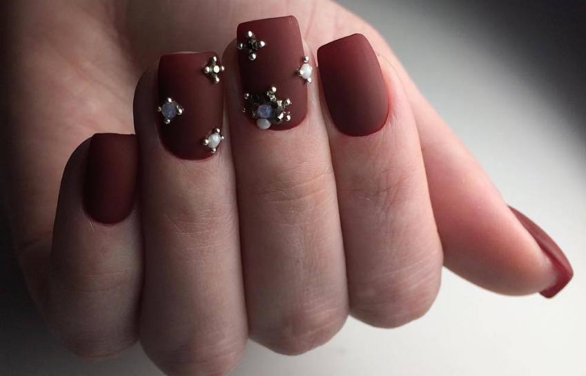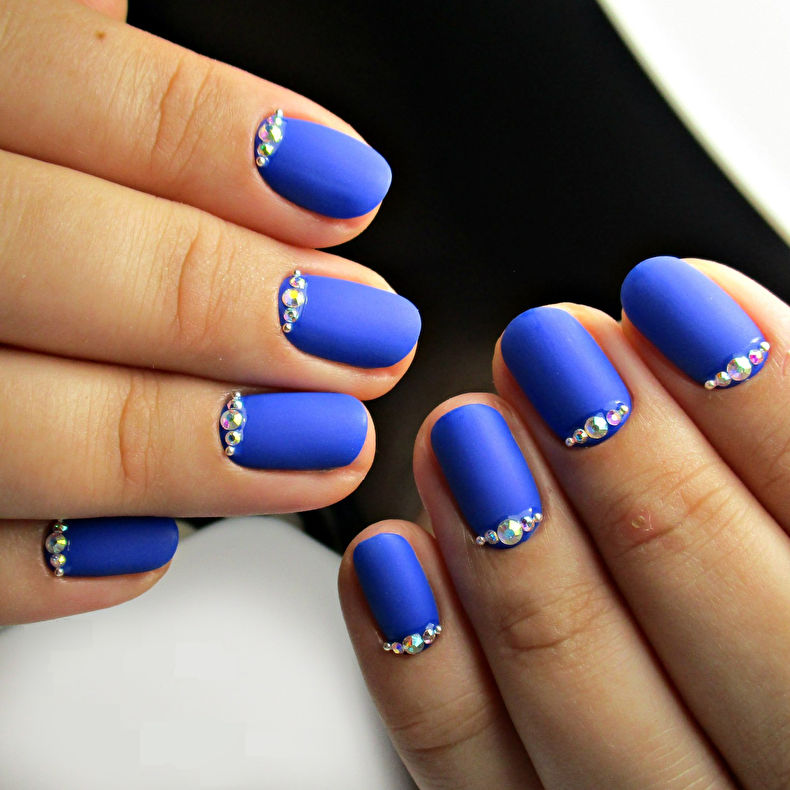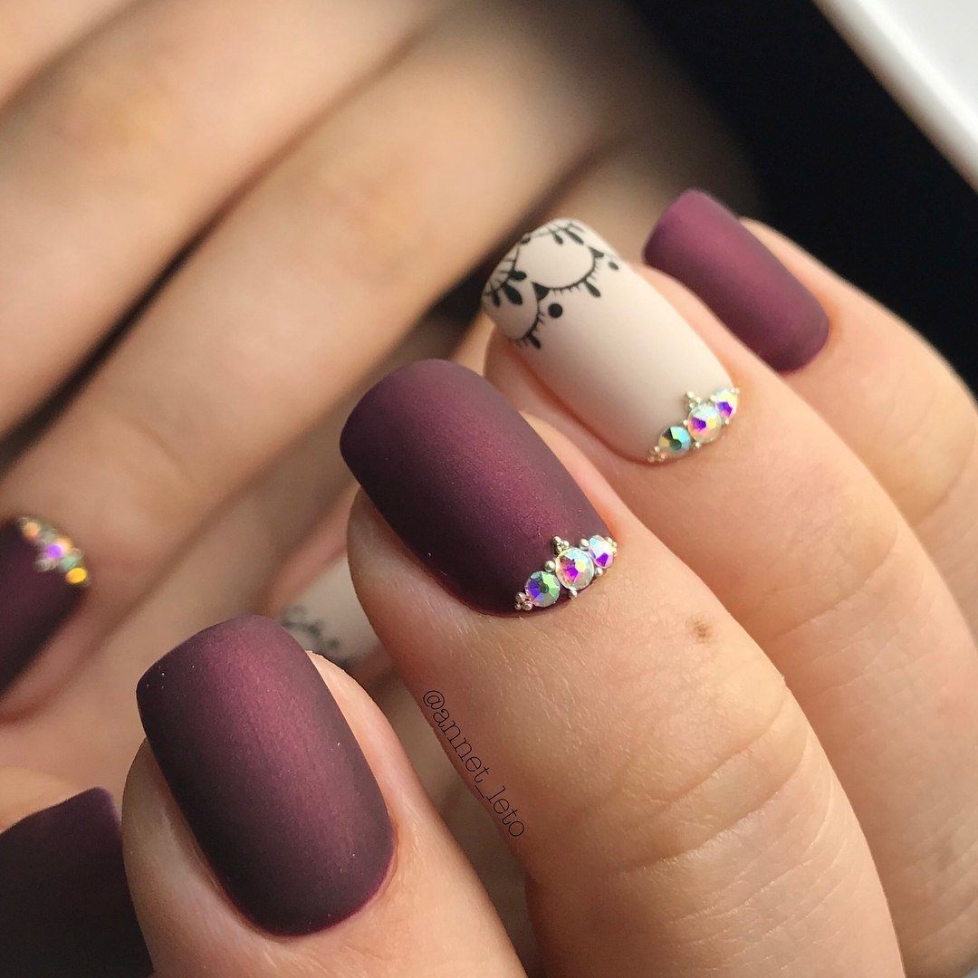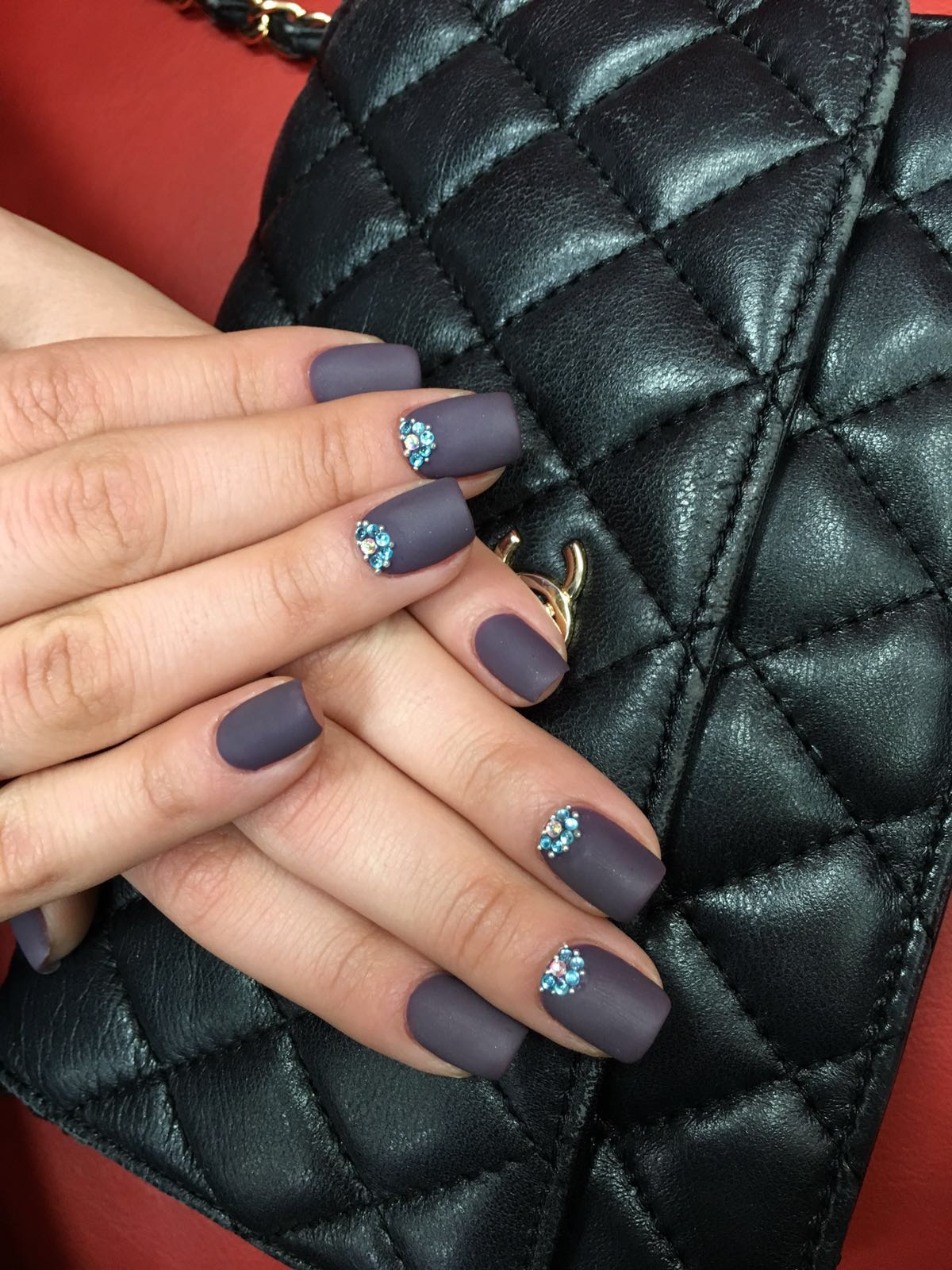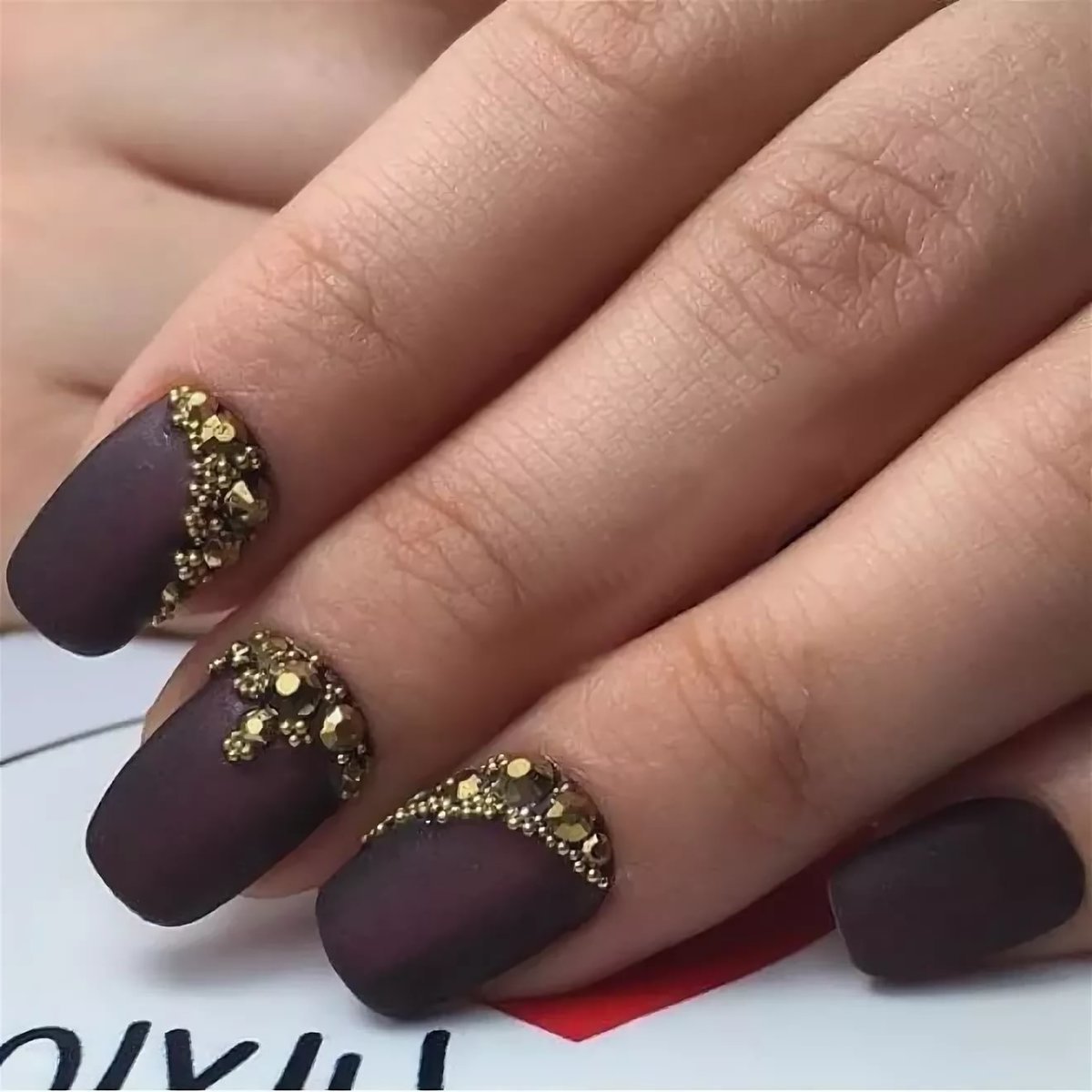 Выразительнее всего матовый маникюр выглядит в темном сочном оттенке — черном, синем, винном, шоколадном. Стразы могут быть контрастными или, наоборот, сочетаться по оттенку с цветом ноготка.