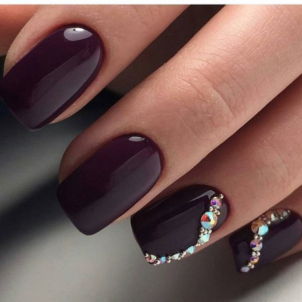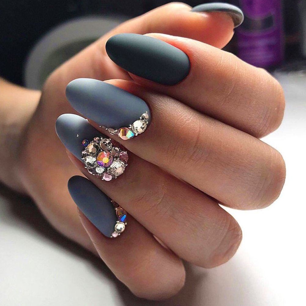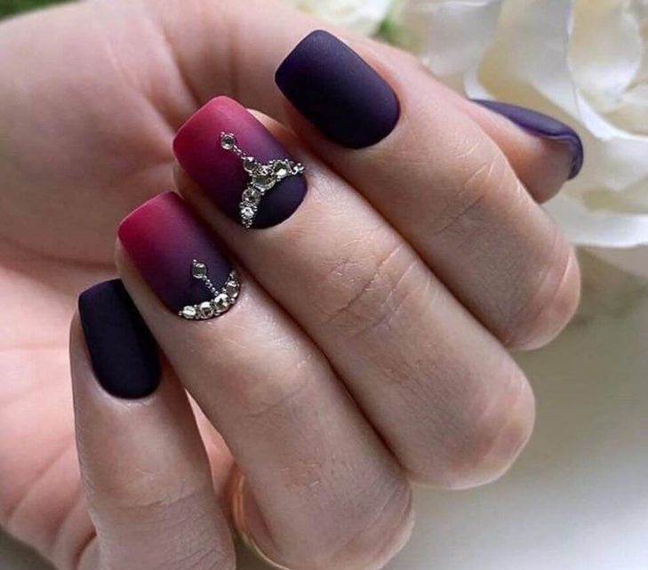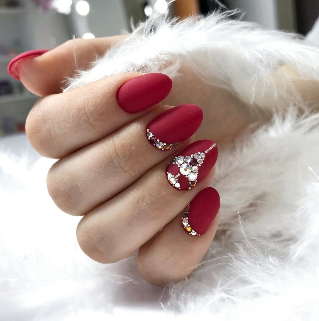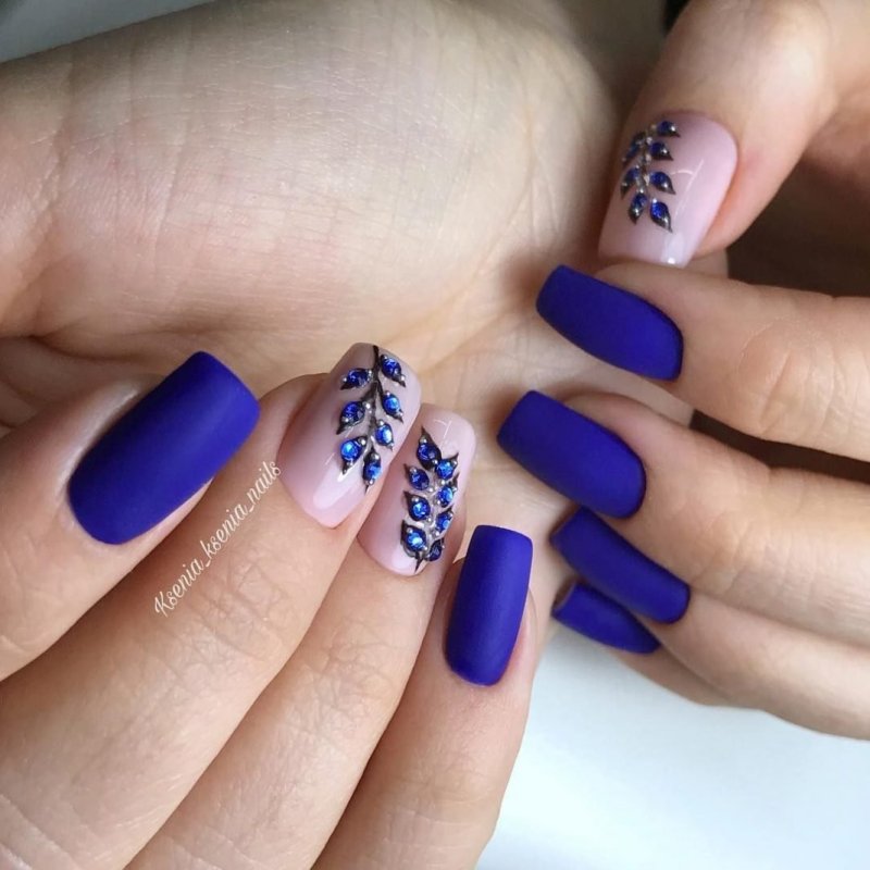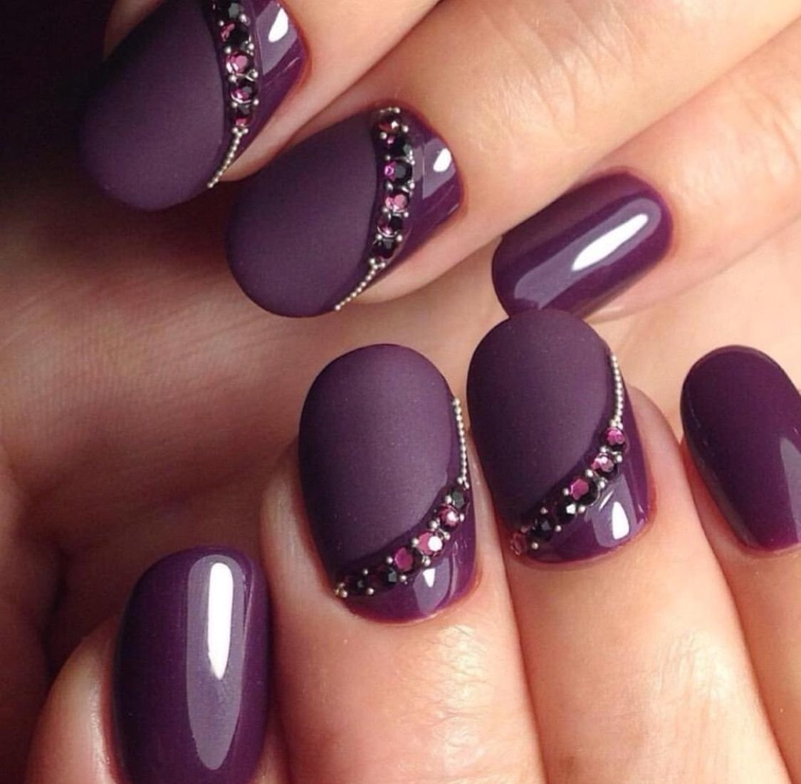 Выразительнее всего матовый маникюр выглядит в темном сочном оттенке — черном, синем, винном, шоколадном. Стразы могут быть контрастными или, наоборот, сочетаться по оттенку с цветом ноготка.