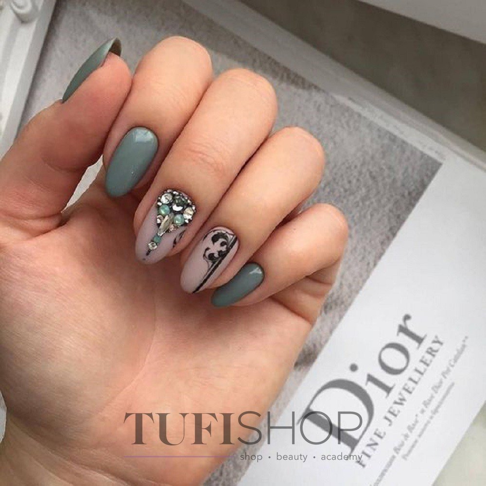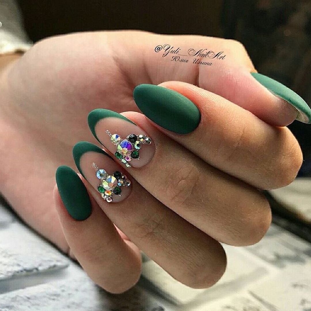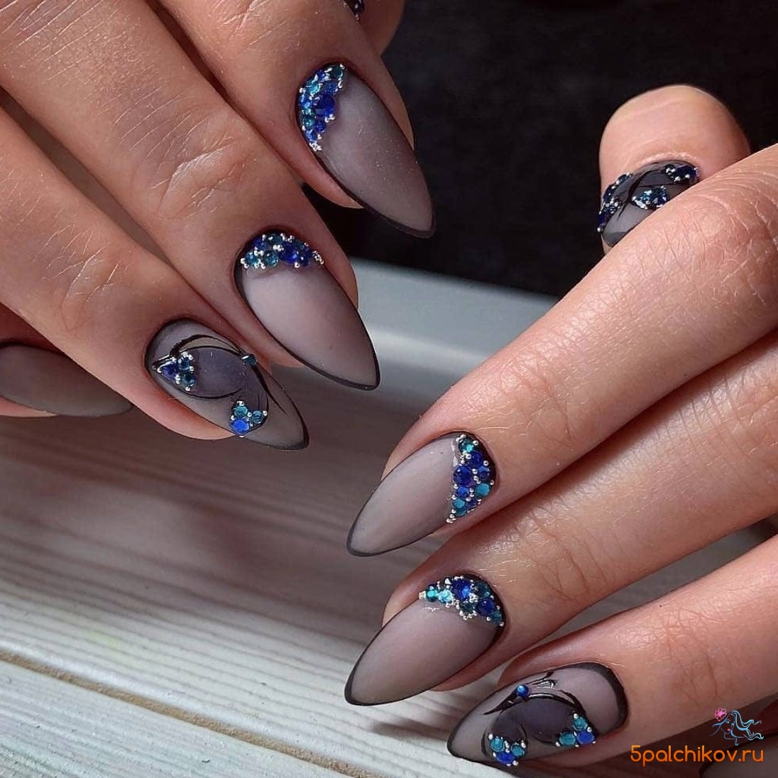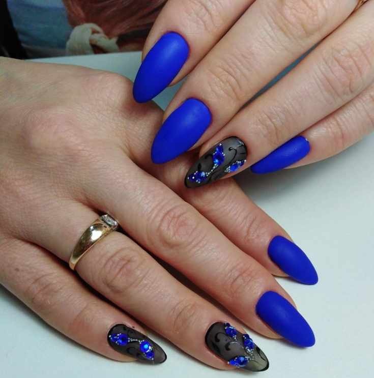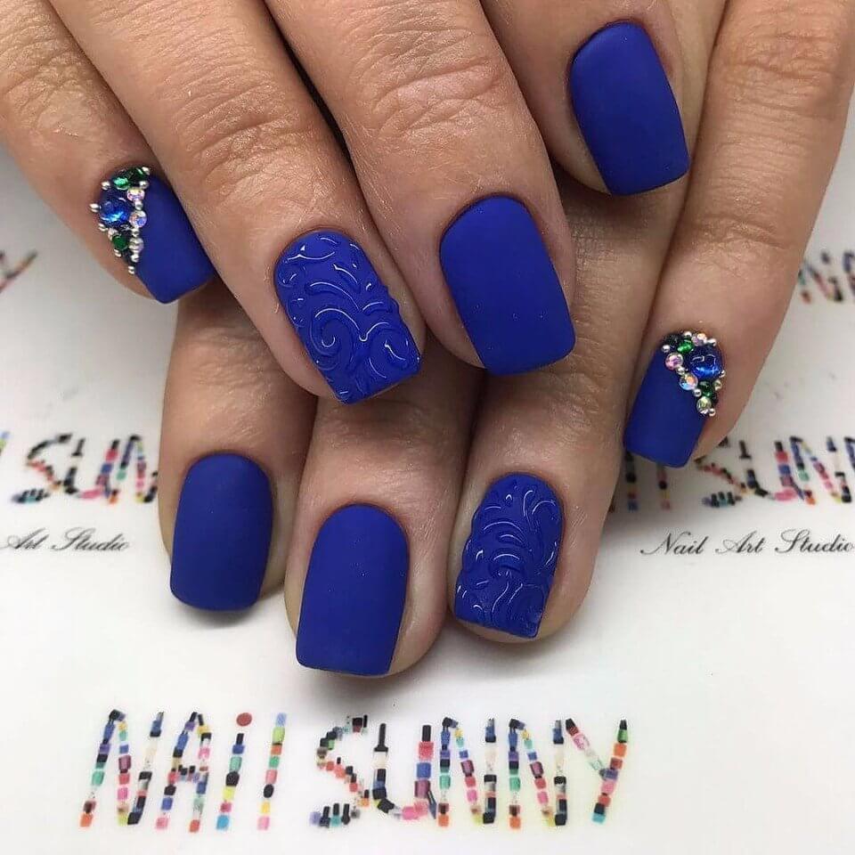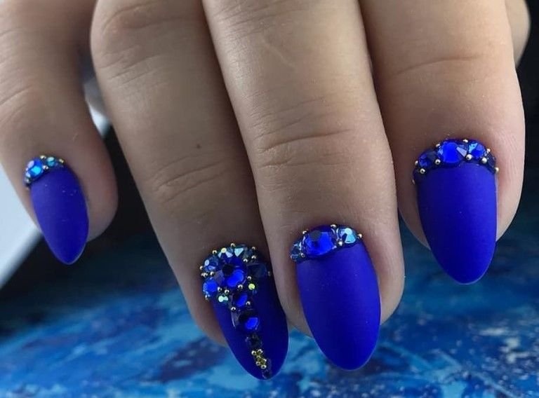 Выразительнее всего матовый маникюр выглядит в темном сочном оттенке — черном, синем, винном, шоколадном. Стразы могут быть контрастными или, наоборот, сочетаться по оттенку с цветом ноготка.