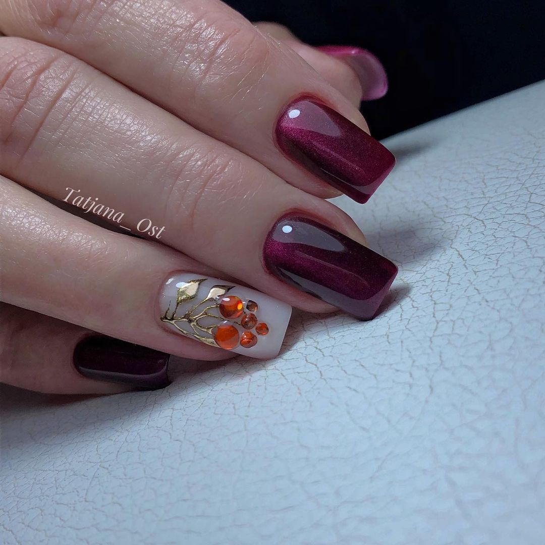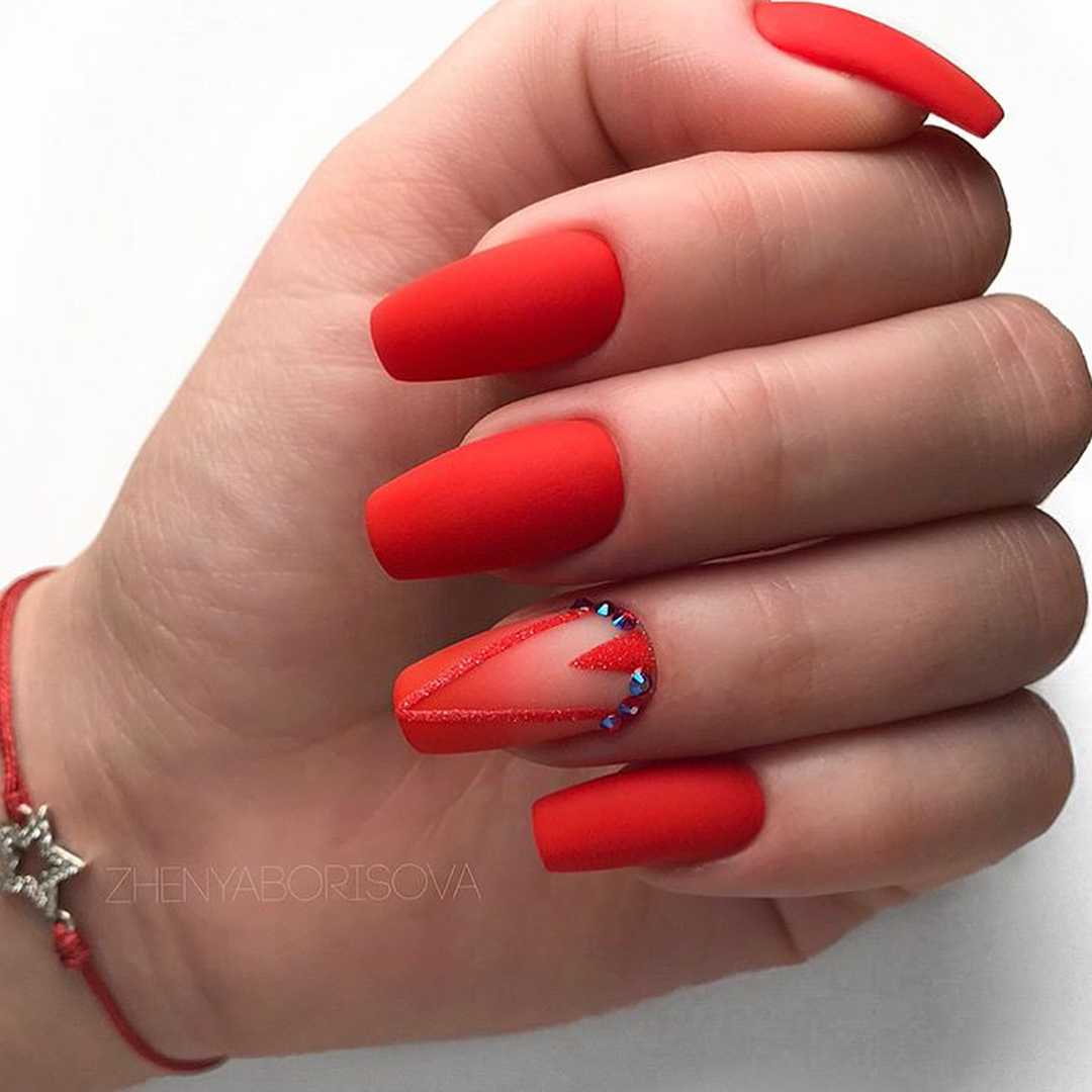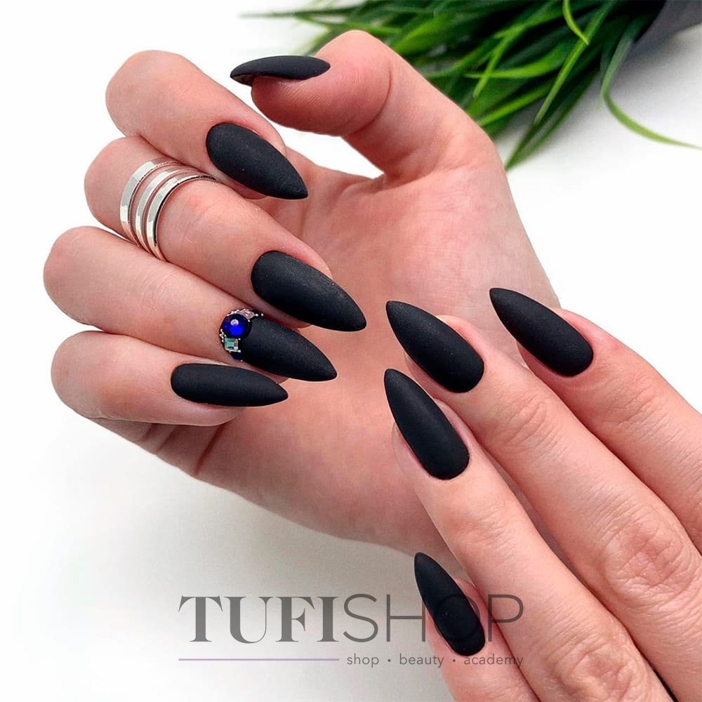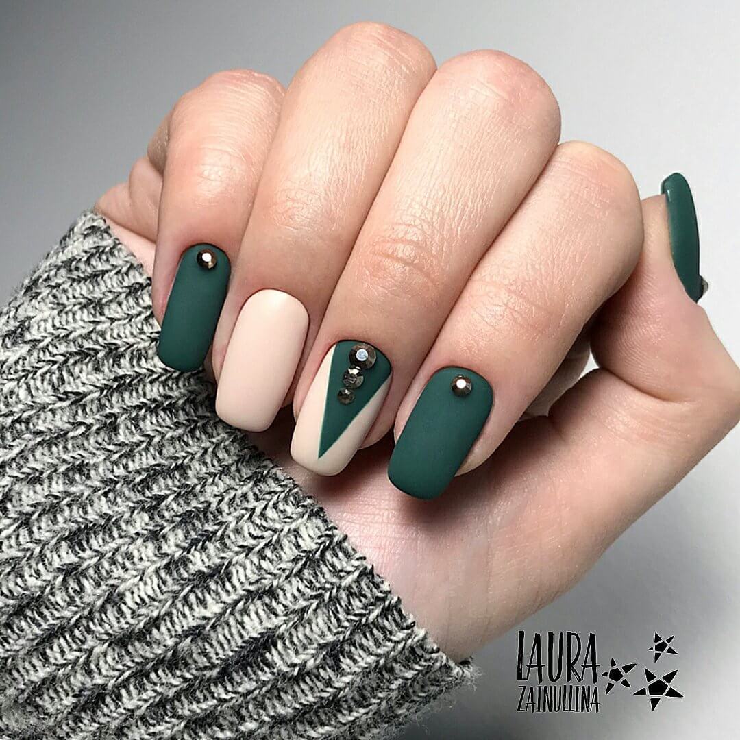 Выразительнее всего матовый маникюр выглядит в темном сочном оттенке — черном, синем, винном, шоколадном. Стразы могут быть контрастными или, наоборот, сочетаться по оттенку с цветом ноготка.