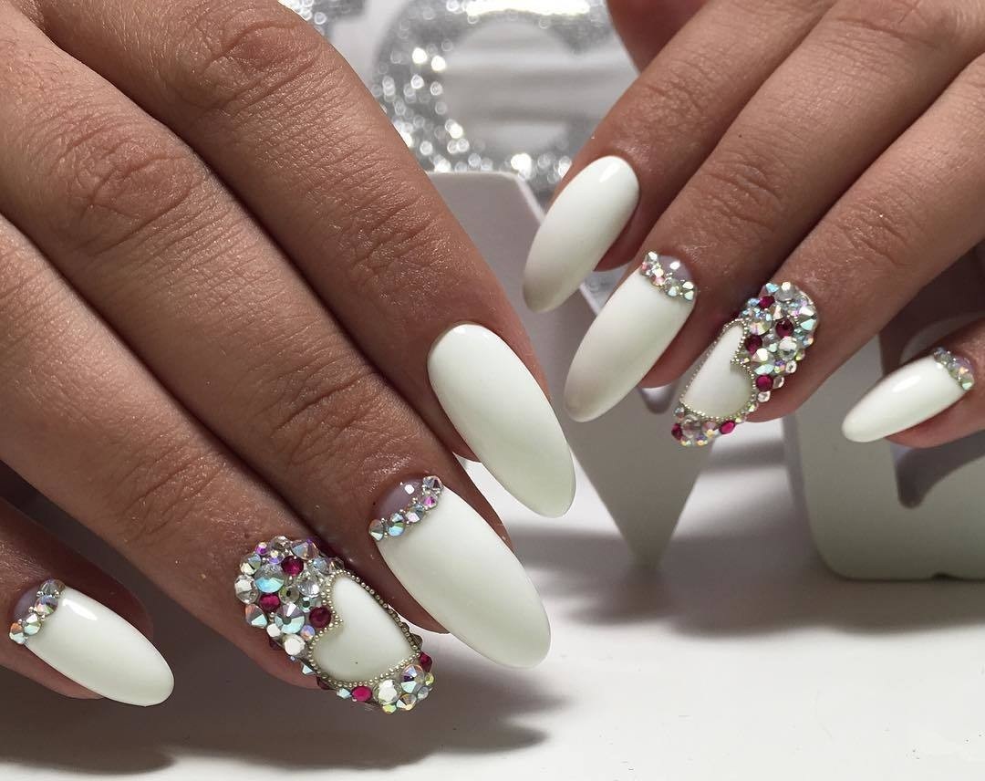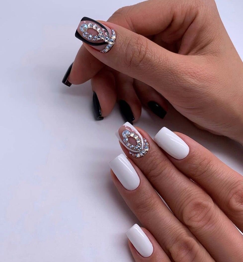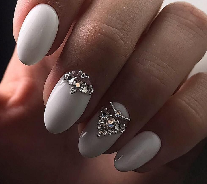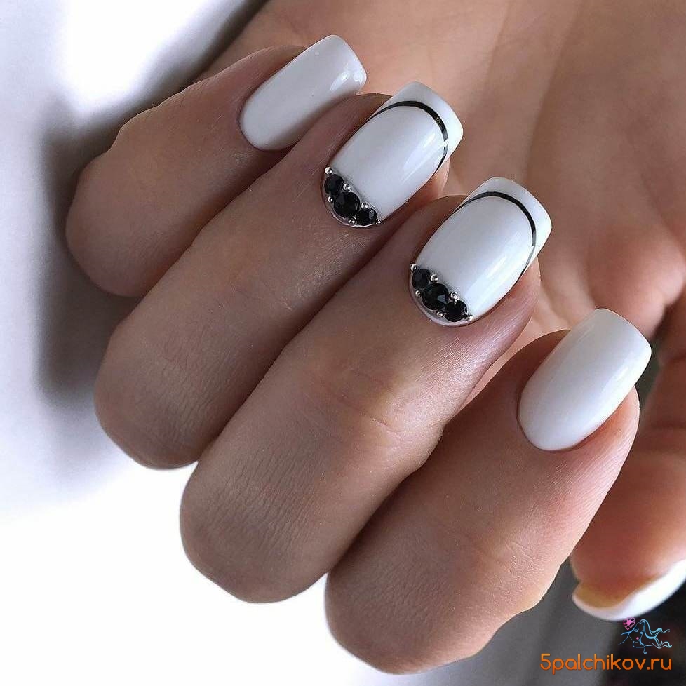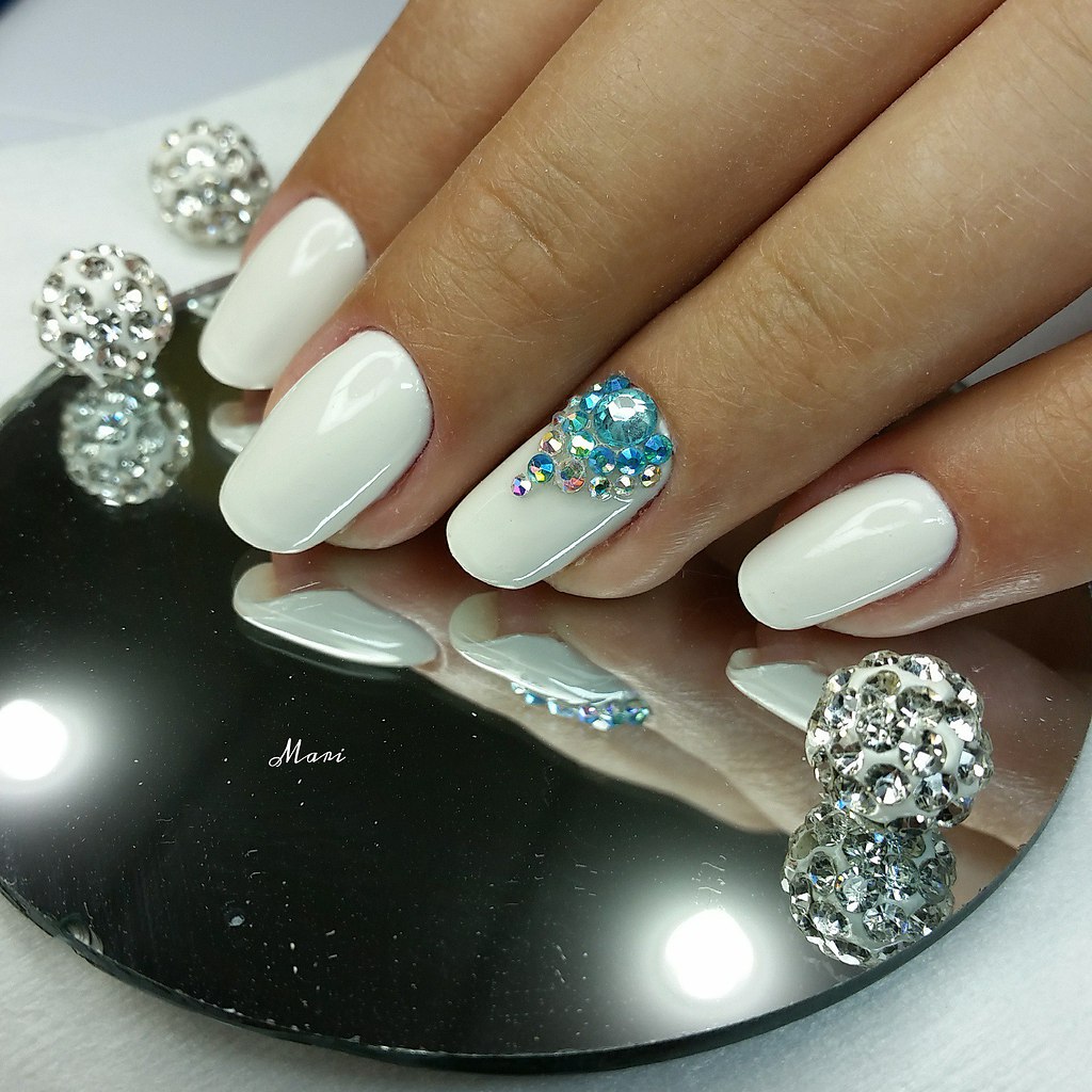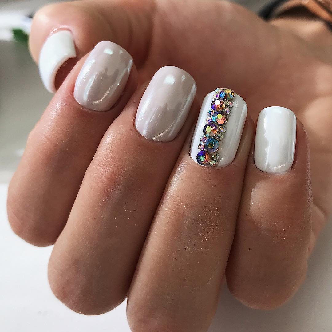 Еще один беспроигрышный вариант маникюра. Белый — это чистая база, на которой узор из камней смотрится свежо и интересно. И не стоит отдавать предпочтение только серебристым камням, выбирайте любой оттенок.