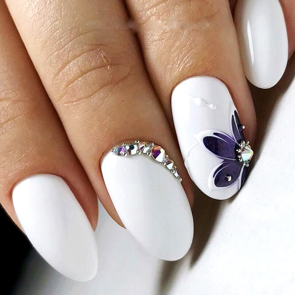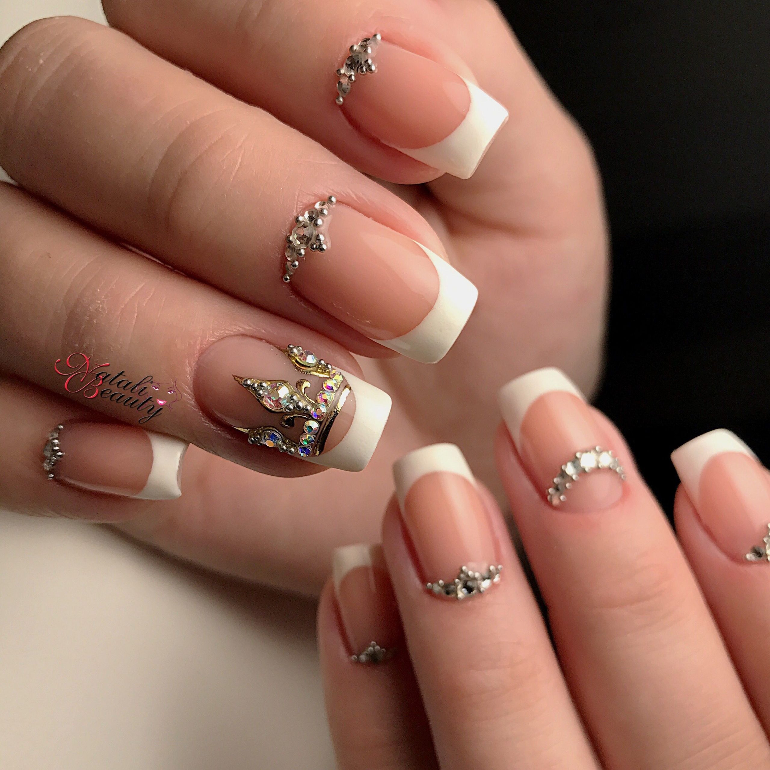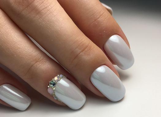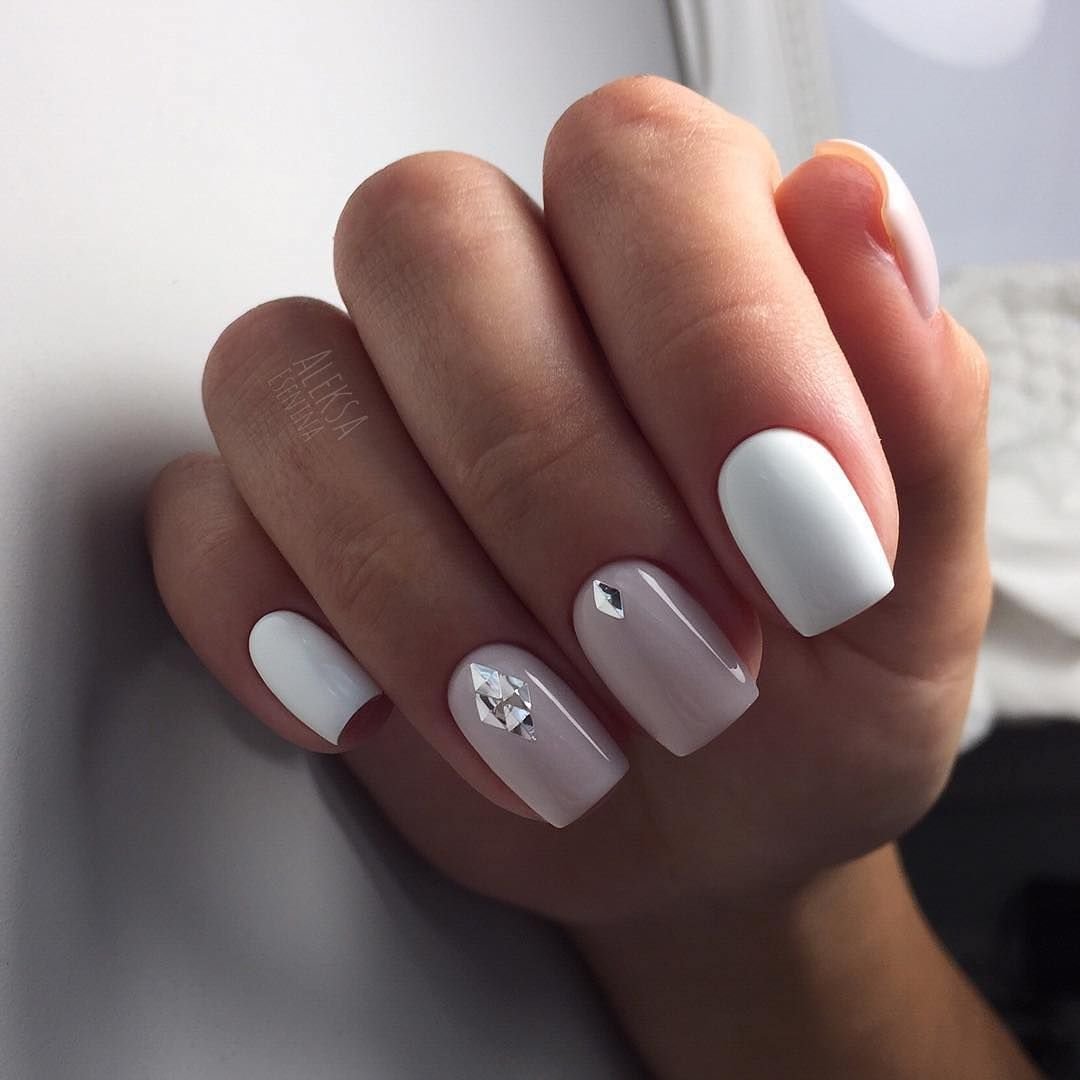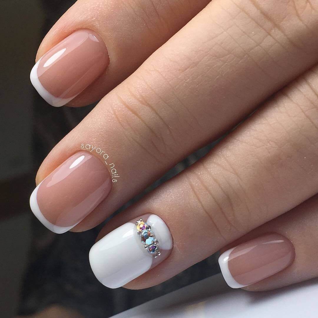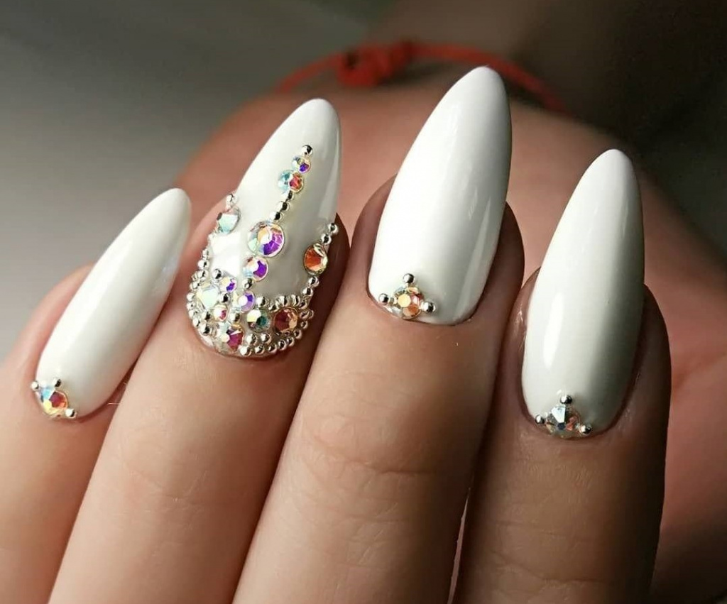 Еще один беспроигрышный вариант маникюра. Белый — это чистая база, на которой узор из камней смотрится свежо и интересно. И не стоит отдавать предпочтение только серебристым камням, выбирайте любой оттенок.
