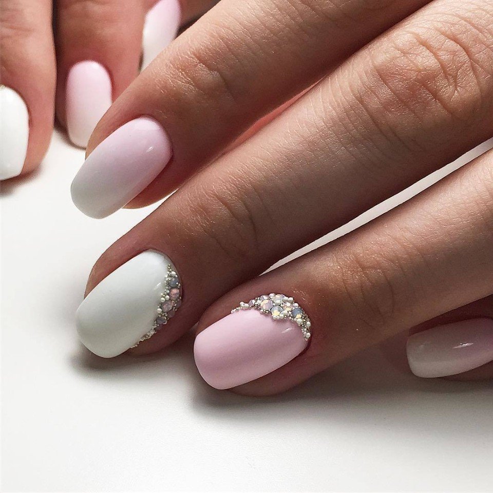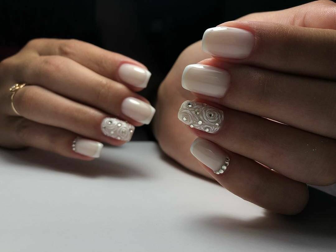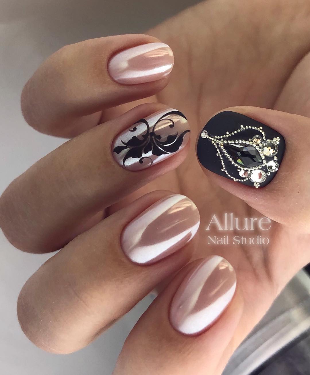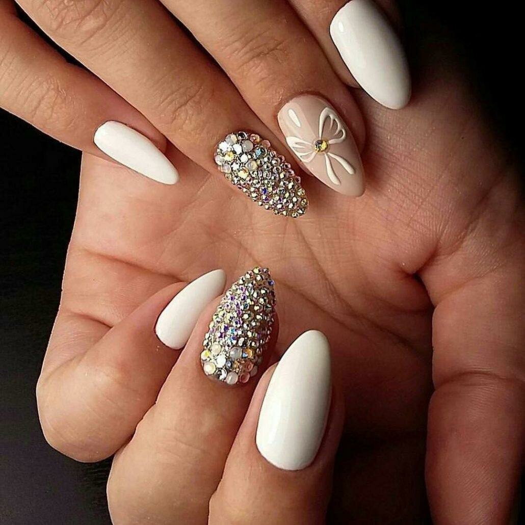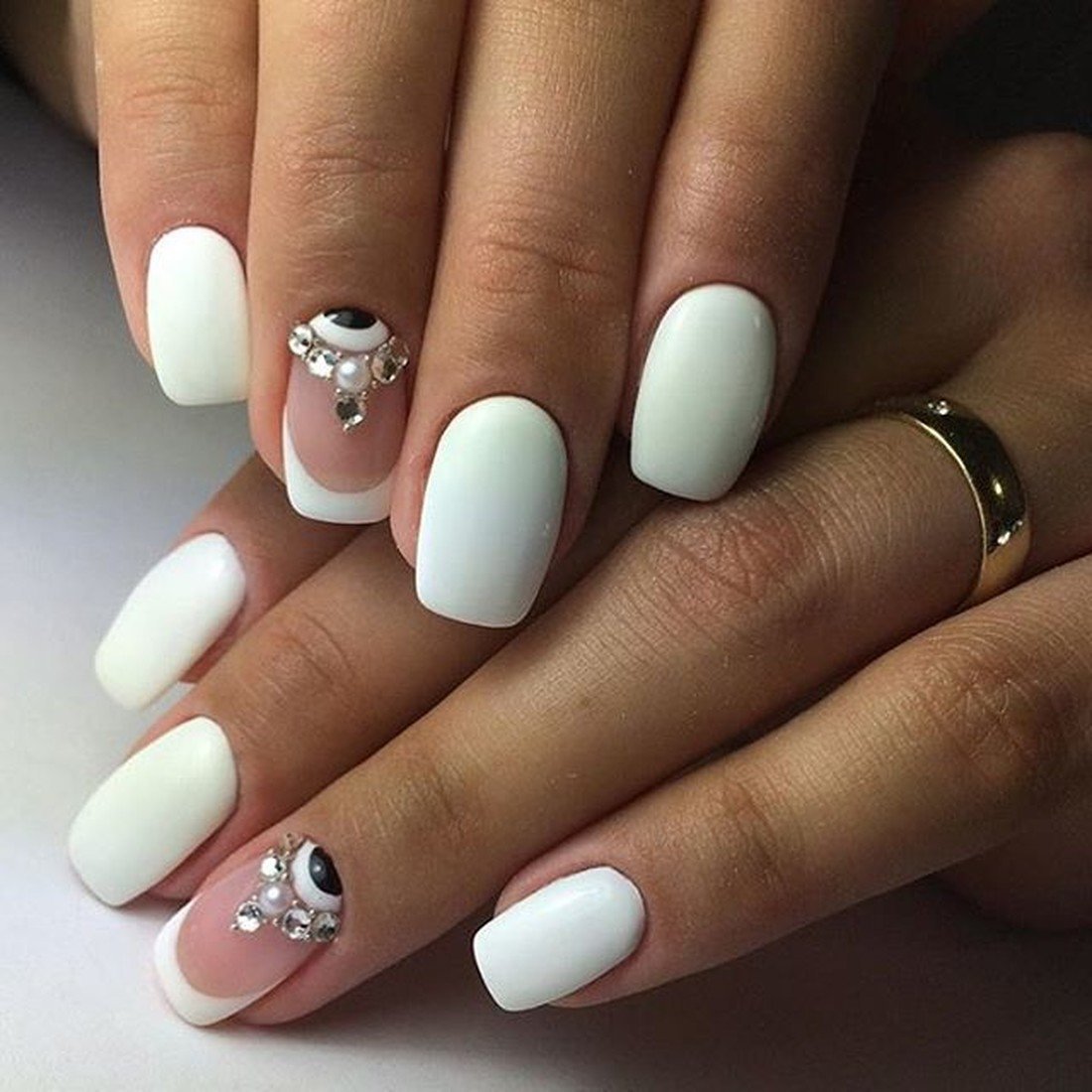 Еще один беспроигрышный вариант маникюра. Белый — это чистая база, на которой узор из камней смотрится свежо и интересно. И не стоит отдавать предпочтение только серебристым камням, выбирайте любой оттенок.