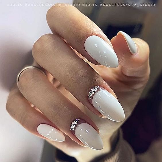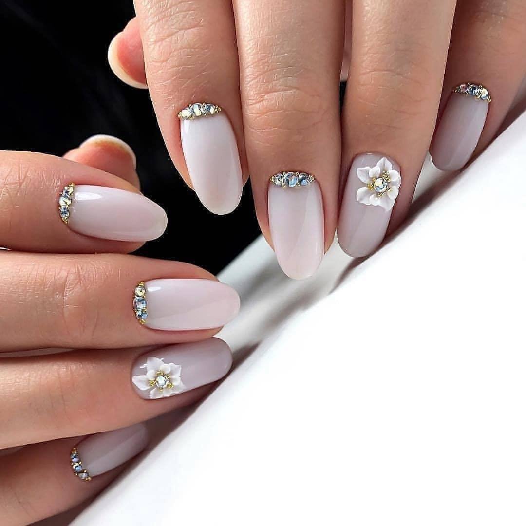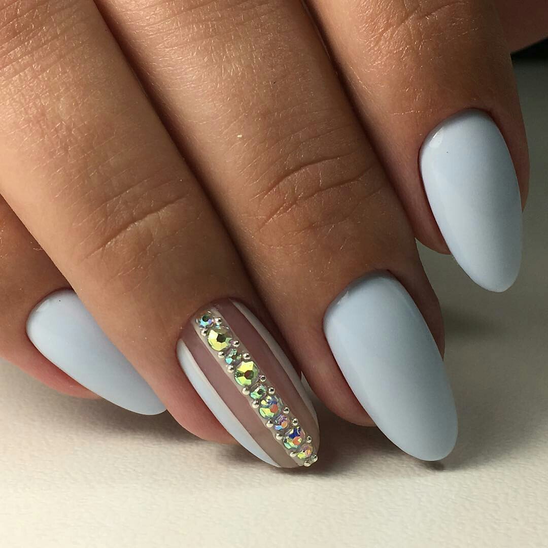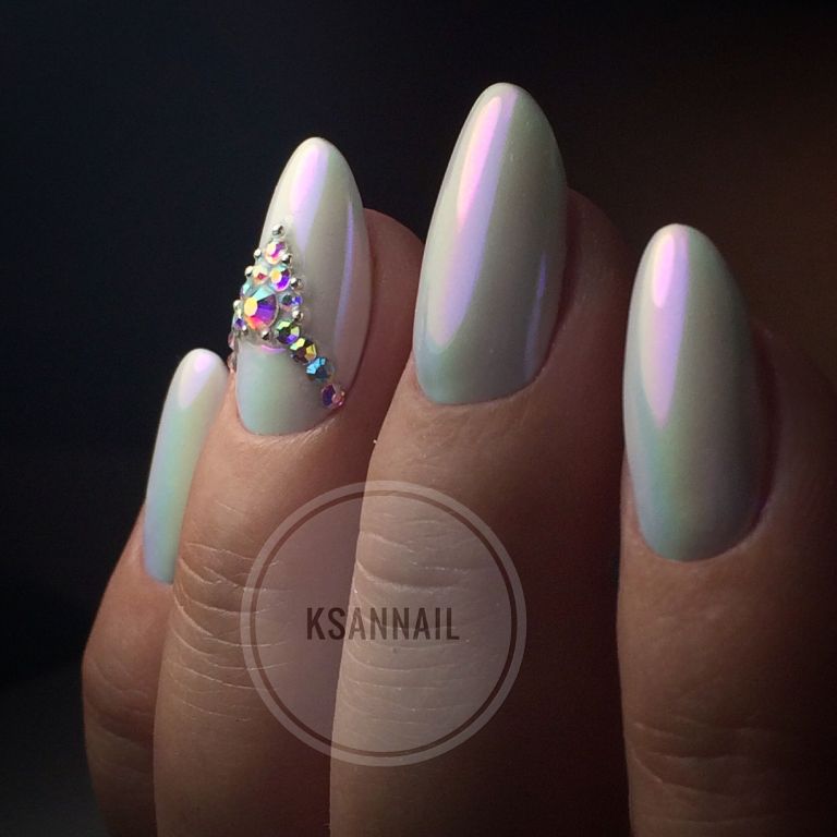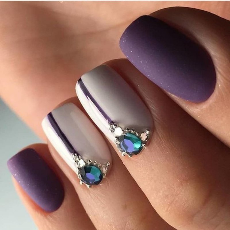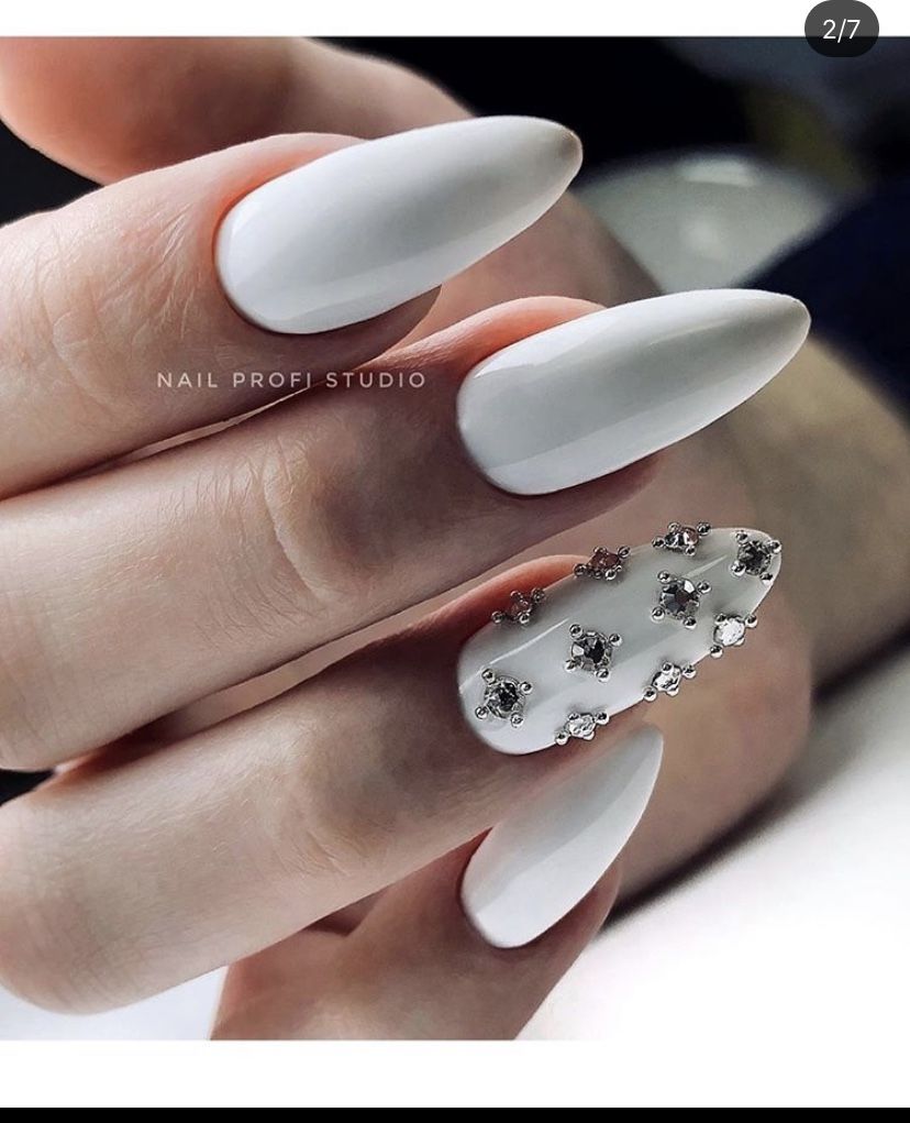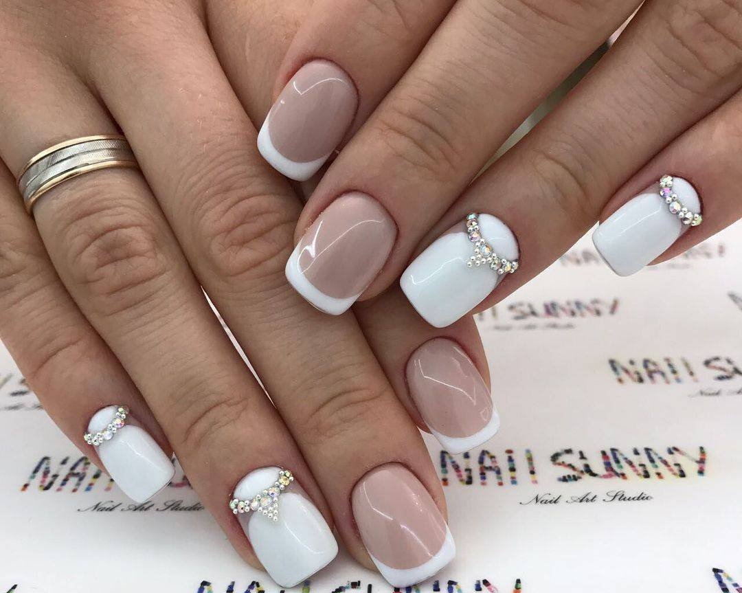 Еще один беспроигрышный вариант маникюра. Белый — это чистая база, на которой узор из камней смотрится свежо и интересно. И не стоит отдавать предпочтение только серебристым камням, выбирайте любой оттенок.