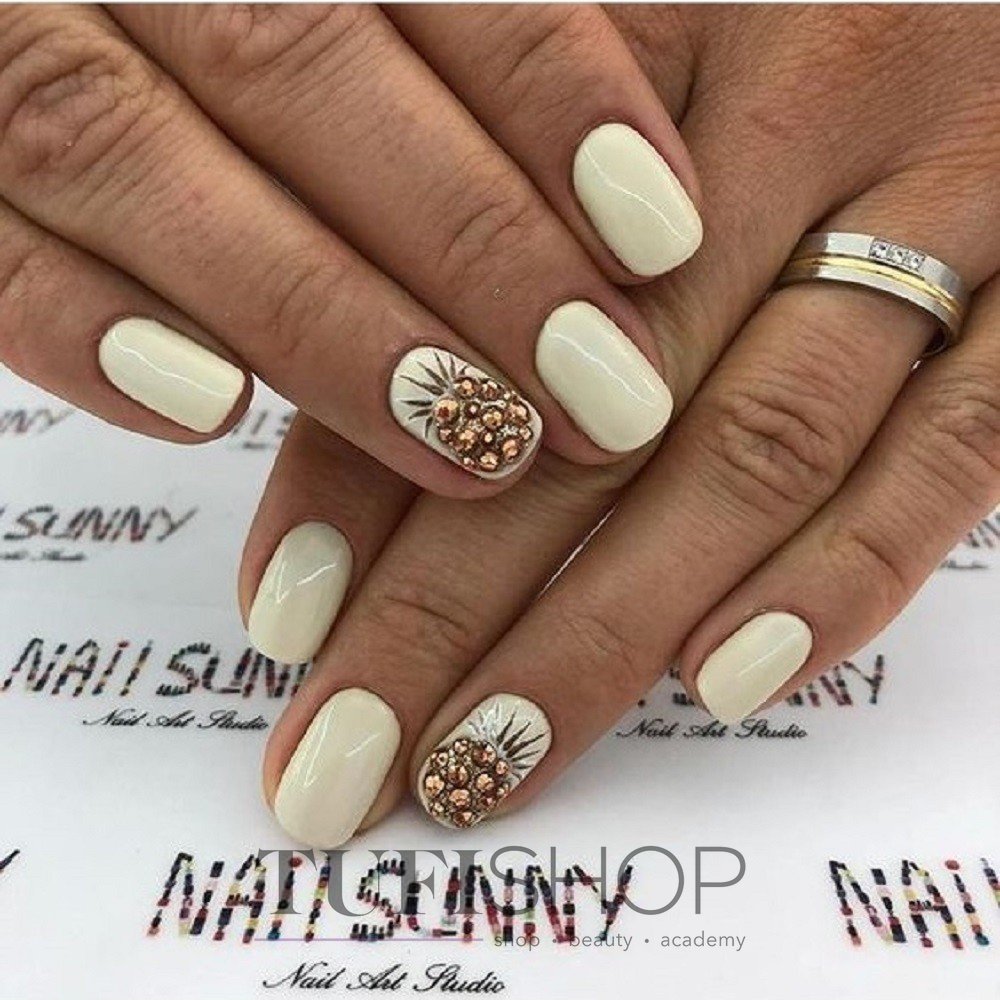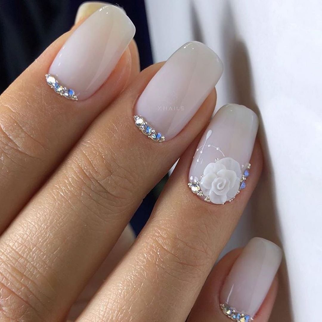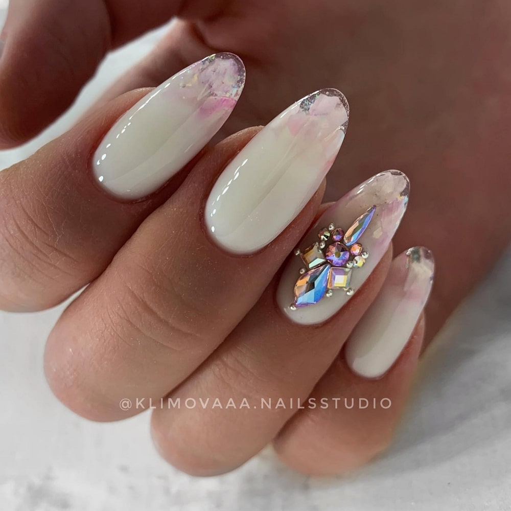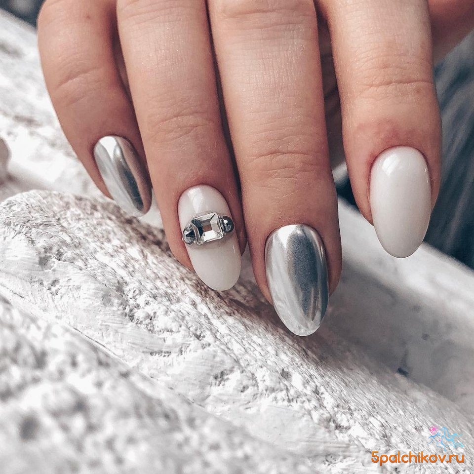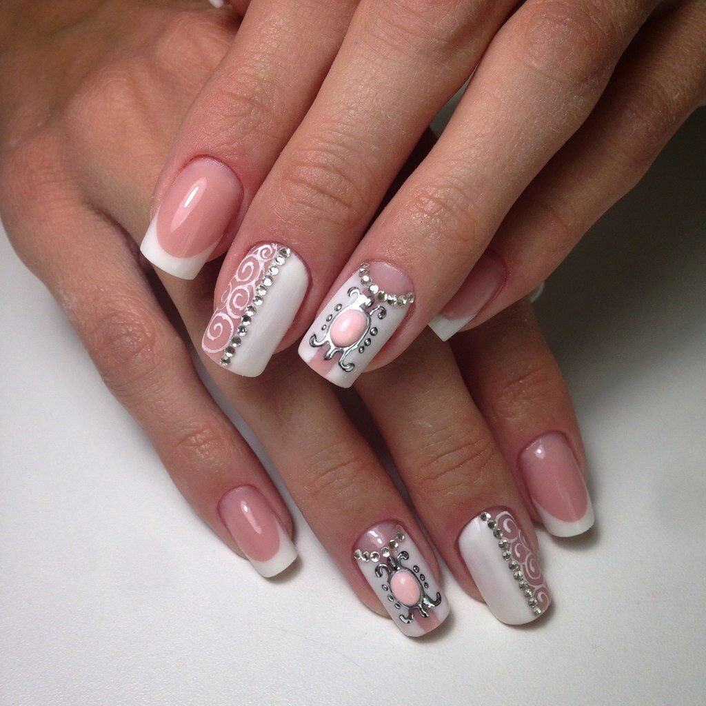 Еще один беспроигрышный вариант маникюра. Белый — это чистая база, на которой узор из камней смотрится свежо и интересно. И не стоит отдавать предпочтение только серебристым камням, выбирайте любой оттенок.