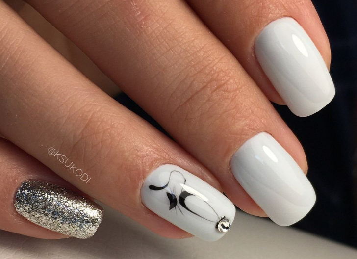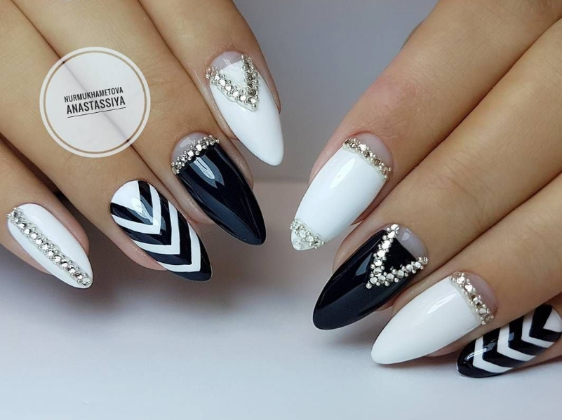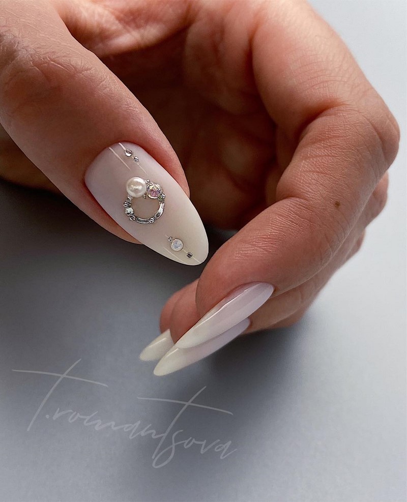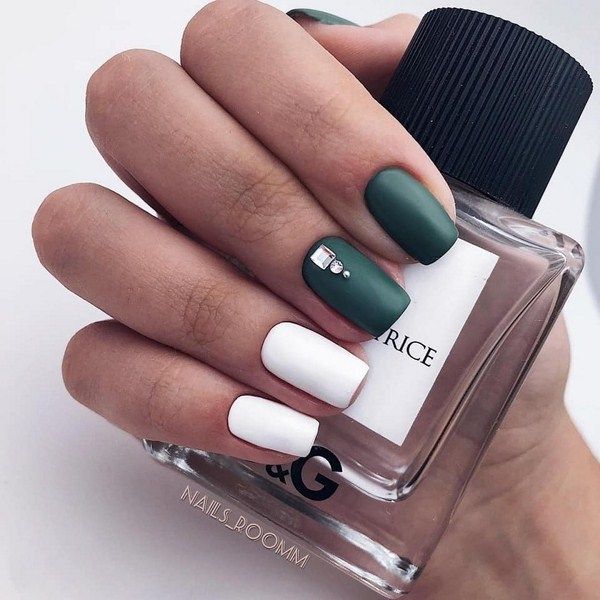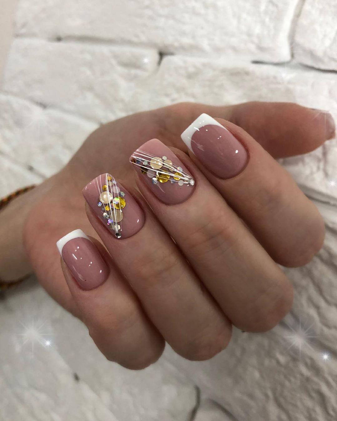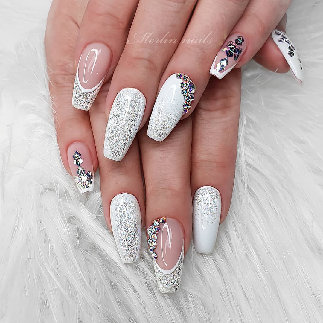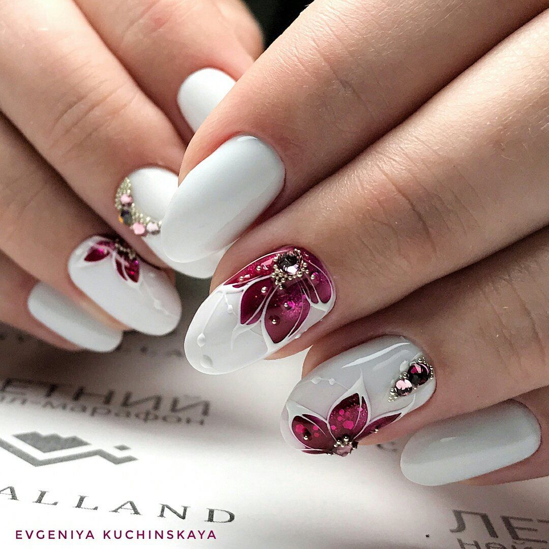 Еще один беспроигрышный вариант маникюра. Белый — это чистая база, на которой узор из камней смотрится свежо и интересно. И не стоит отдавать предпочтение только серебристым камням, выбирайте любой оттенок.