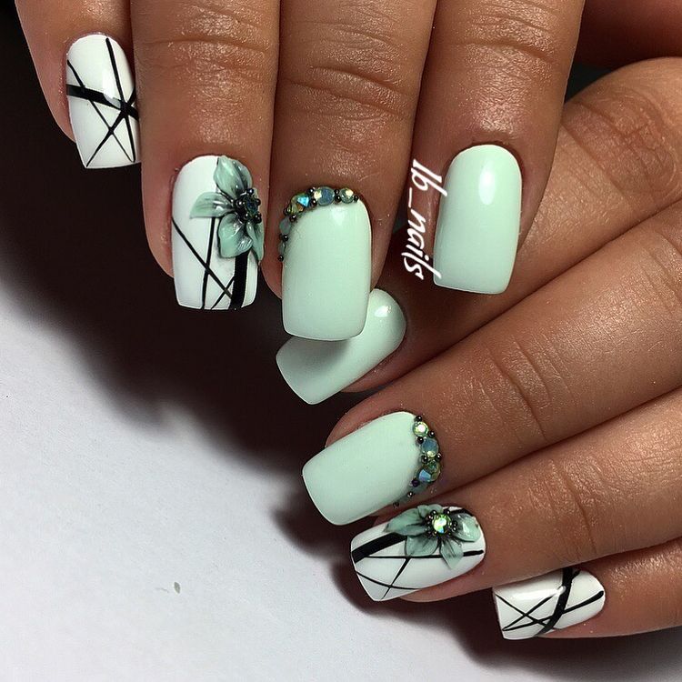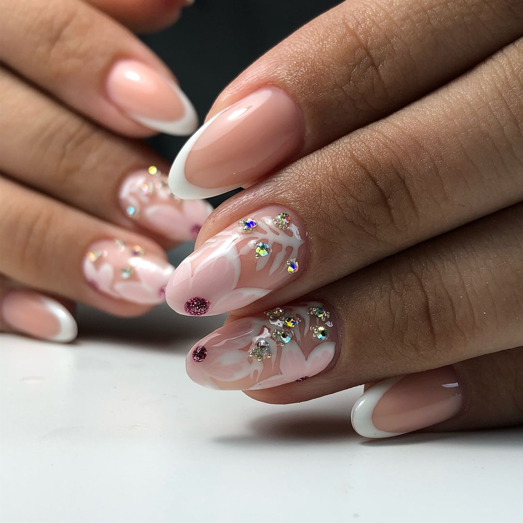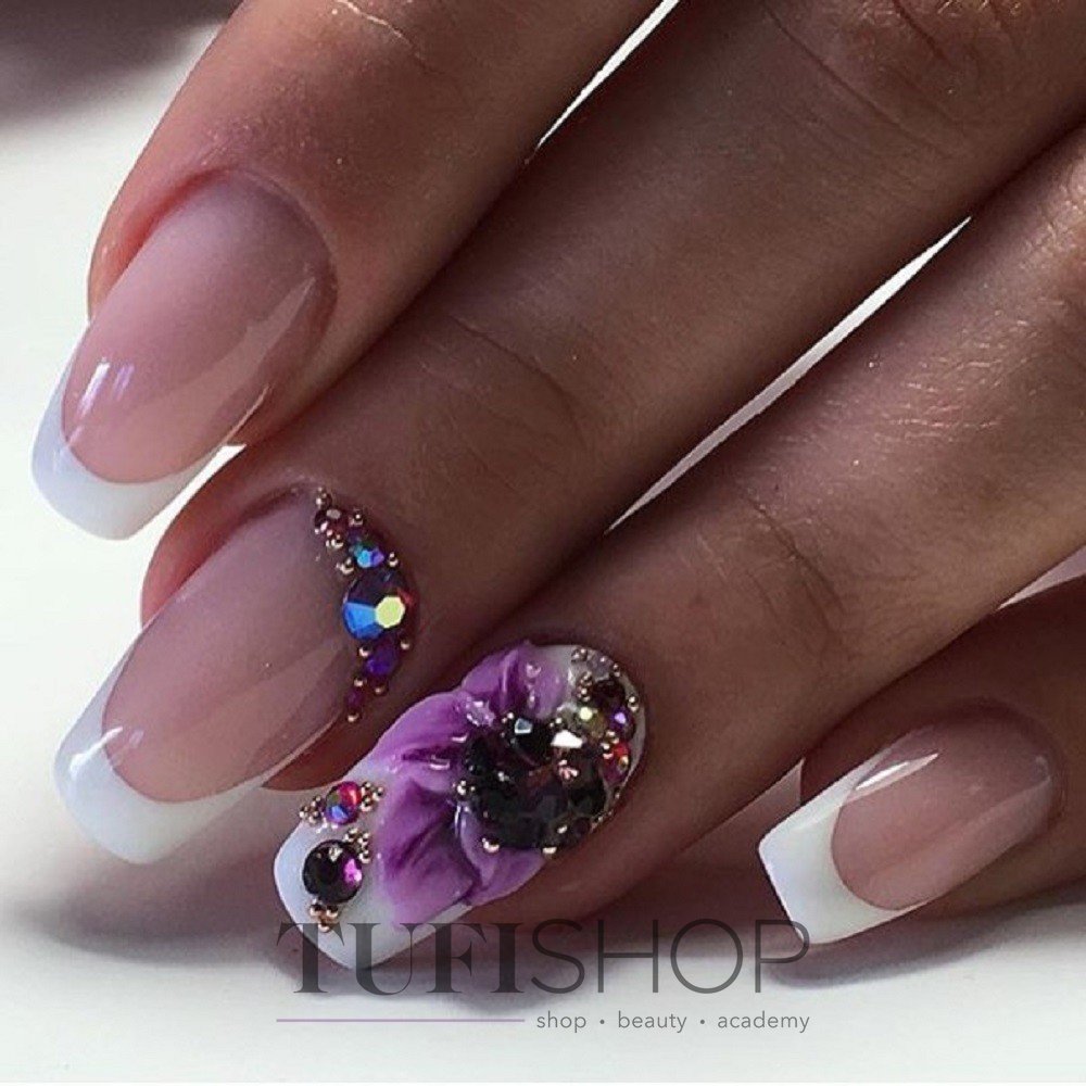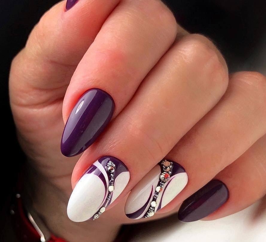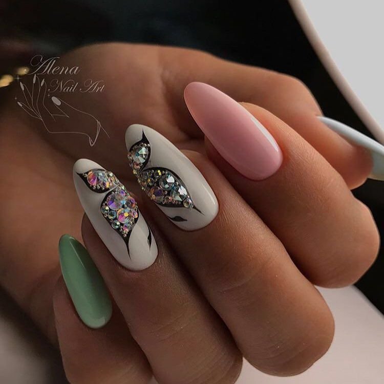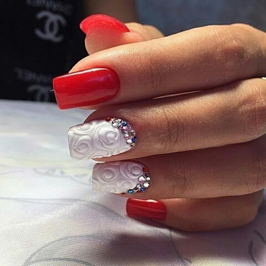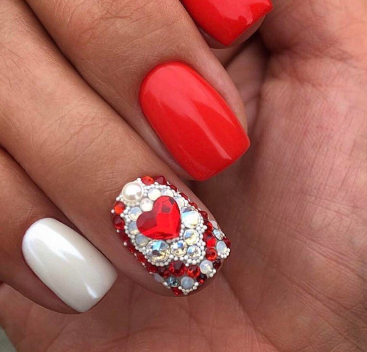 Еще один беспроигрышный вариант маникюра. Белый — это чистая база, на которой узор из камней смотрится свежо и интересно. И не стоит отдавать предпочтение только серебристым камням, выбирайте любой оттенок.